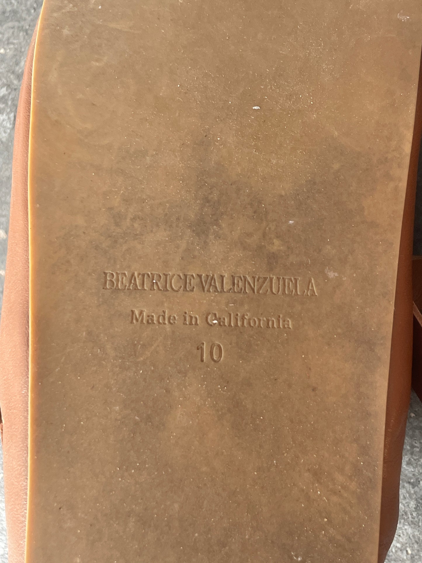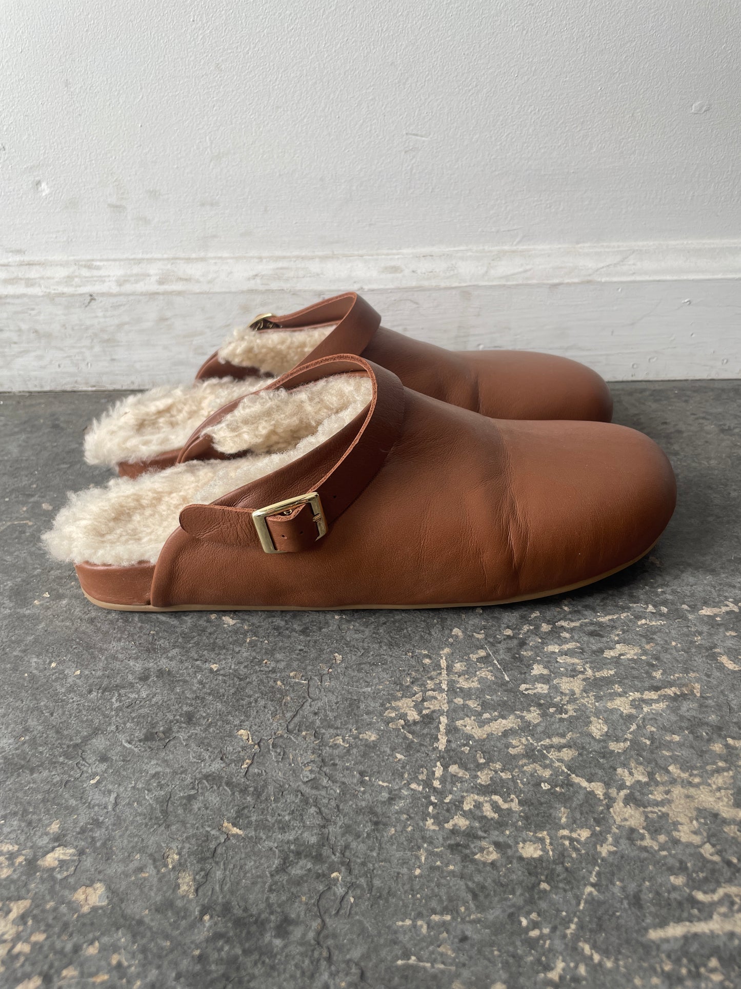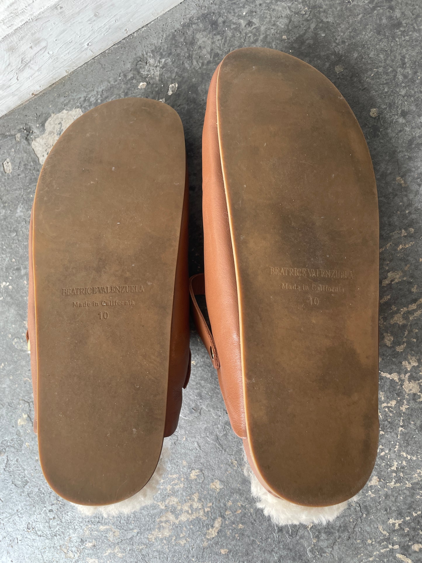 Beatrice Valenzuela Brown Shearling Slip-On Clogs. A cute pair of fluffy shearling clogs. Features a beautiful brown leather exterior with buckle. Shearling is also in good condition. Size 10. Made in California.