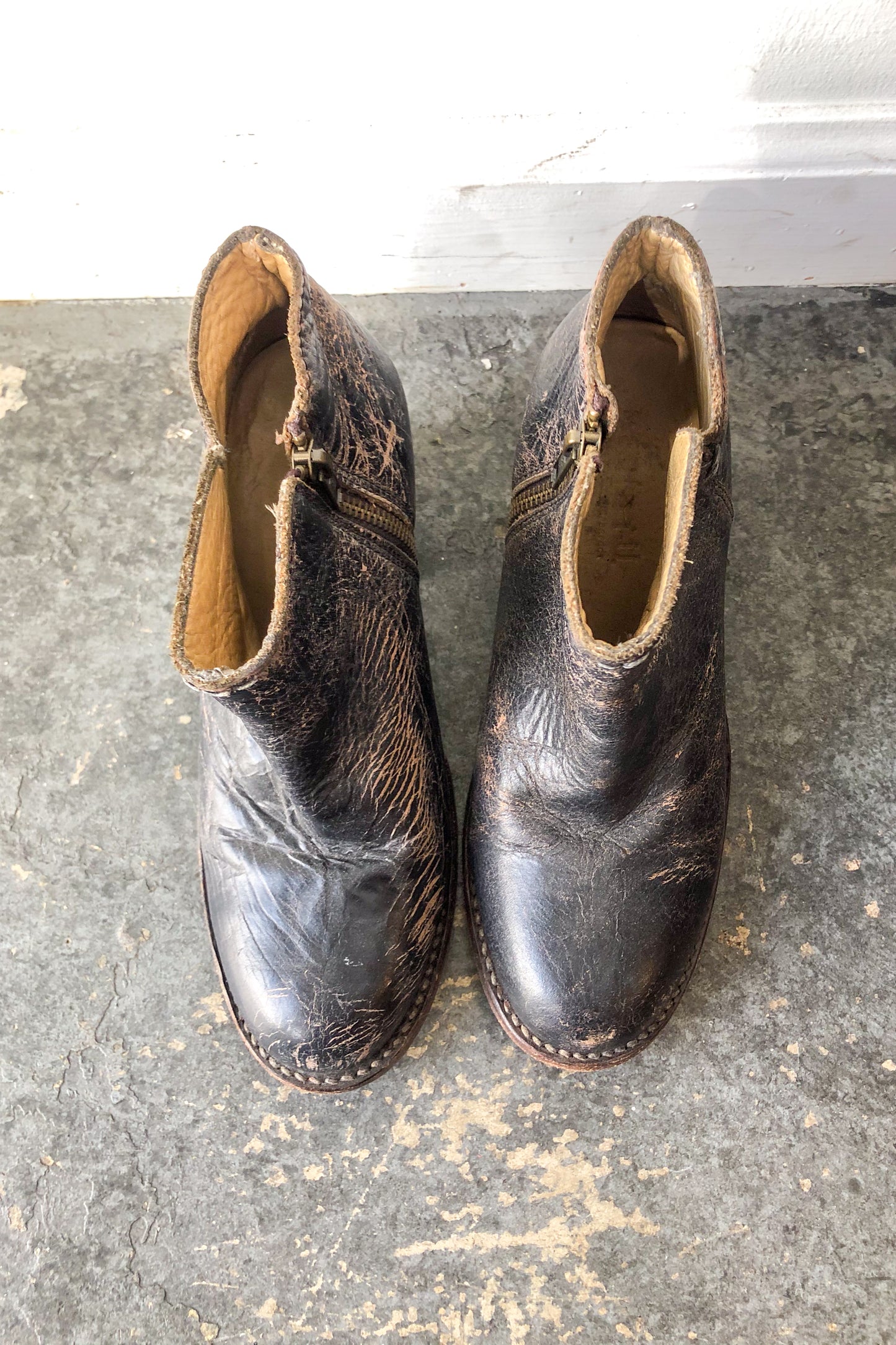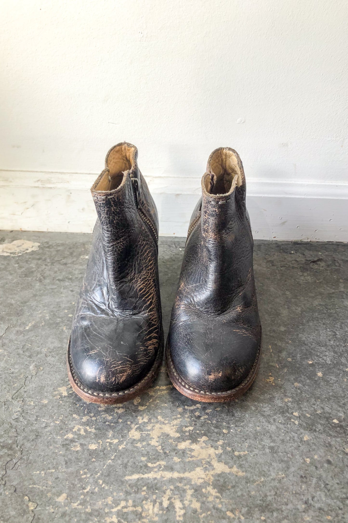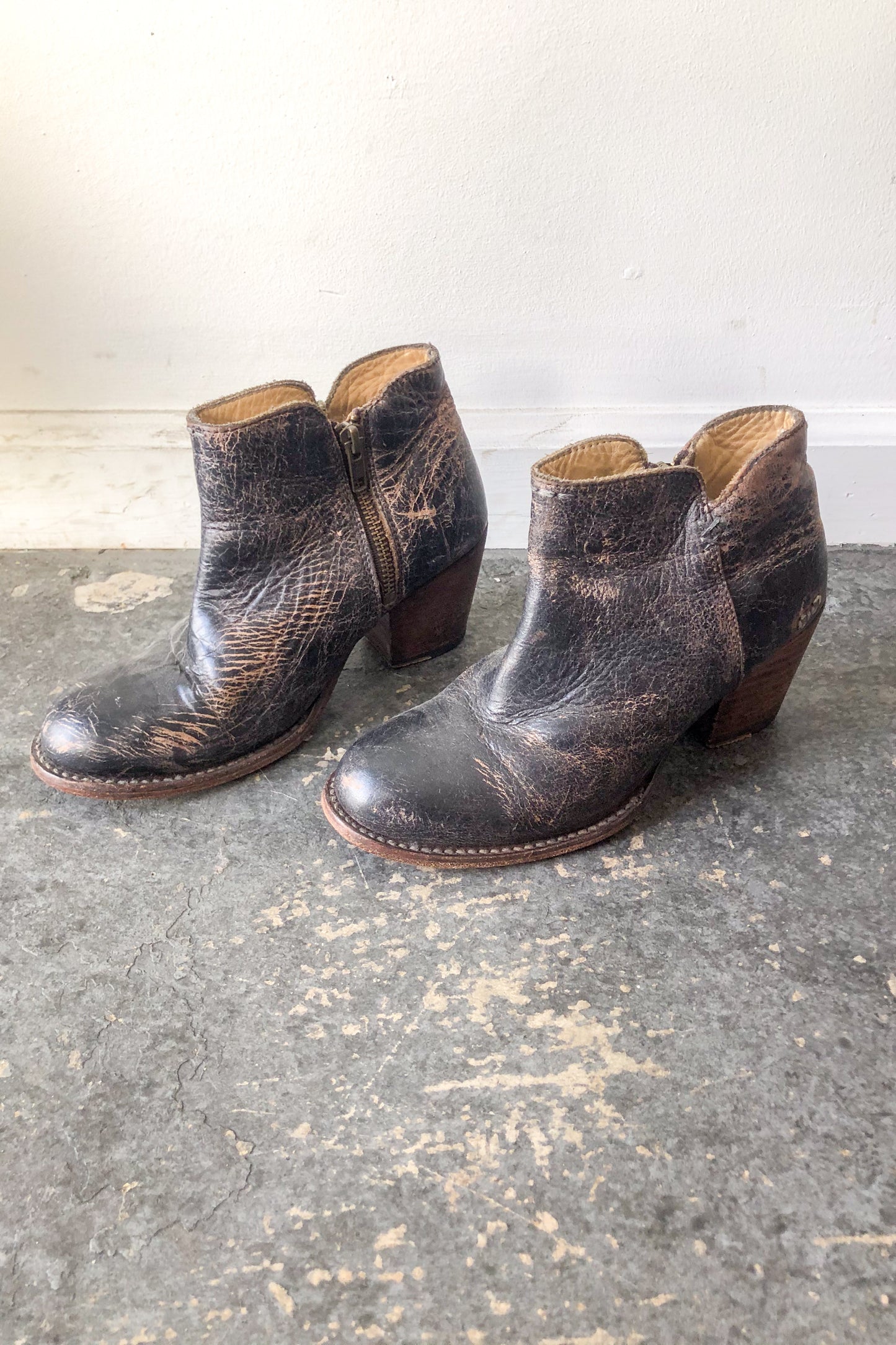 Bed Stu Black Crackle Ankle Boots. Good condition, has some wear at the bottoms. Round toe ankle boots in black/brown crackle distressed look. Leather. Marked as size 6 1/2.