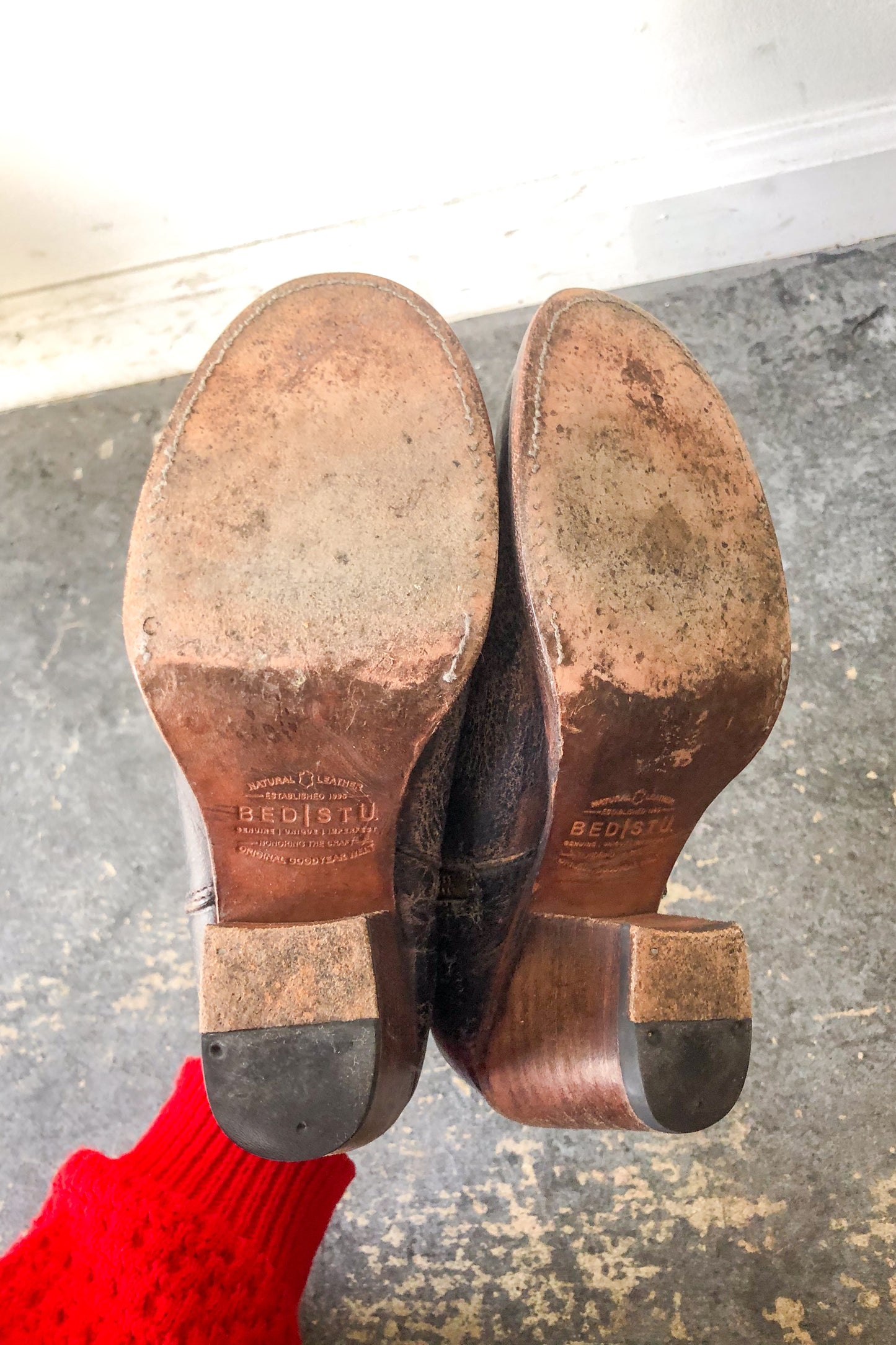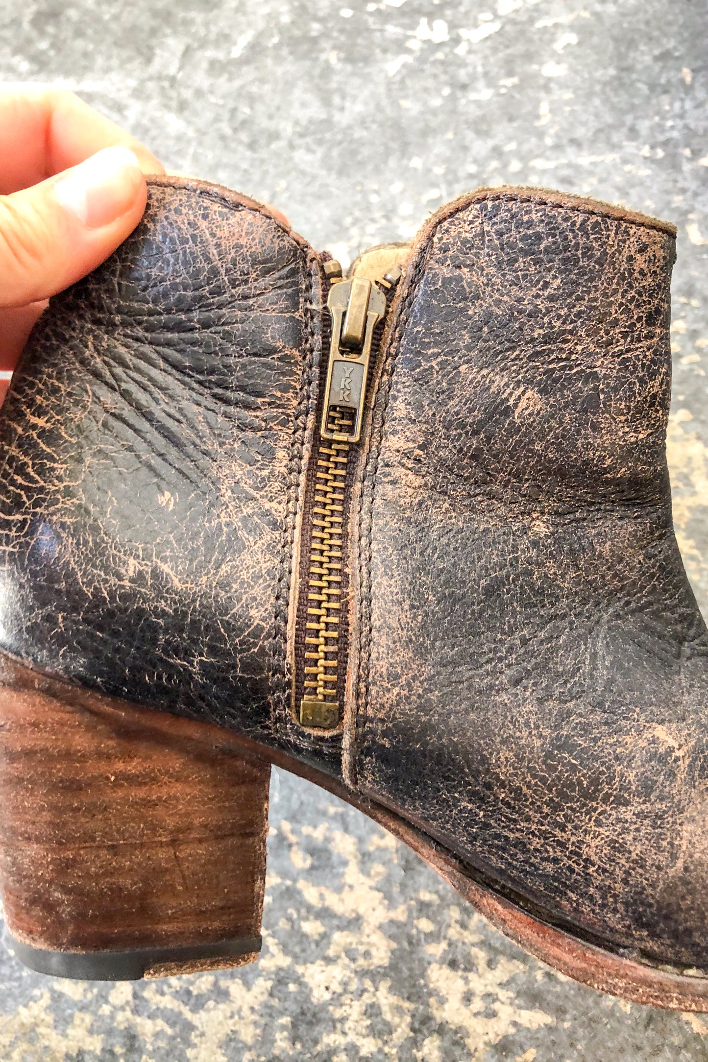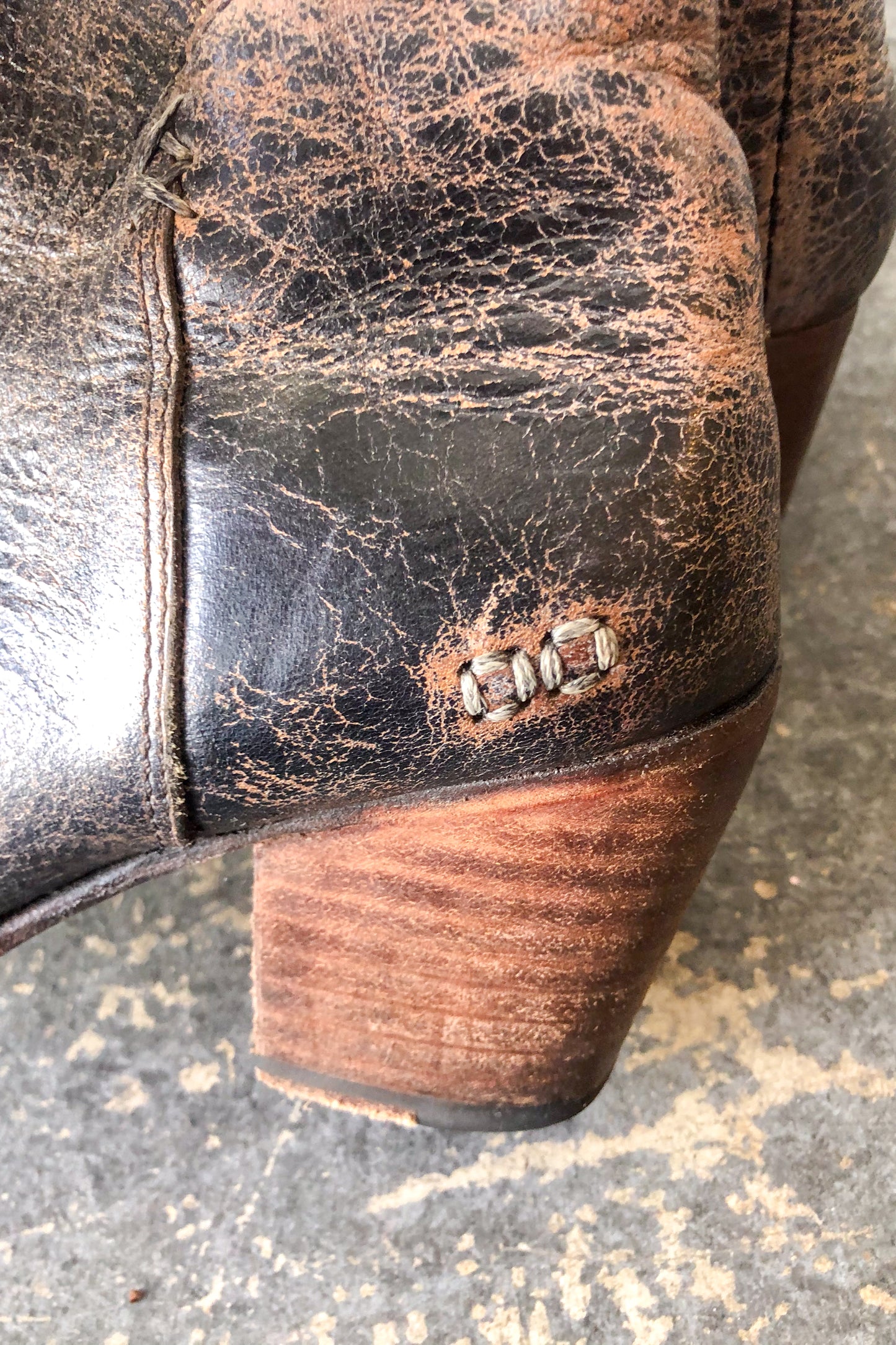 Bed Stu Black Crackle Ankle Boots. Good condition, has some wear at the bottoms. Round toe ankle boots in black/brown crackle distressed look. Leather. Marked as size 6 1/2.