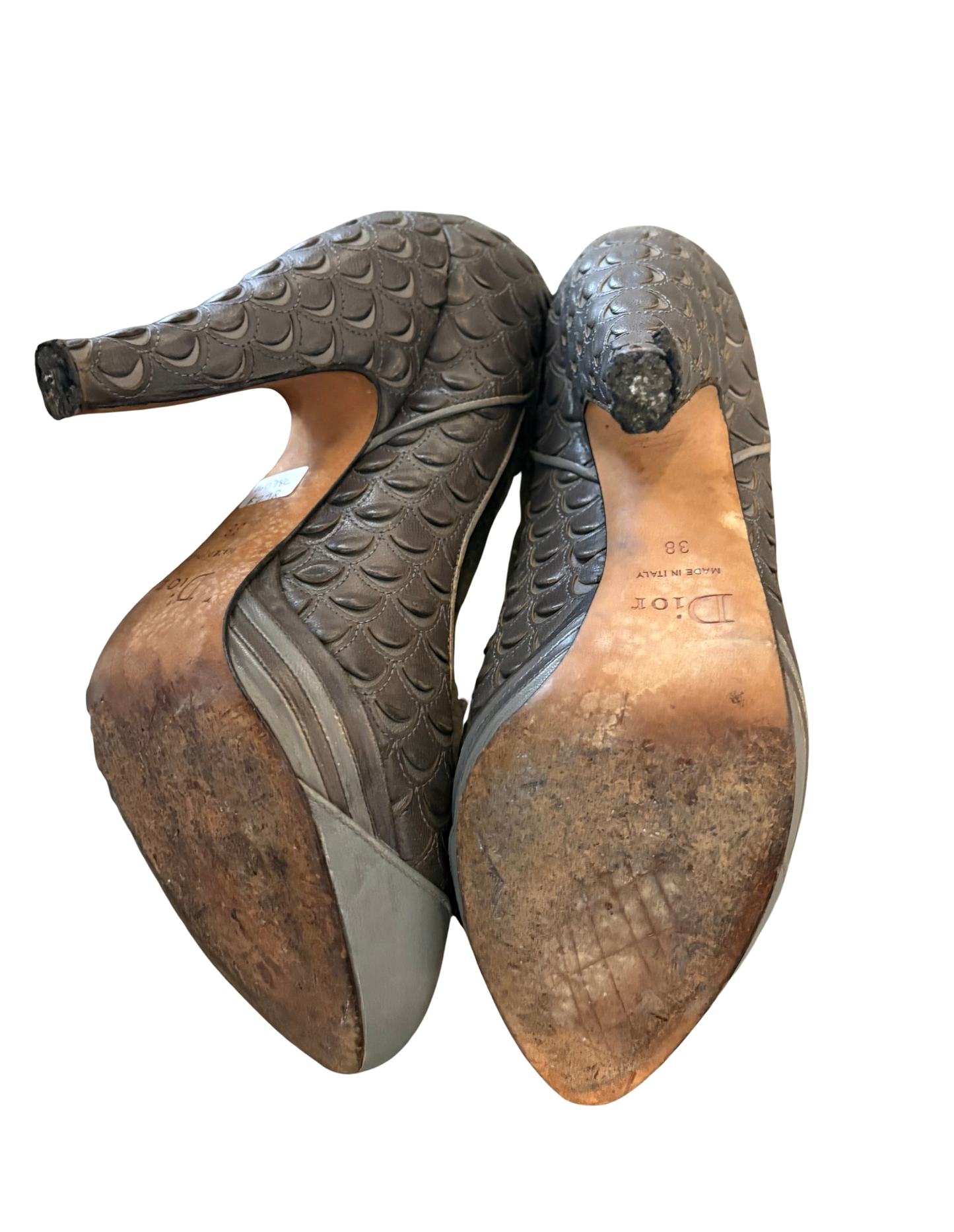 Slip into these Christian Dior grey leather pumps with leather animal print toe cap and high heel, designed for They bring a playful yet sophisticated vibe to your look, perfect for turning heads and stepping out in style.
