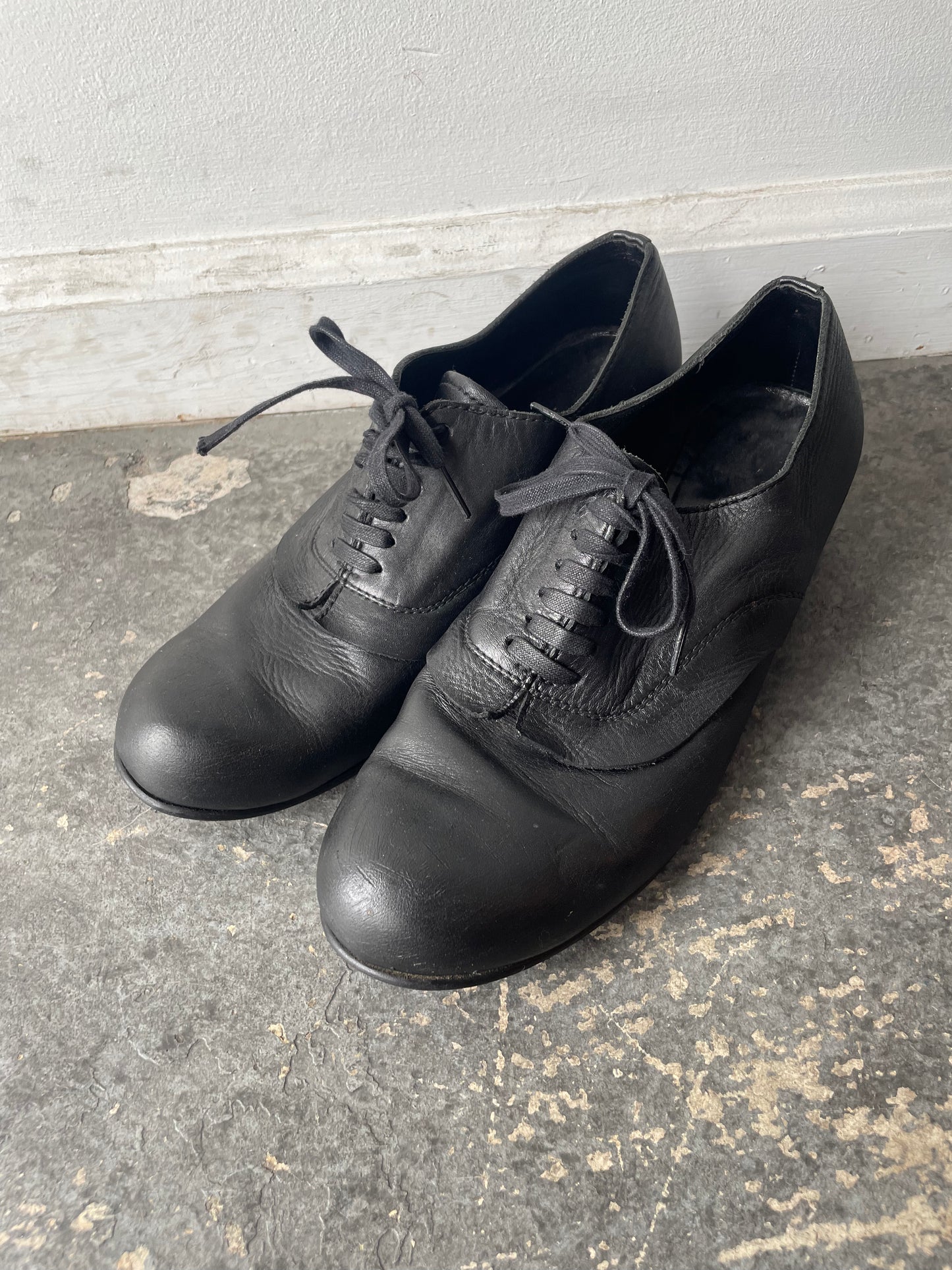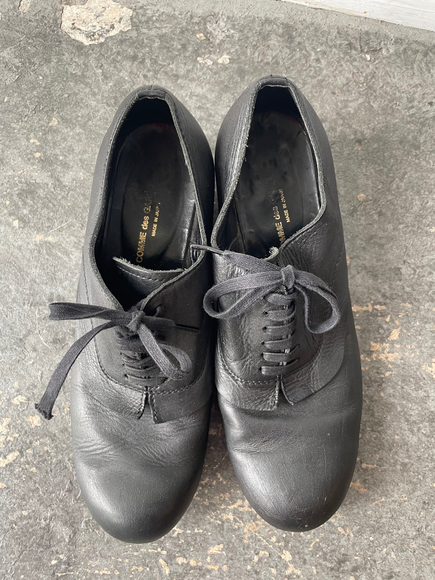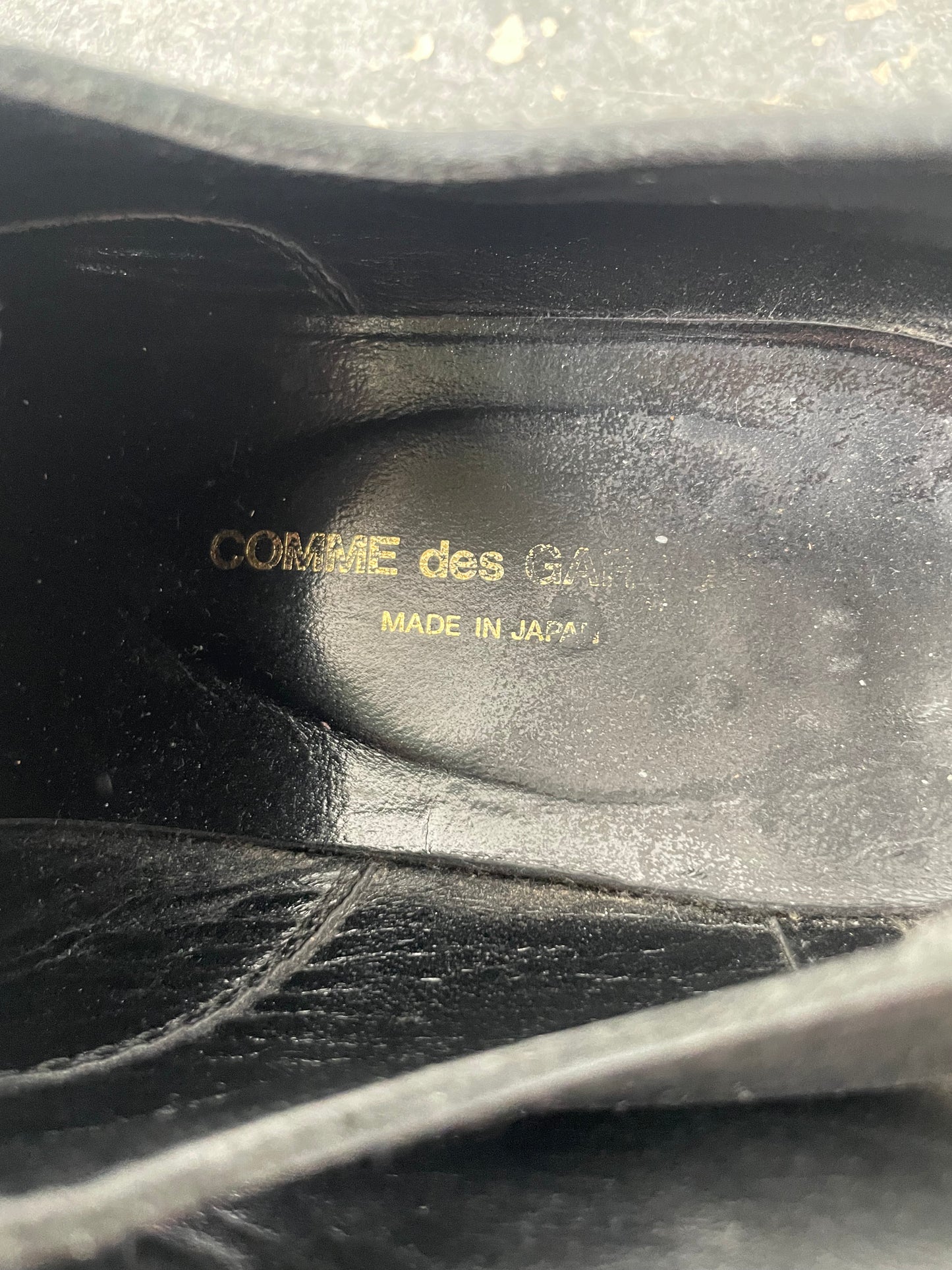 Comme des Garcon Black Leather Clown Shoes. A whimsical take on the black leather brogue featuring the Comme des Garcons iconic raw edge. Ever so slightly bulbous at the toe, just enough to evoke clown-fun. Made in Japan. Size 24.5cm equivalent to US 8 or 9.