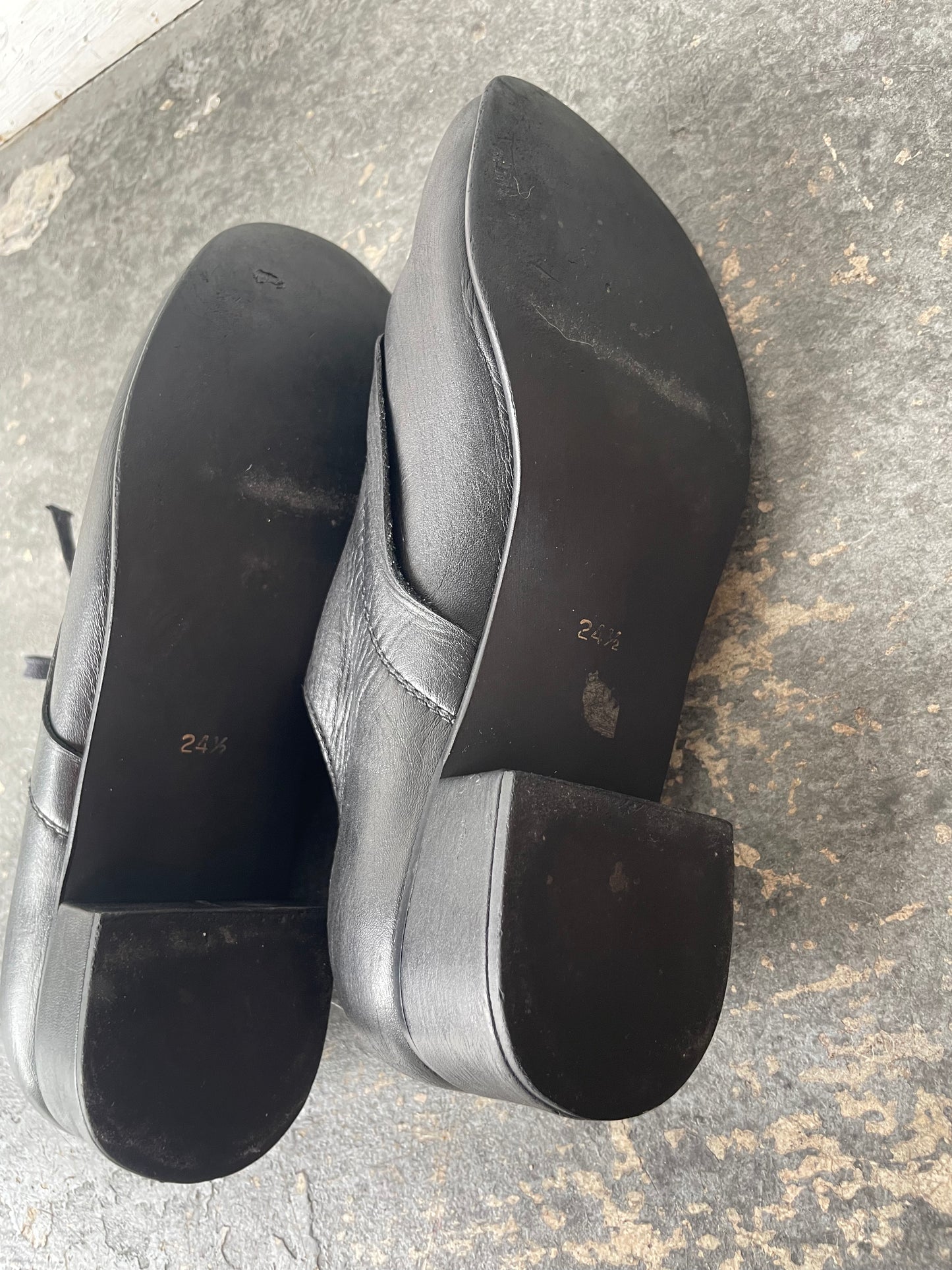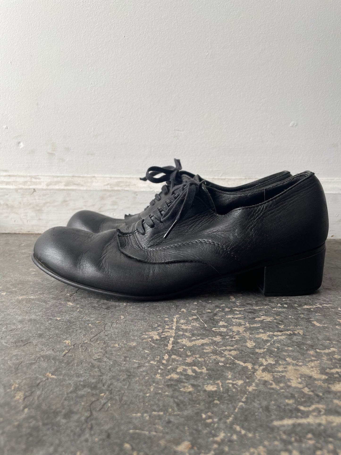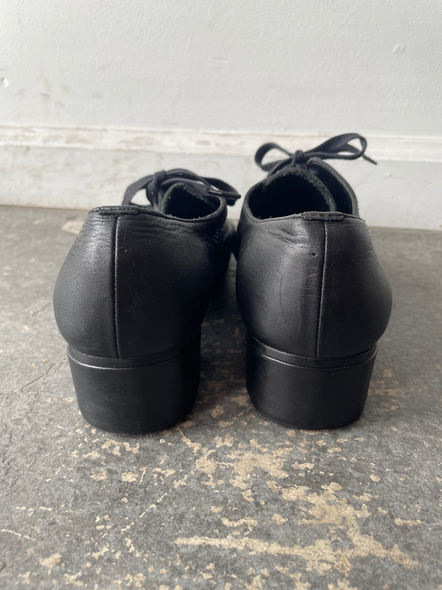Comme des Garcon Black Leather Clown Shoes. A whimsical take on the black leather brogue featuring the Comme des Garcons iconic raw edge. Ever so slightly bulbous at the toe, just enough to evoke clown-fun. Made in Japan. Size 24.5cm equivalent to US 8 or 9.