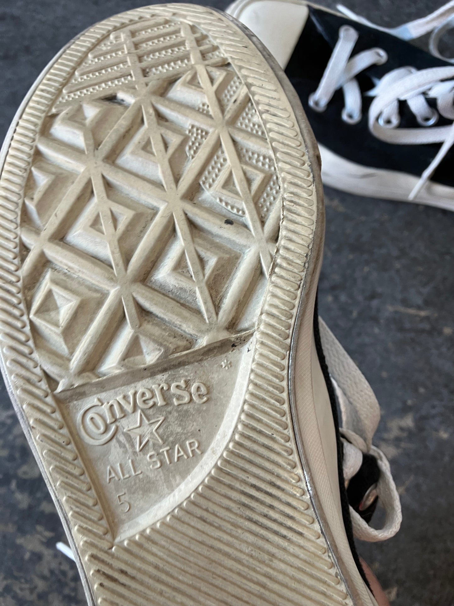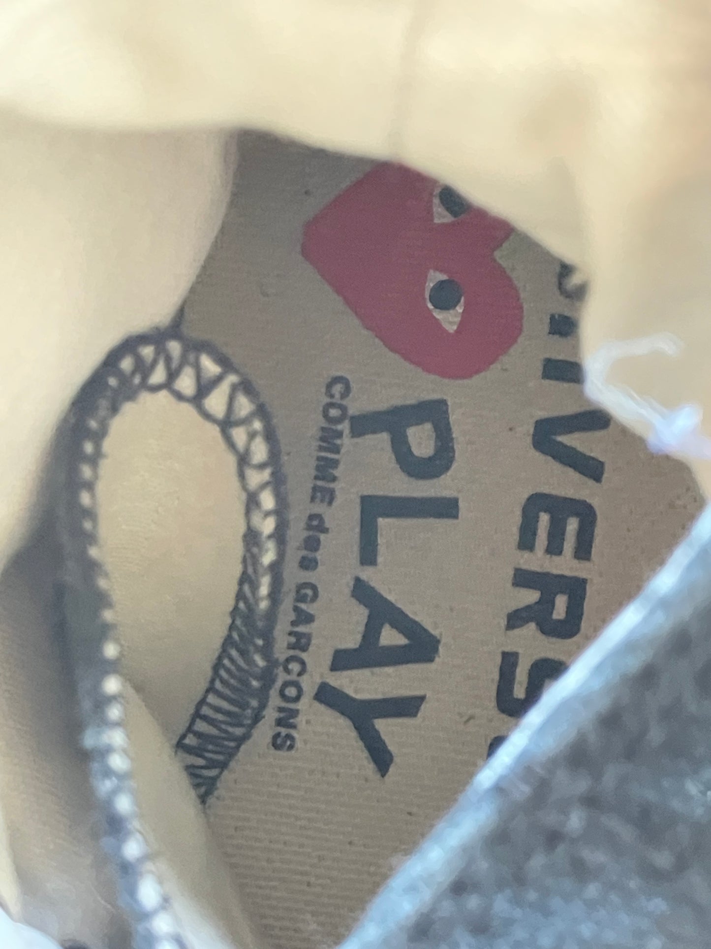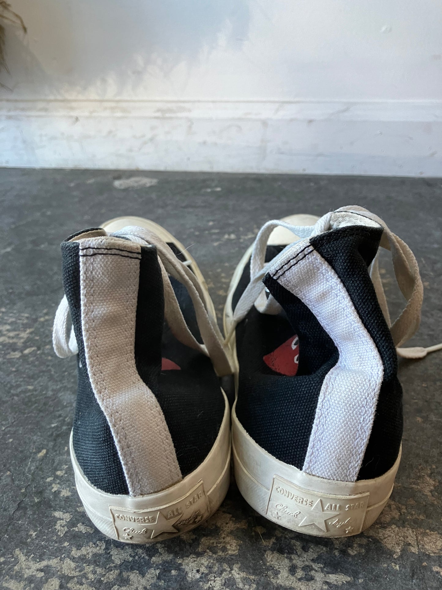 Comme des Garcons Play Black Converse High Tops. What a cute collab! Converse All-Star lace ups with heart & eyes graphic. Great condition, displaying wear. Please see images. Sold as is. Size 6.