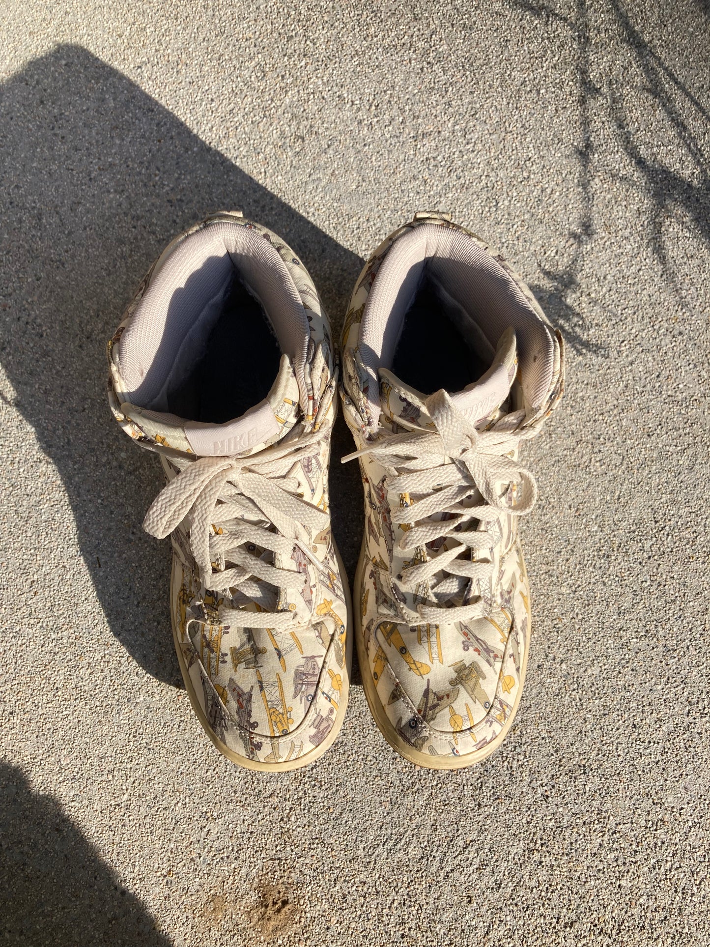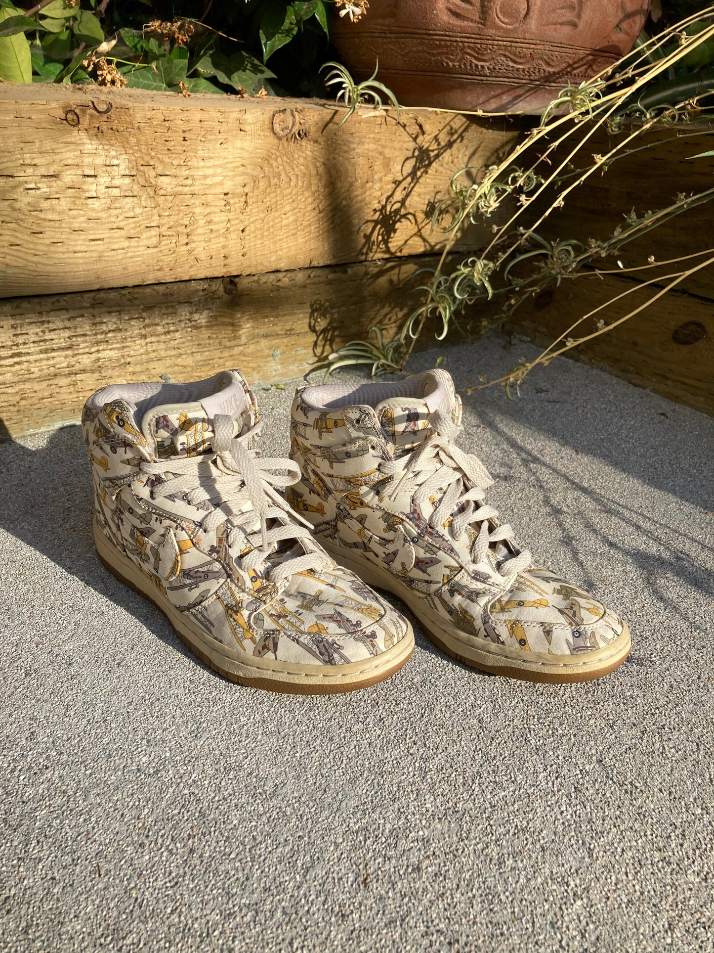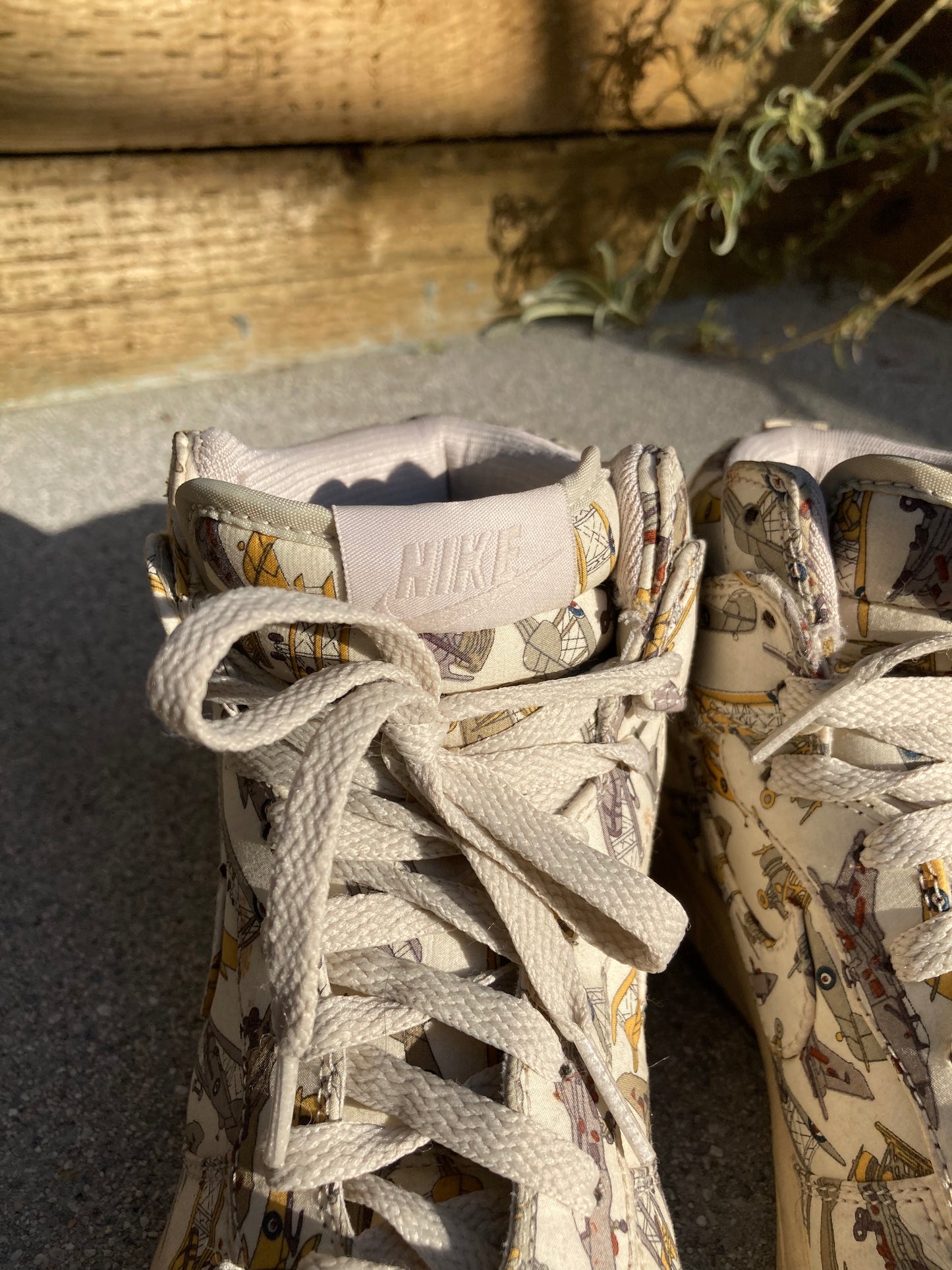 Vintage White with Airplanes Nike High Tops. US size 7, UK size 4.5, EUR size 38. In excellent vintage condition. Approximately 10 inches from heel to toe.