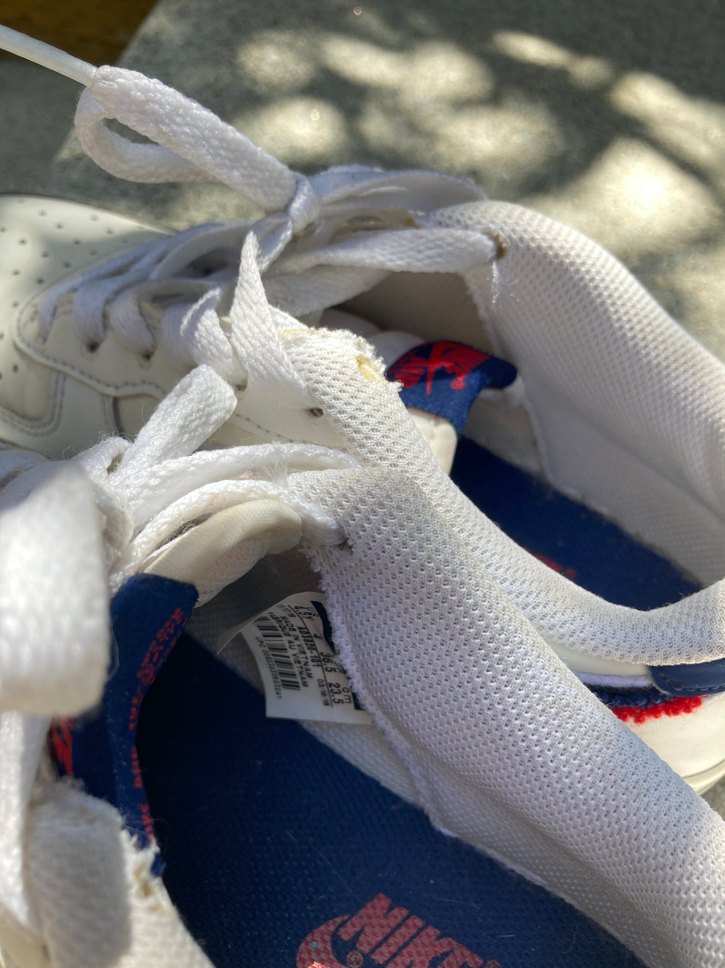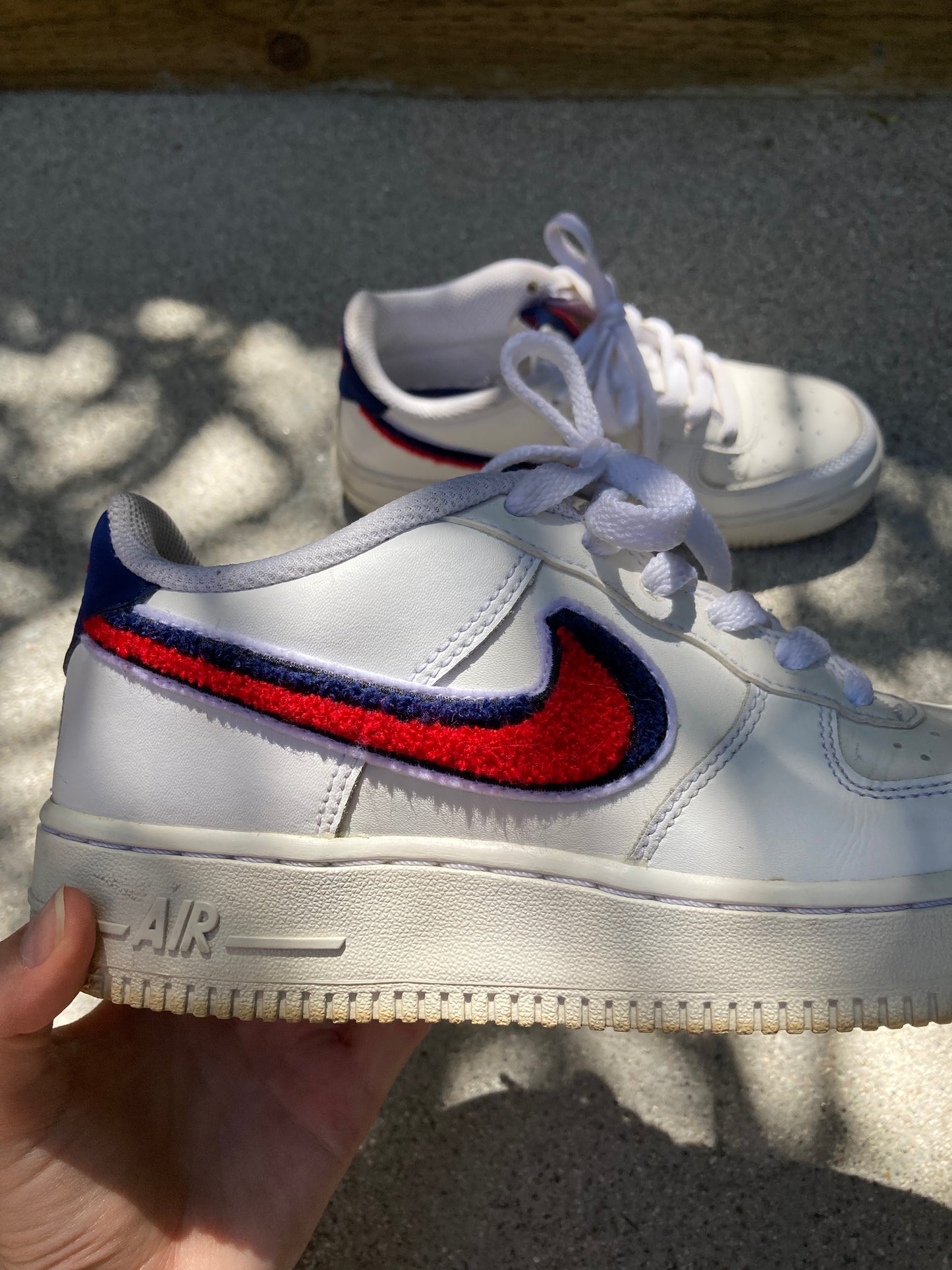 White Nike Air Force 1 with Red and Blue "Chenille Swoosh" size 6.5 Women's