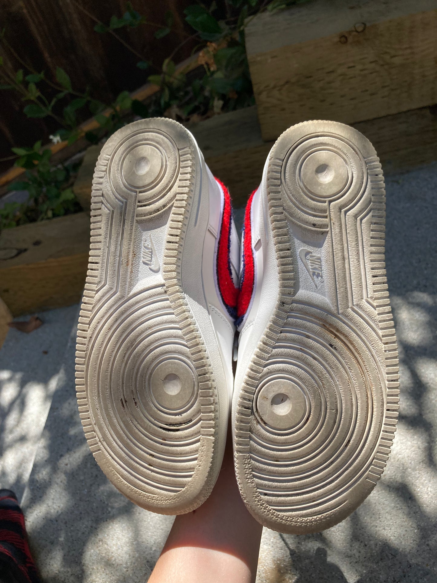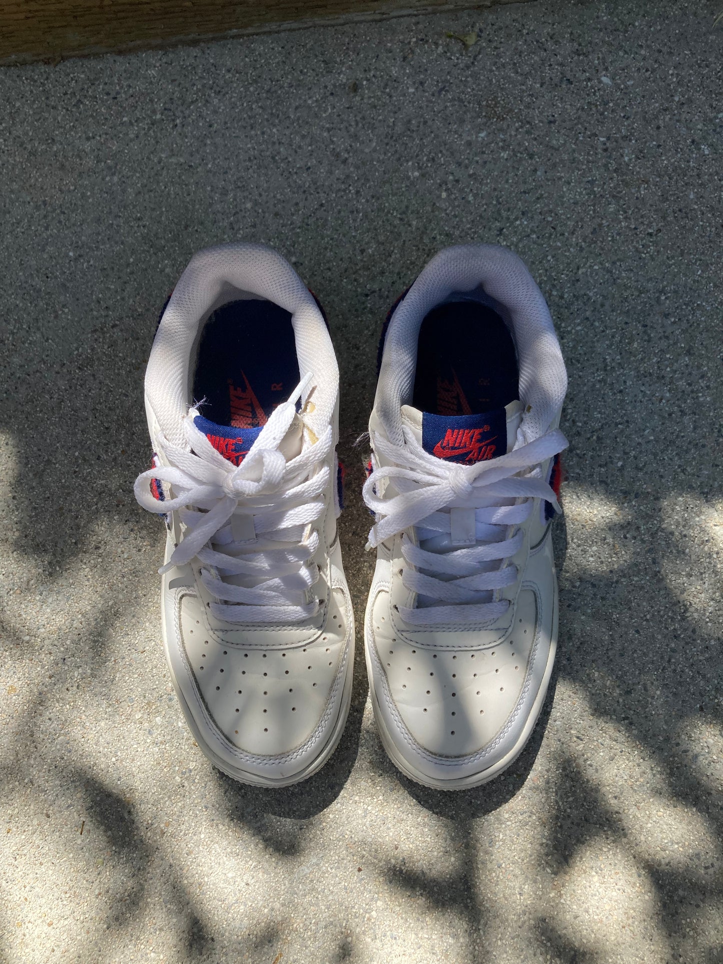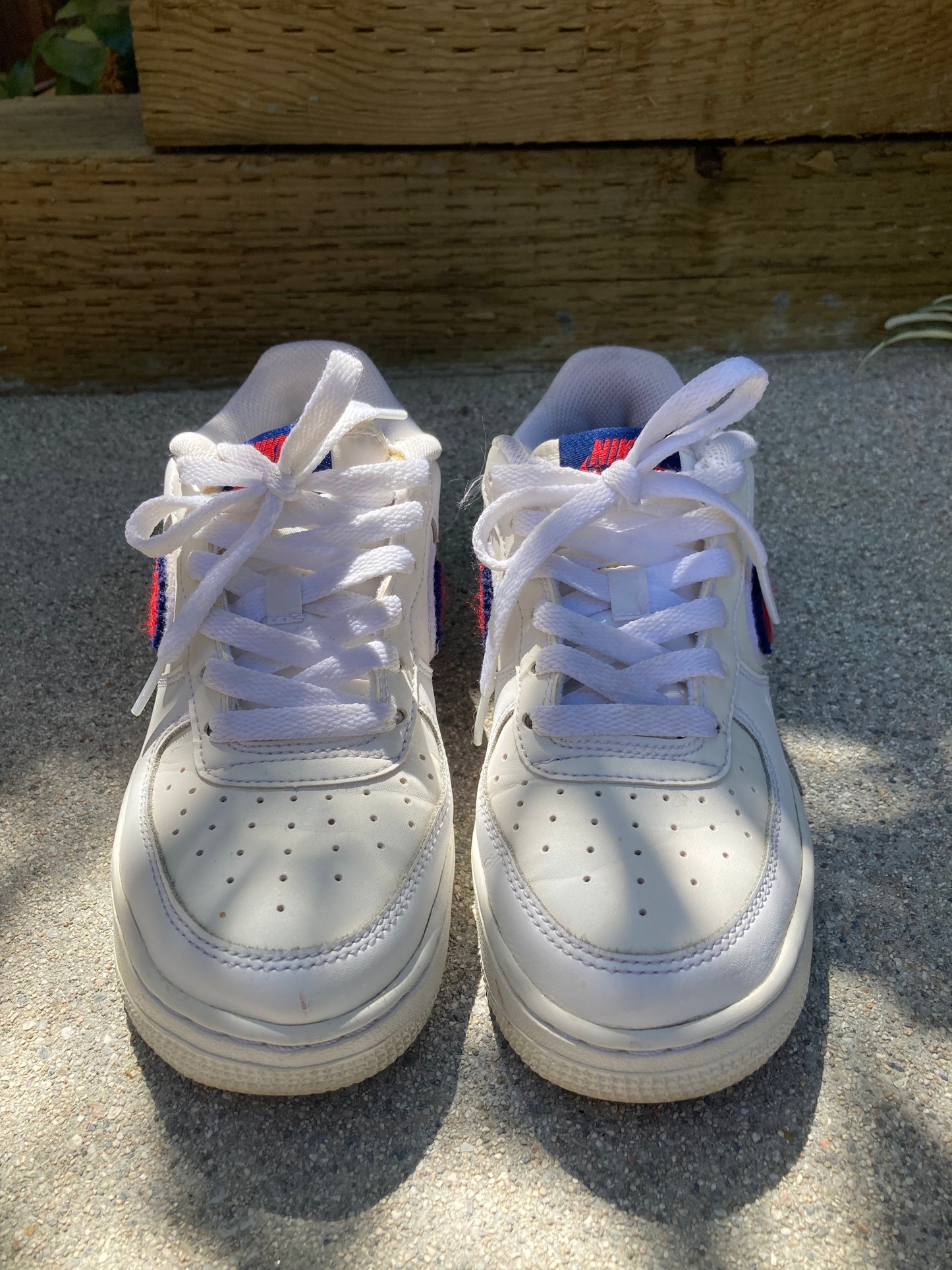 White Nike Air Force 1 with Red and Blue "Chenille Swoosh" size 4.5Y/6/5 women's. In excellent used condition. US size 4.5Y, UK 4, EUR 36.5. Fits US 6.5 or 7. Approximately 10 inches from heel to toe.