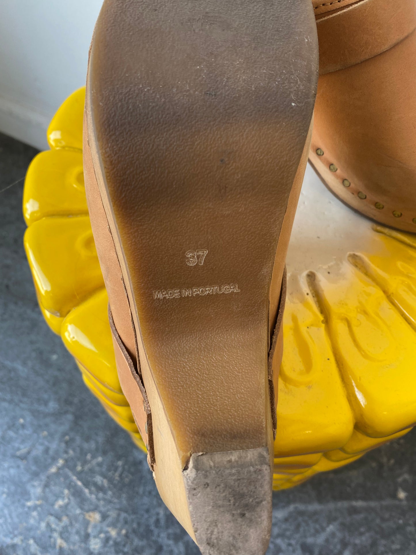 Isabel Marant Tan Clogs! Bronze studs along the edges. Rounded toe and wedge heel. Made in Portugal. Size 37. In overall good condition with some signs of wear along the sole and toe.