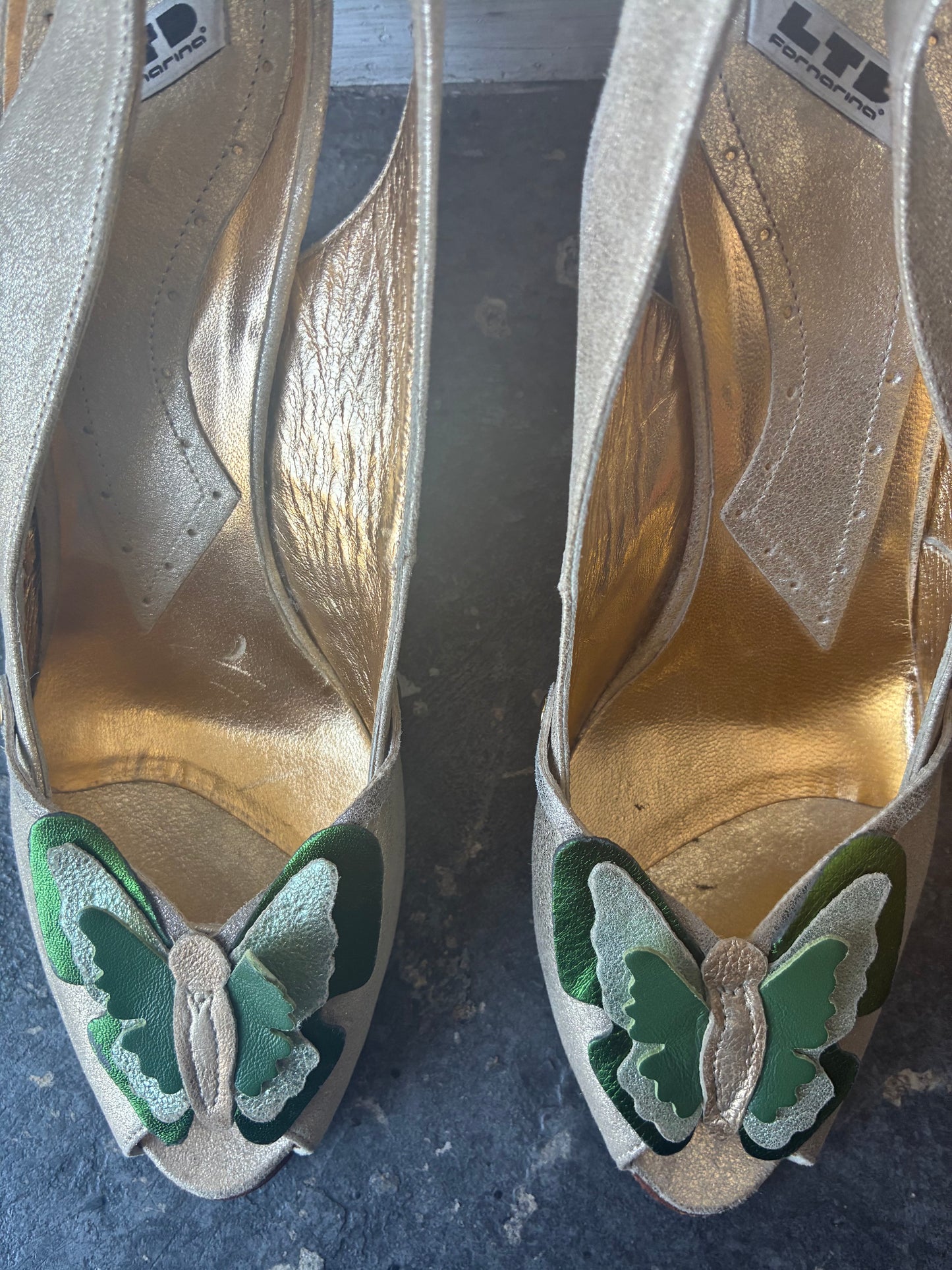 Ltd. Fornarina Butterfly Gold Wedges Size 37. Delightfully whimsical but still sophisticated and stylish, the lightly metallic gold leather wedges feature a 3D green and gold butterfly appliquè and a Deco waved stripe wedge sole. Stunning! Shoes are in excellent pre-loved condition, showing very minor signs of wear. No notable defects.