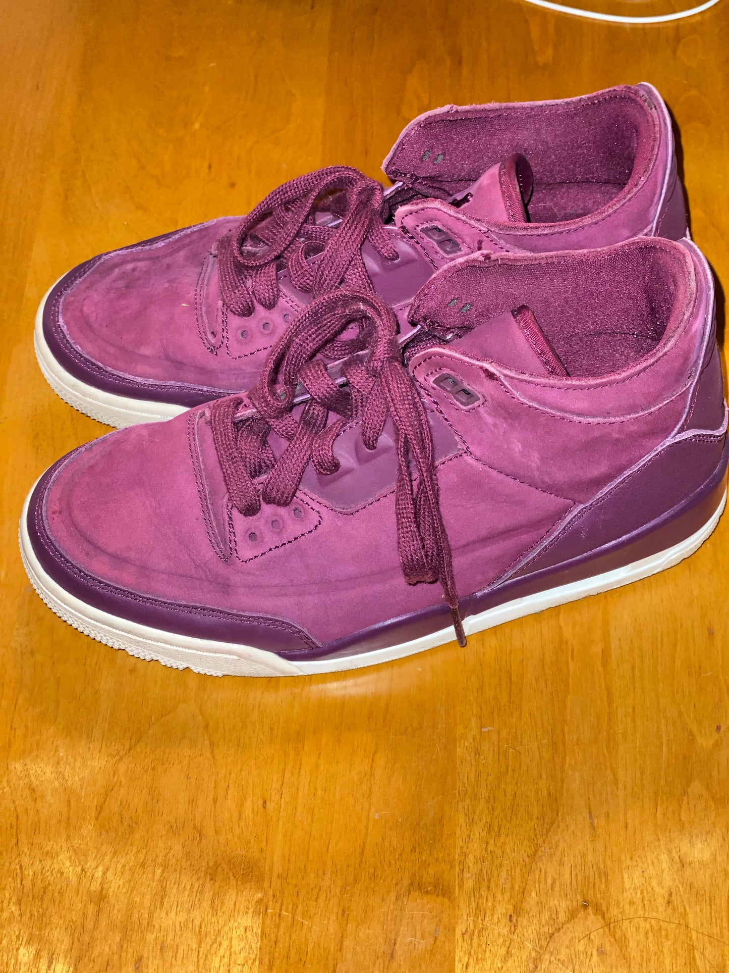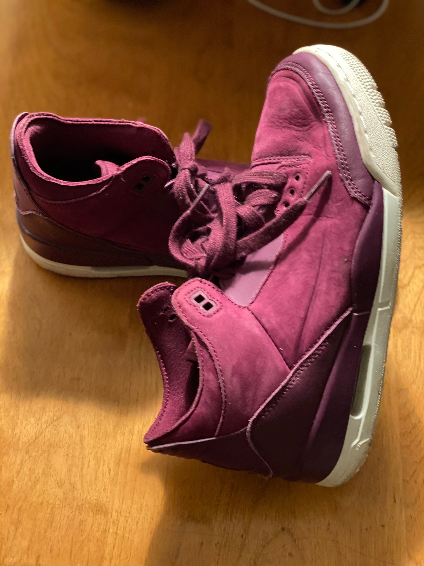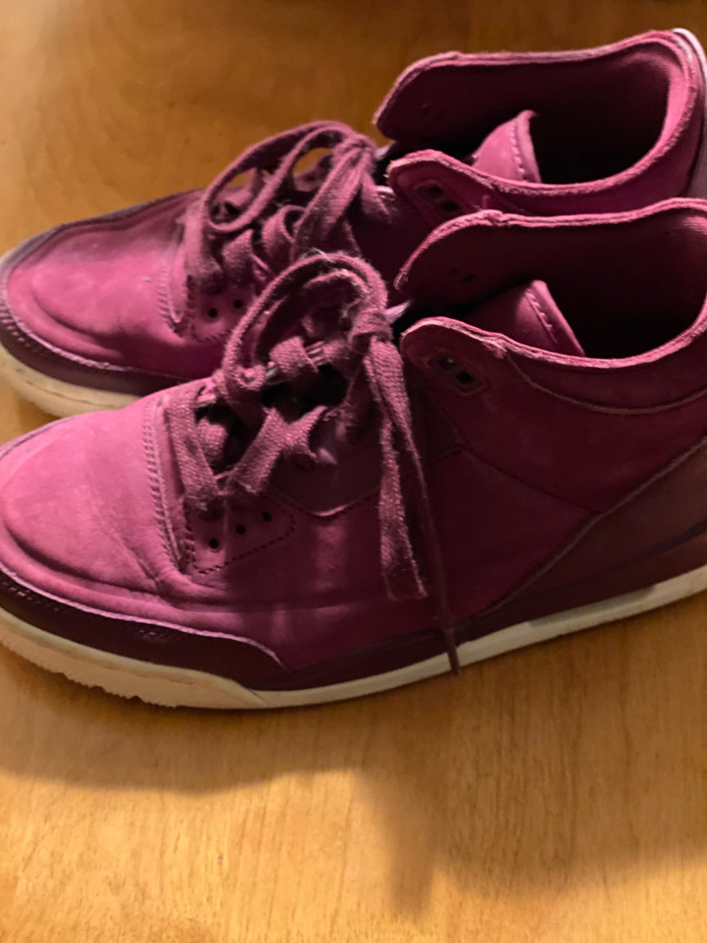 Nike Air Jordans in purple suede, size women’s 7 in excellent condition. Marked 6.5 but I think there’s a little room. Only worn for photo shoot.