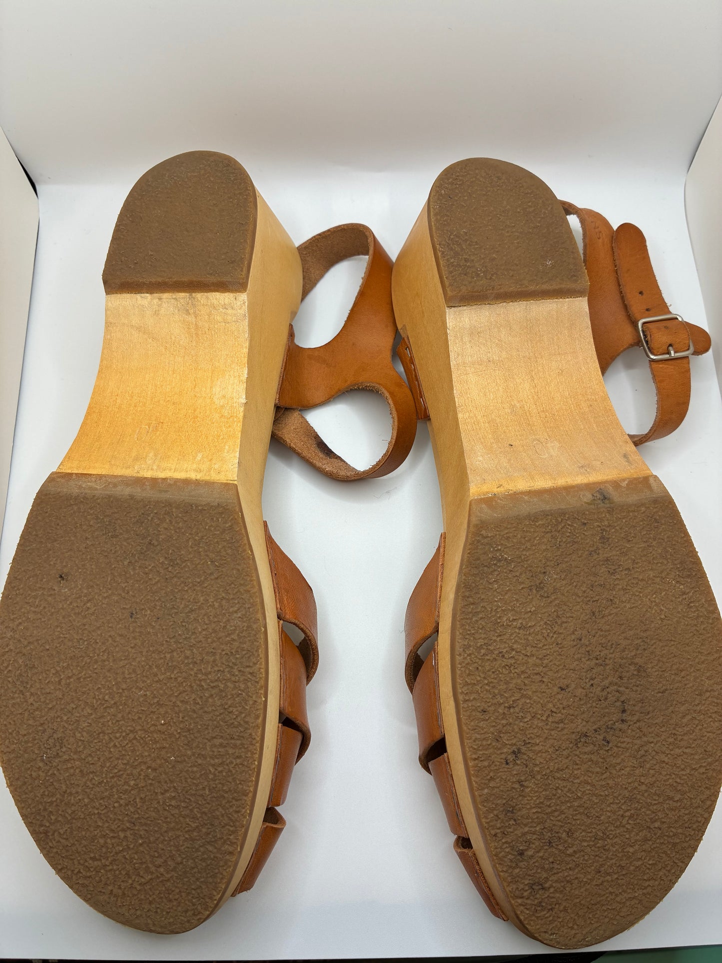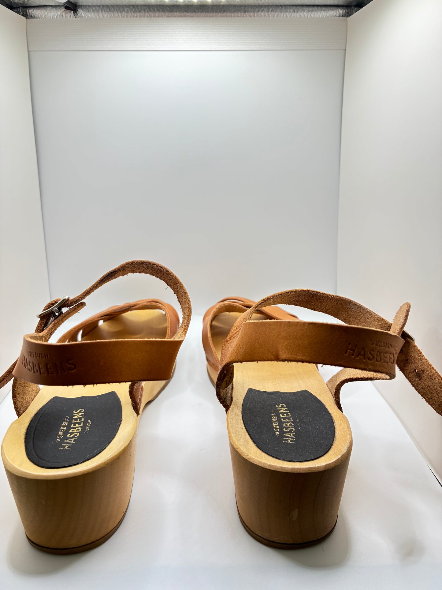 Swedish Hasbeens Brown Clog Sandal. Once you put these on, you are never going to want to take them off! Both a stylish, go-with-everything sandal AND an extremely comfortable shoe, these brown strappy leather clog sandals with ankle straps are a must-have staple! in like-new condition, shoes are free of stains and defects.