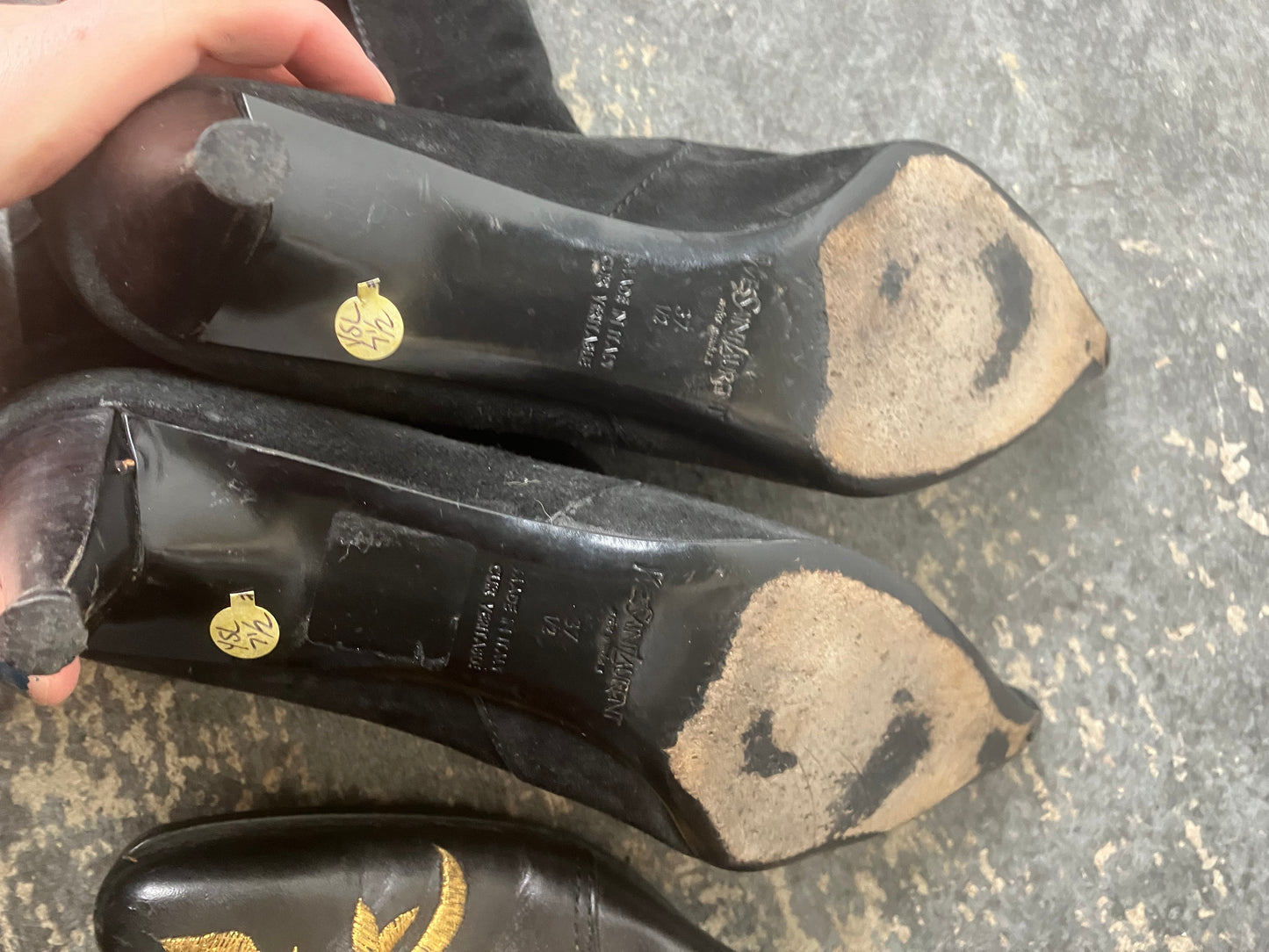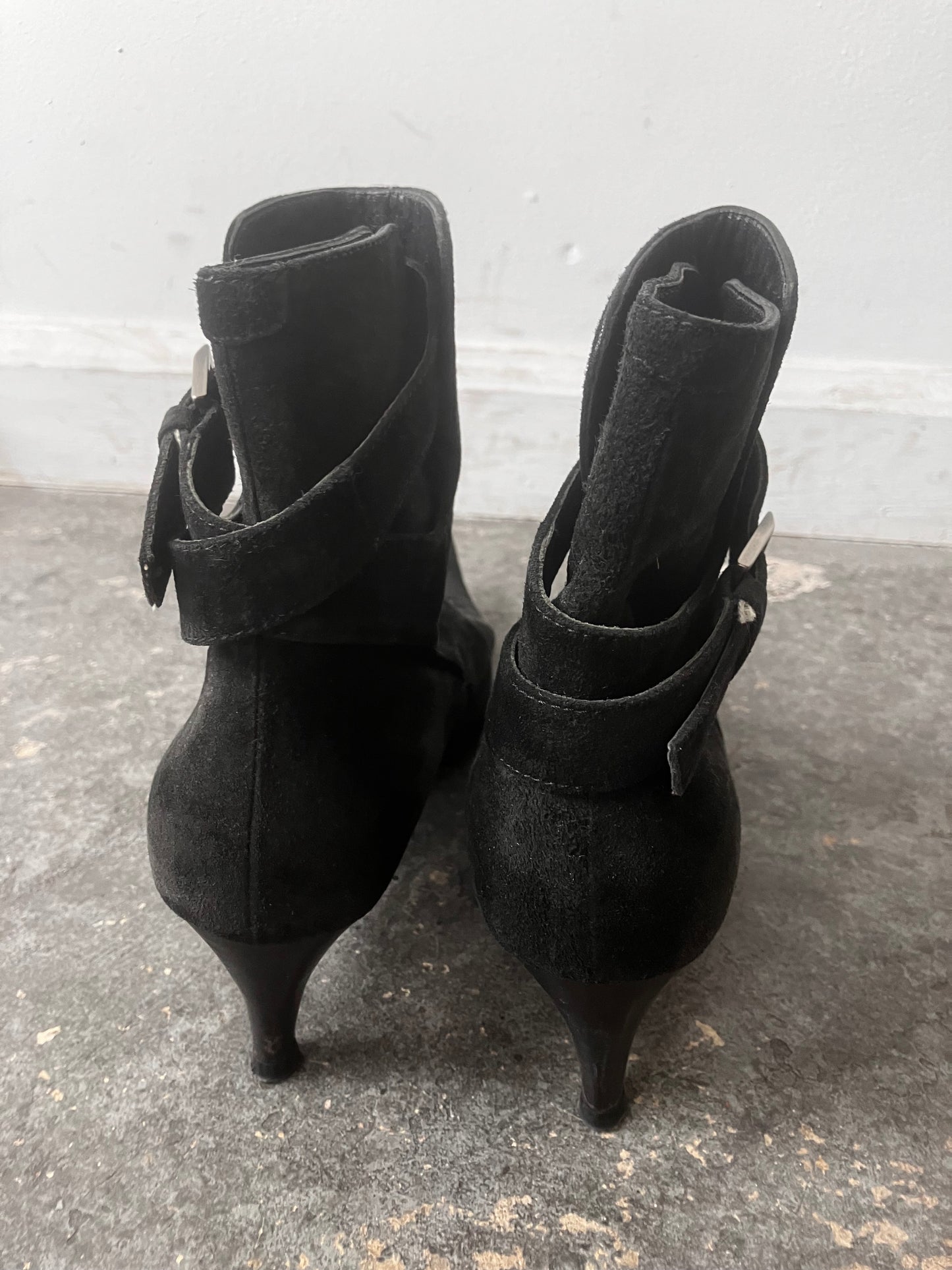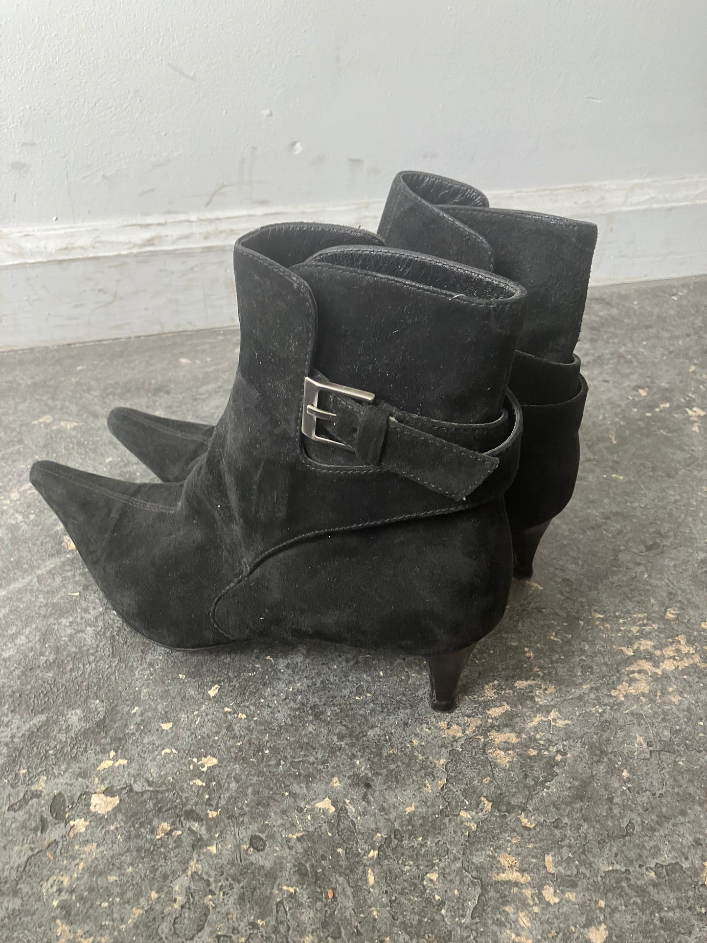 Vintage YSL Yves Saint Laurent Rive Gauche Black Booties. In great condition with wear on soles. Leather and suede -with silver toned hardware. Straps wrap around with buckles. Professionally clean only. Size 37 1/2 EU, 7 1/2 US.