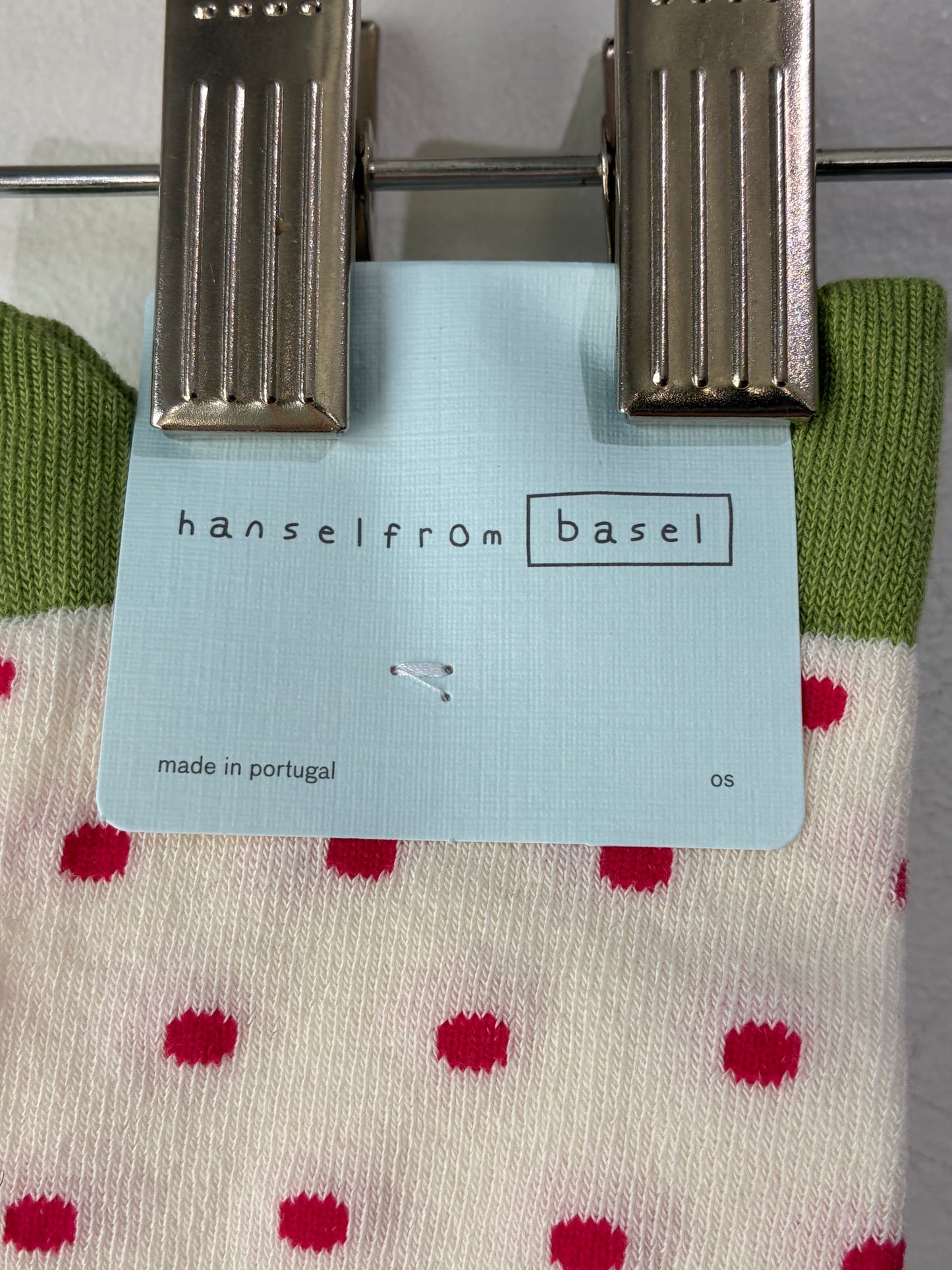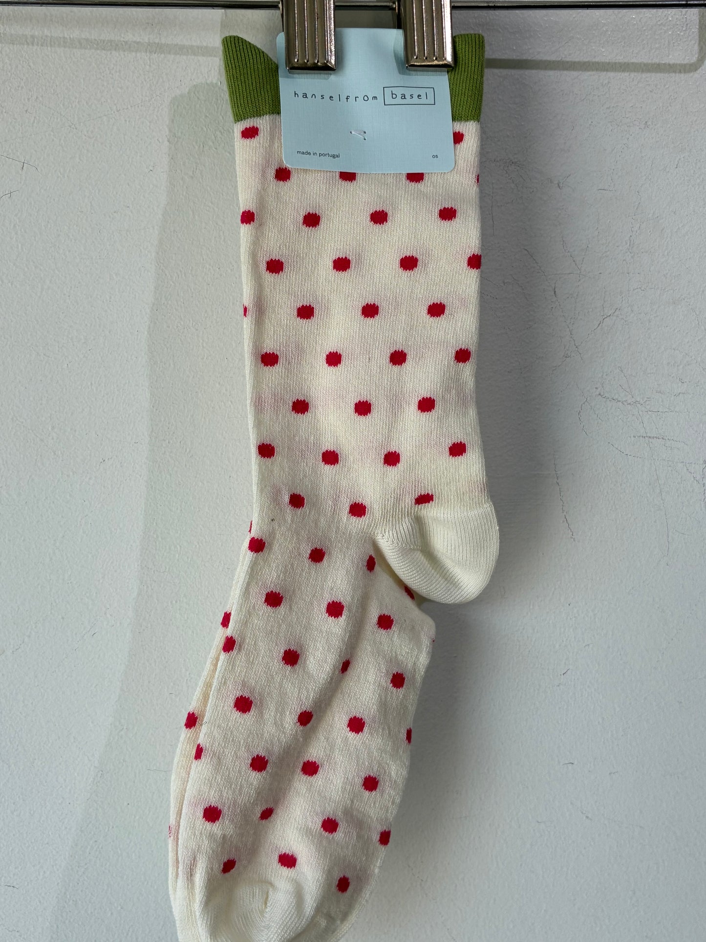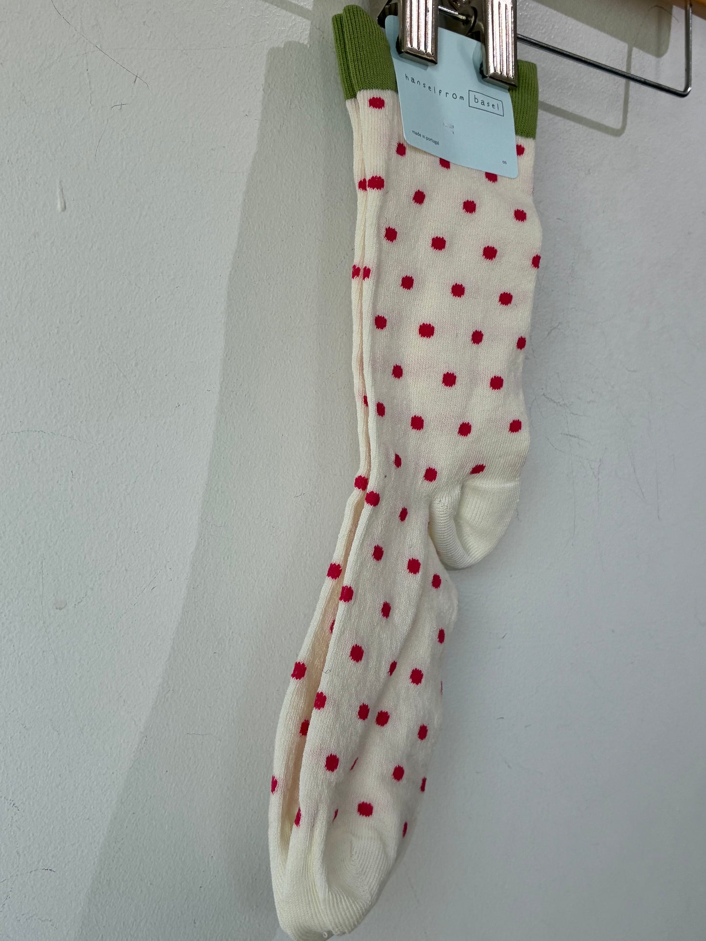 Hansel from Basel White Pineberry Crew Socks. These fun "pineberry" socks feature a pink polka dot and a scalloped green top. A super cute way to embellish any outfit, socks are also comfy and stretchy! New with Tags.