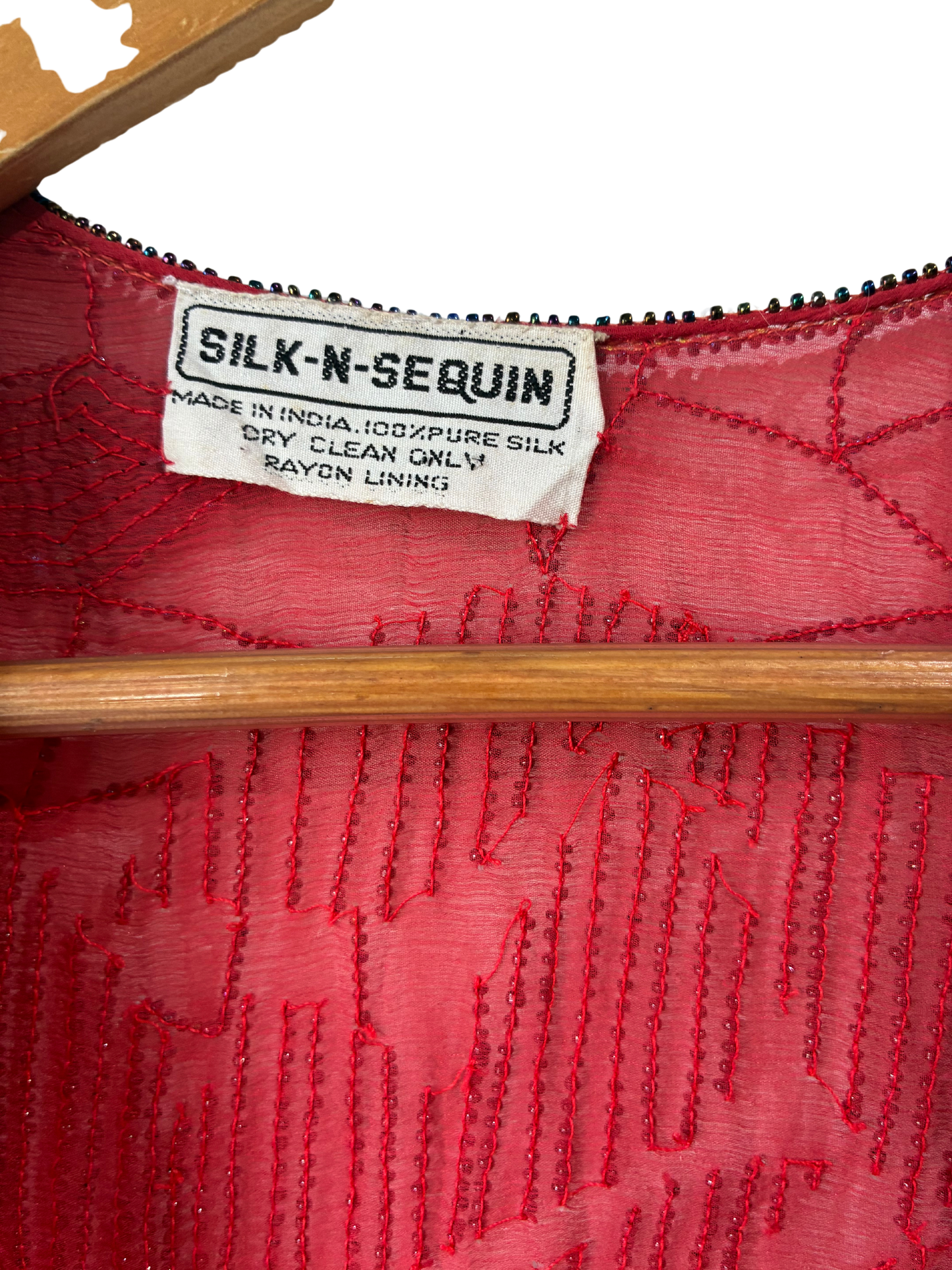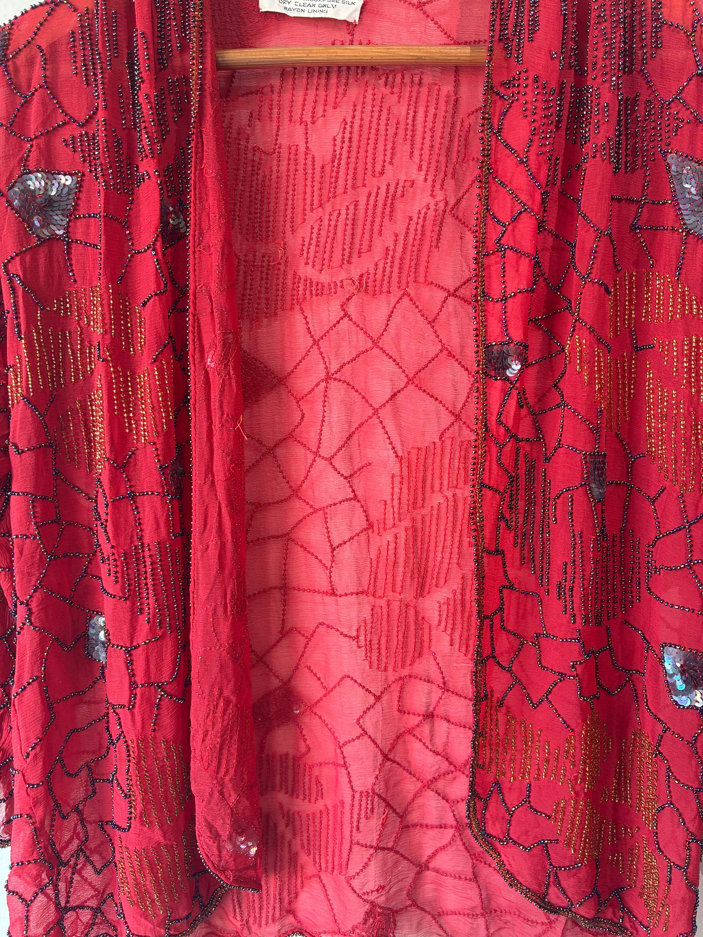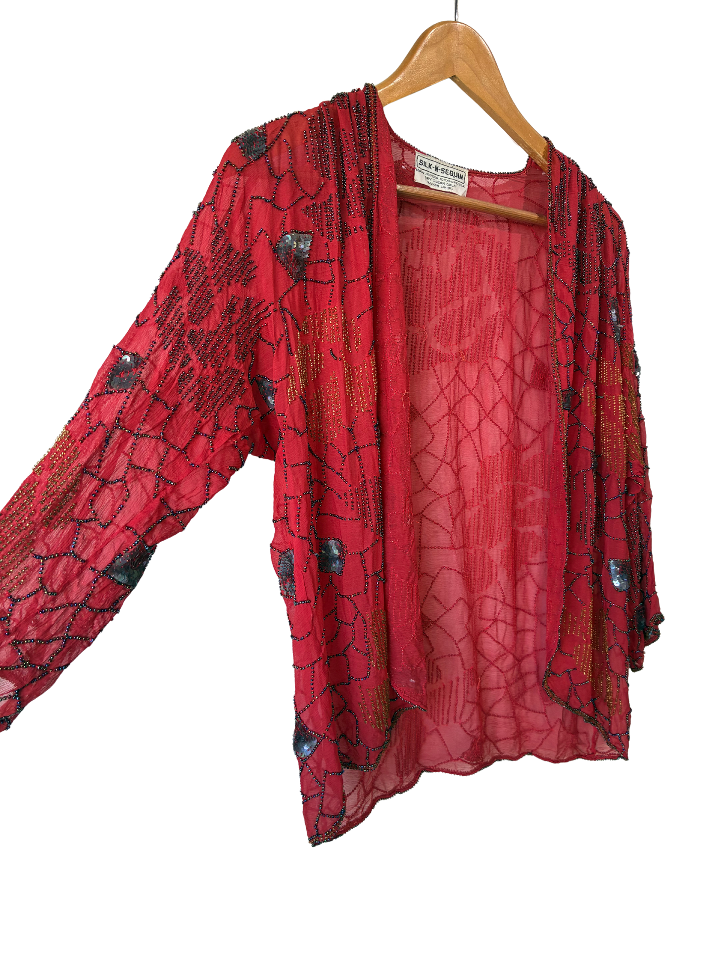 A rich red silk open-front jacket with stunning sequin beadwork that catch the light just right. Delicate without being demure, this little "lady" adds instant sparkle without trying too hard, and does double time-dress it up or pair it with your favorite jeans!