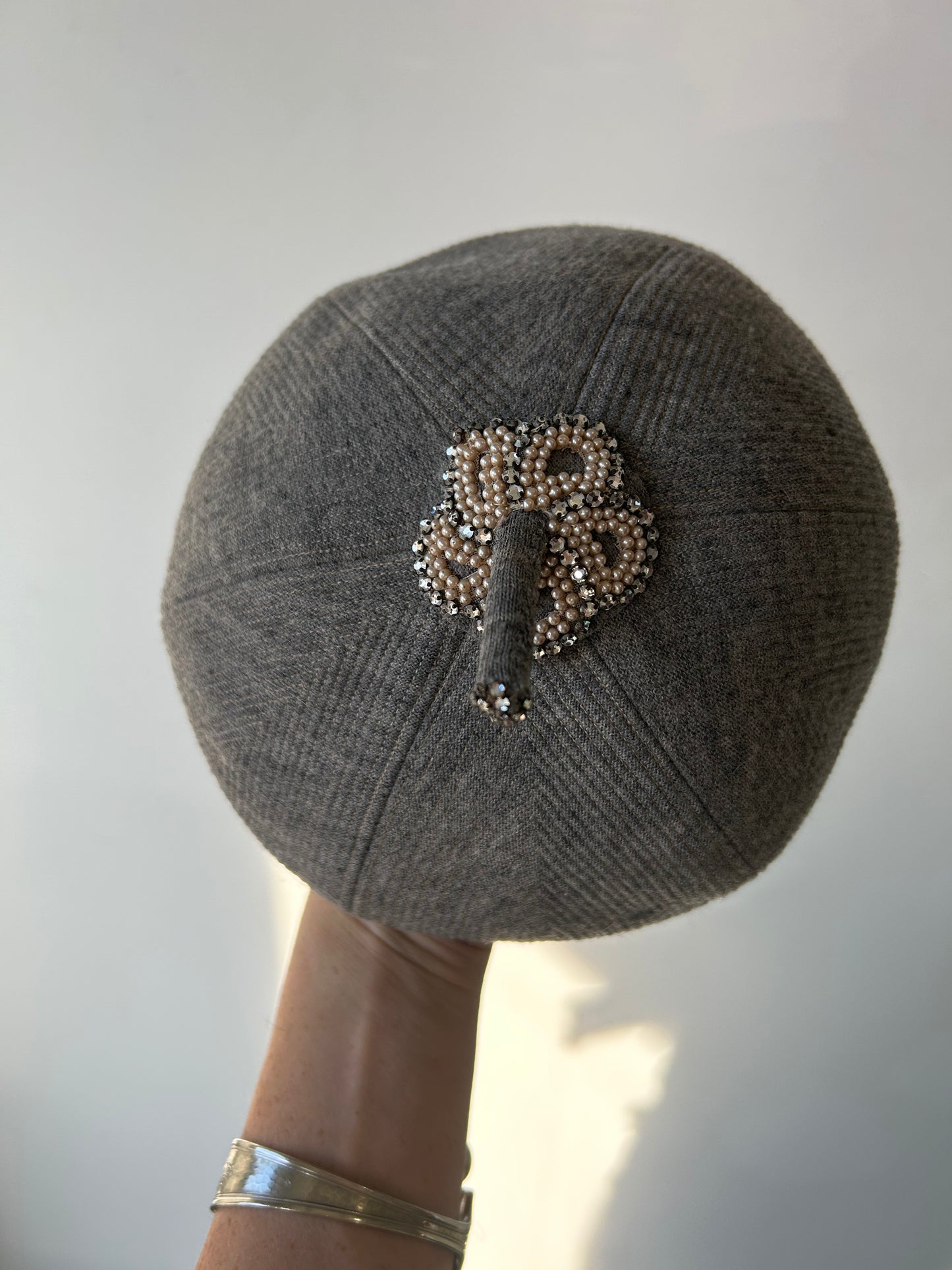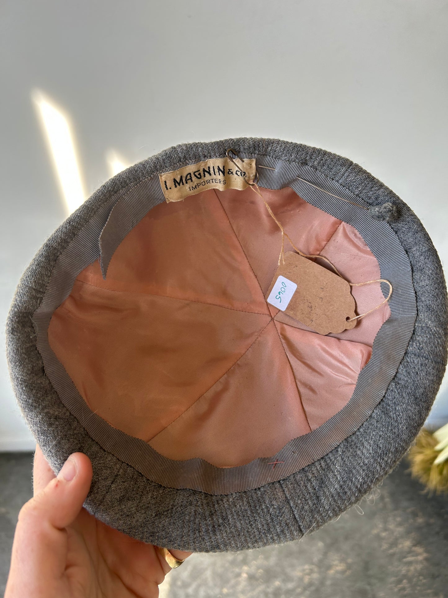 Vintage I. Magnin Little Grey Hat. Cutest little grey wool head-pice with bead and sequin embellishments on the top. Shape is similar to the cap of an acorn! Interior is lined in a silky pale pink material. Comes with a metal pin fastener to secure it to your head. In great vintage condition.