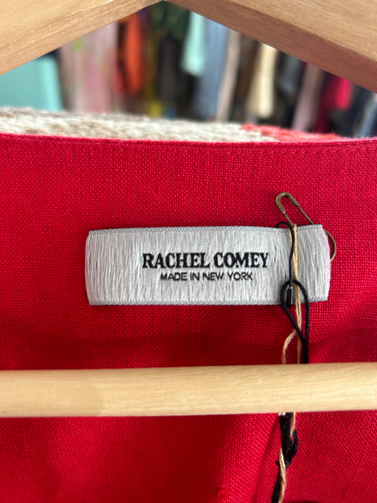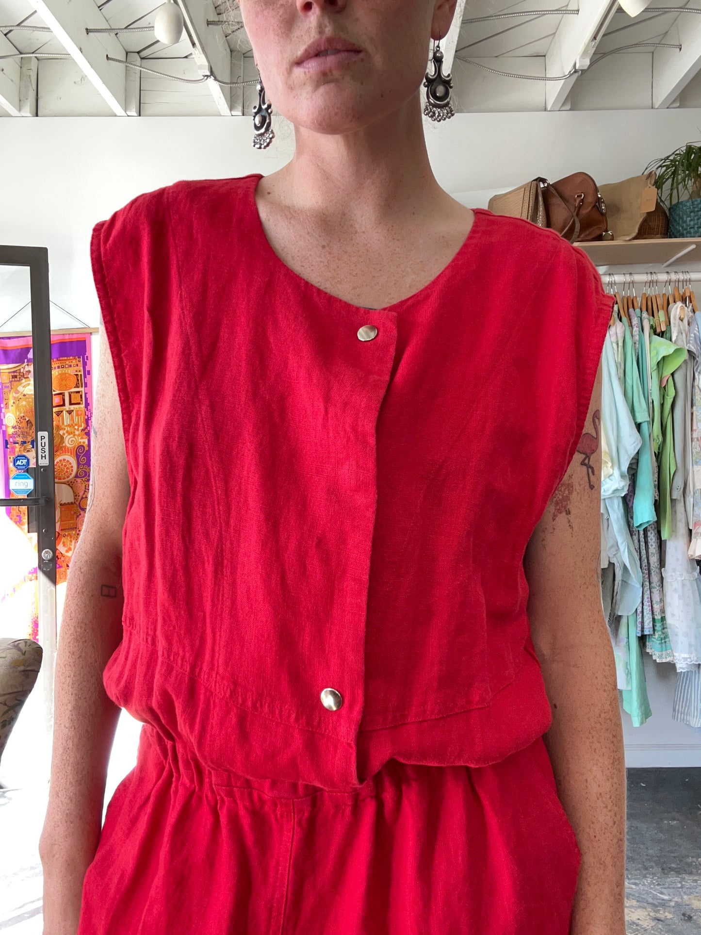 Rachel Comey Red Linen Jumpsuit. A loose-fitting bright red jumpsuit in a heavy linen.Sleeveless with large armholes, scoop neckline, and silver snaps going down the bodice. Cinches at the waist with elastic for fitted yet adjustable shape. Has pockets! NWT. Made in New York. Marked size 10.