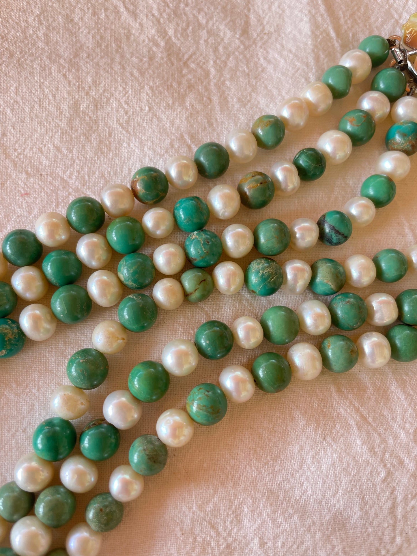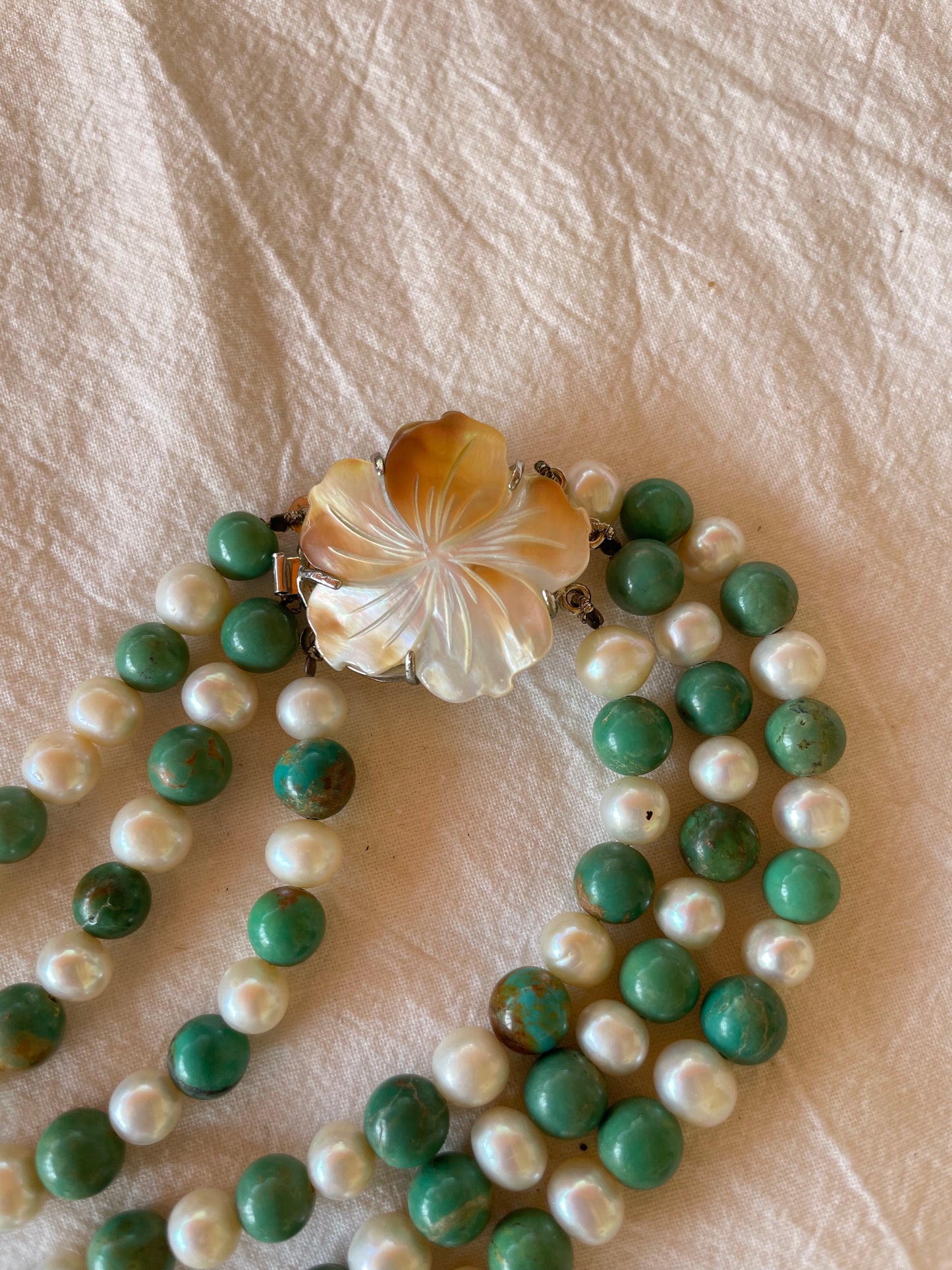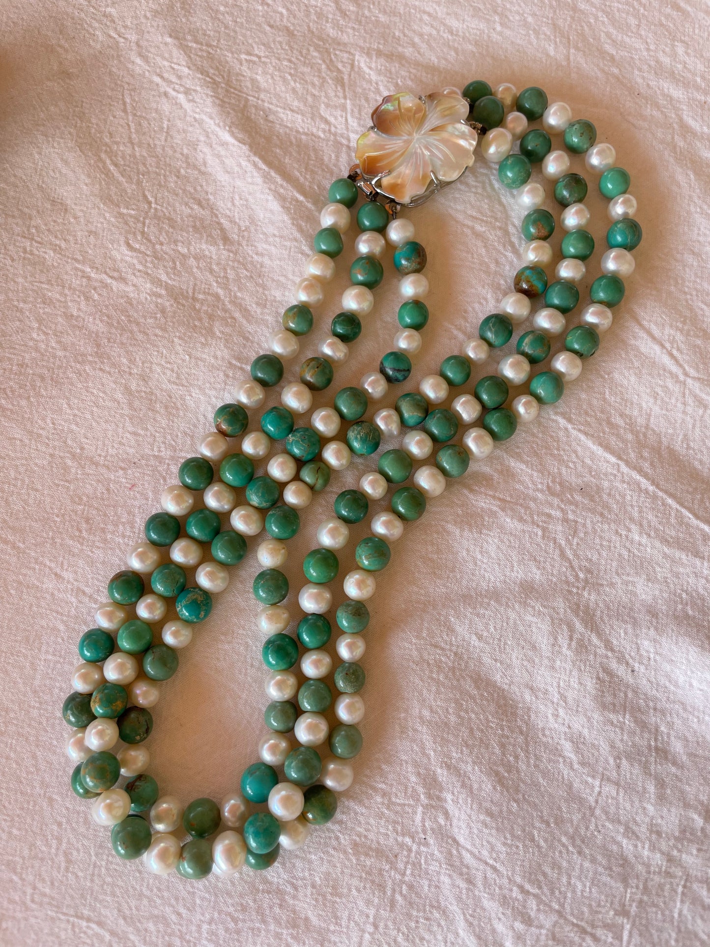 Vintage Turquoise and Pearl Three Strand Necklace with Carved Shell Clasp