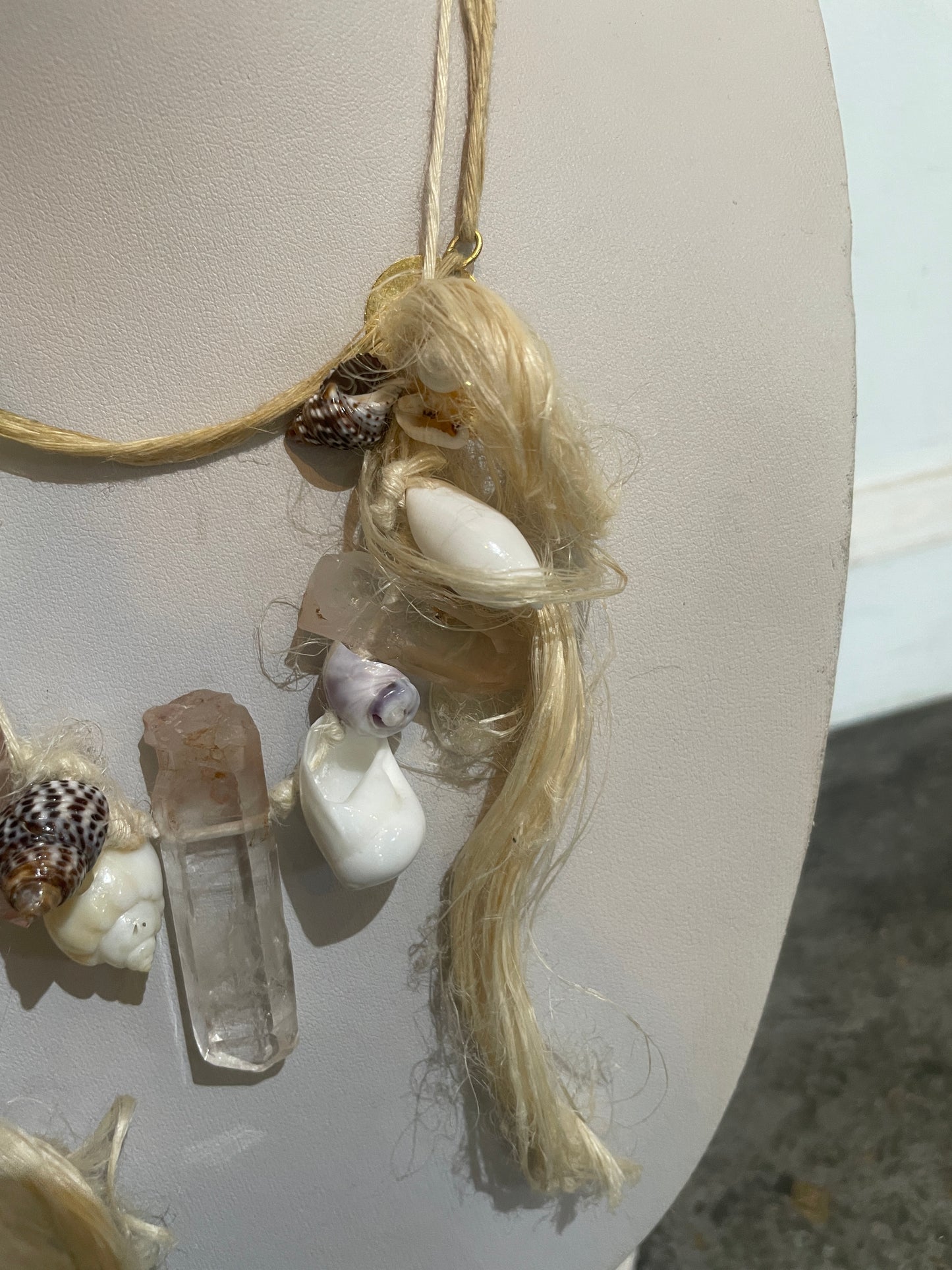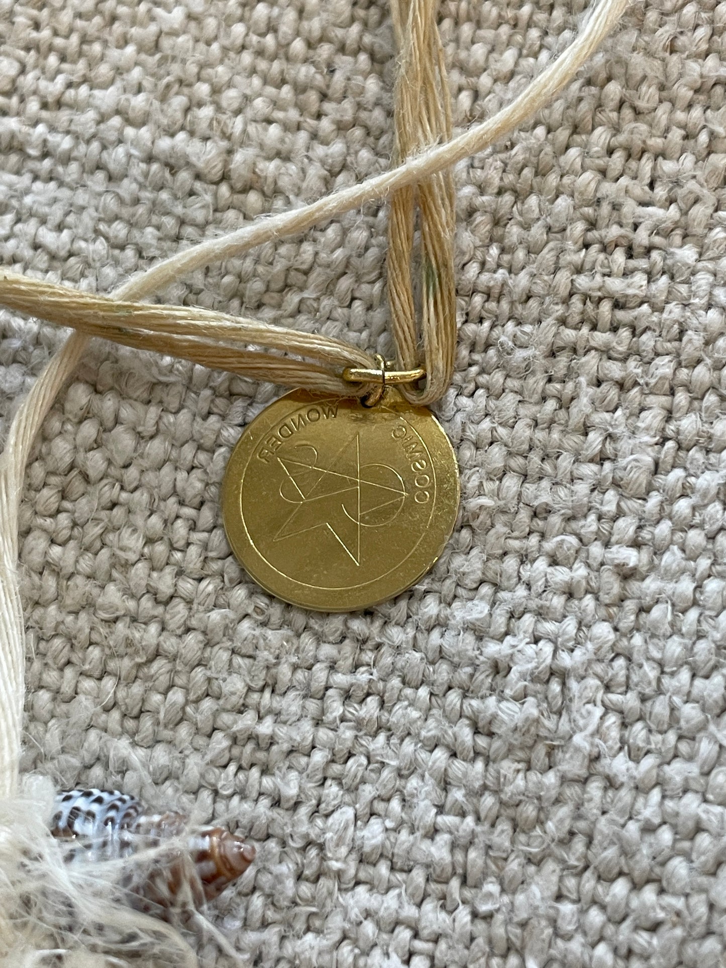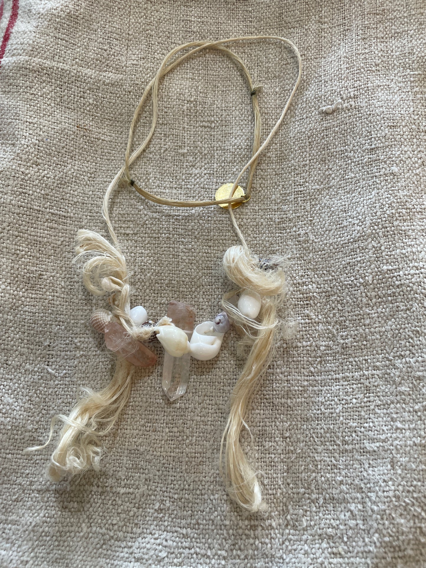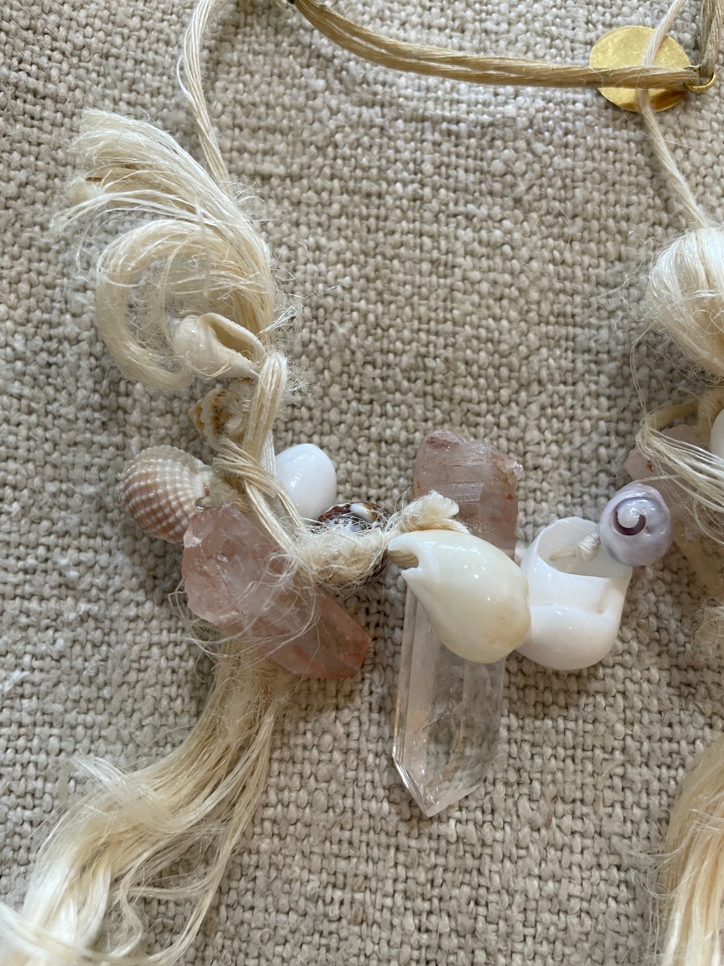 Cosmic Wonder Crystal and Shells Necklace. A beautiful necklace featuring natural materials including shells, crystal, and a natural fiber string. A wonderfully unique piece. Long length, can be worn wrapped around for different occasions. 32" around