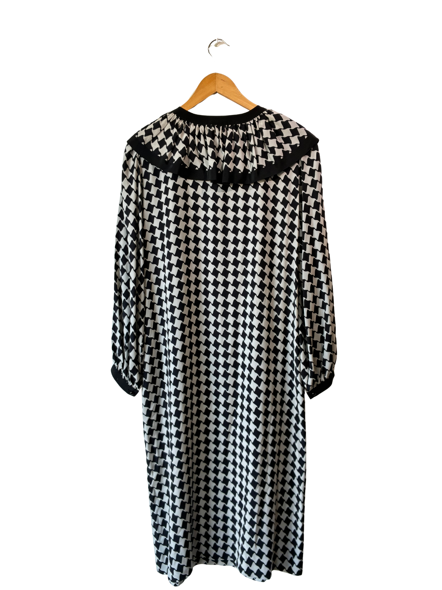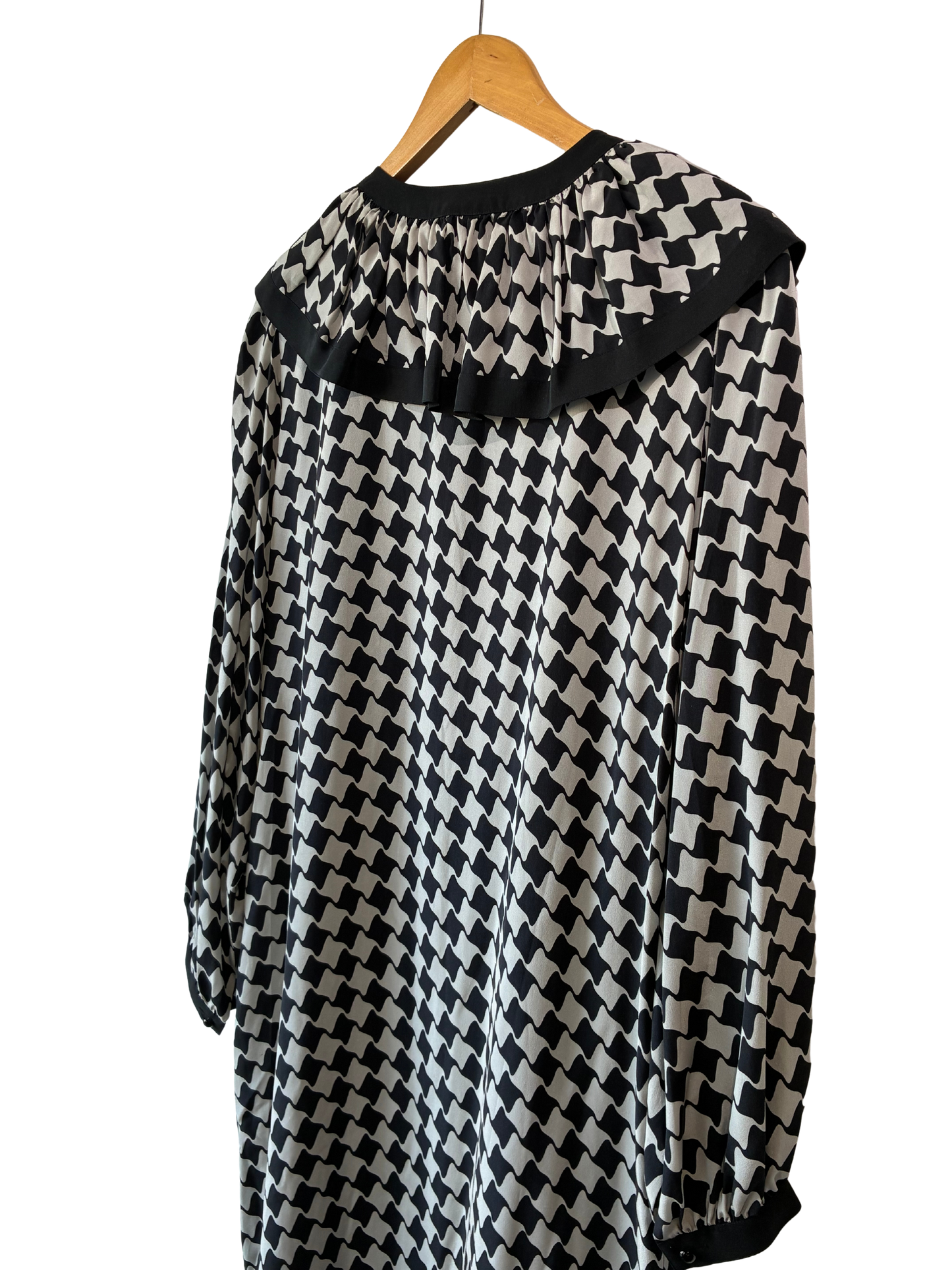 Graphic black and grey abstract check silk and a statement clown collar that means business (but doesn't take itself too seriously). The half button front keeps it streamlined, add a belt for utter fabulousness-she is truly a blank canvas for accessories and play! Polished enough for the office, but fun enough to go out after!