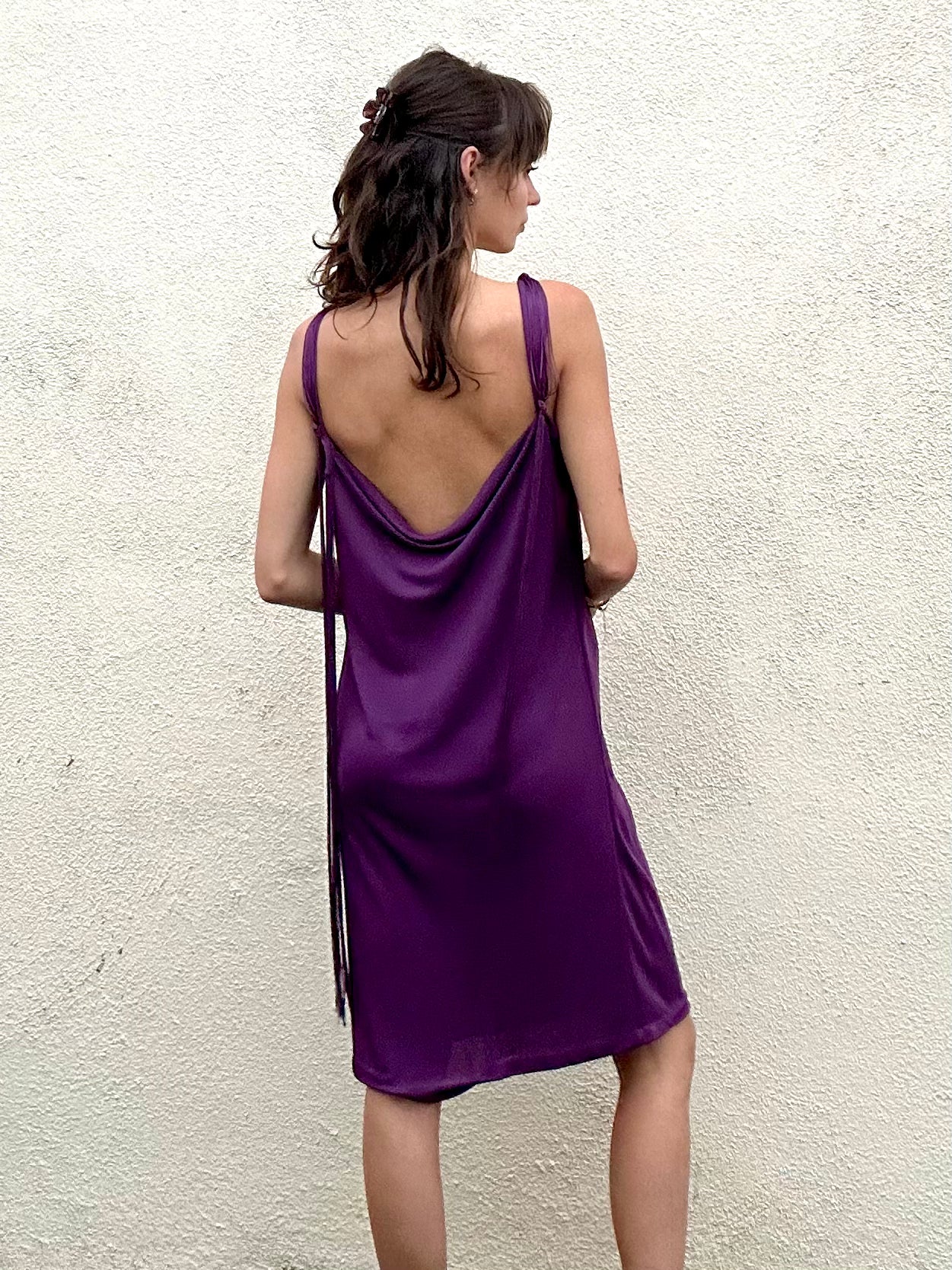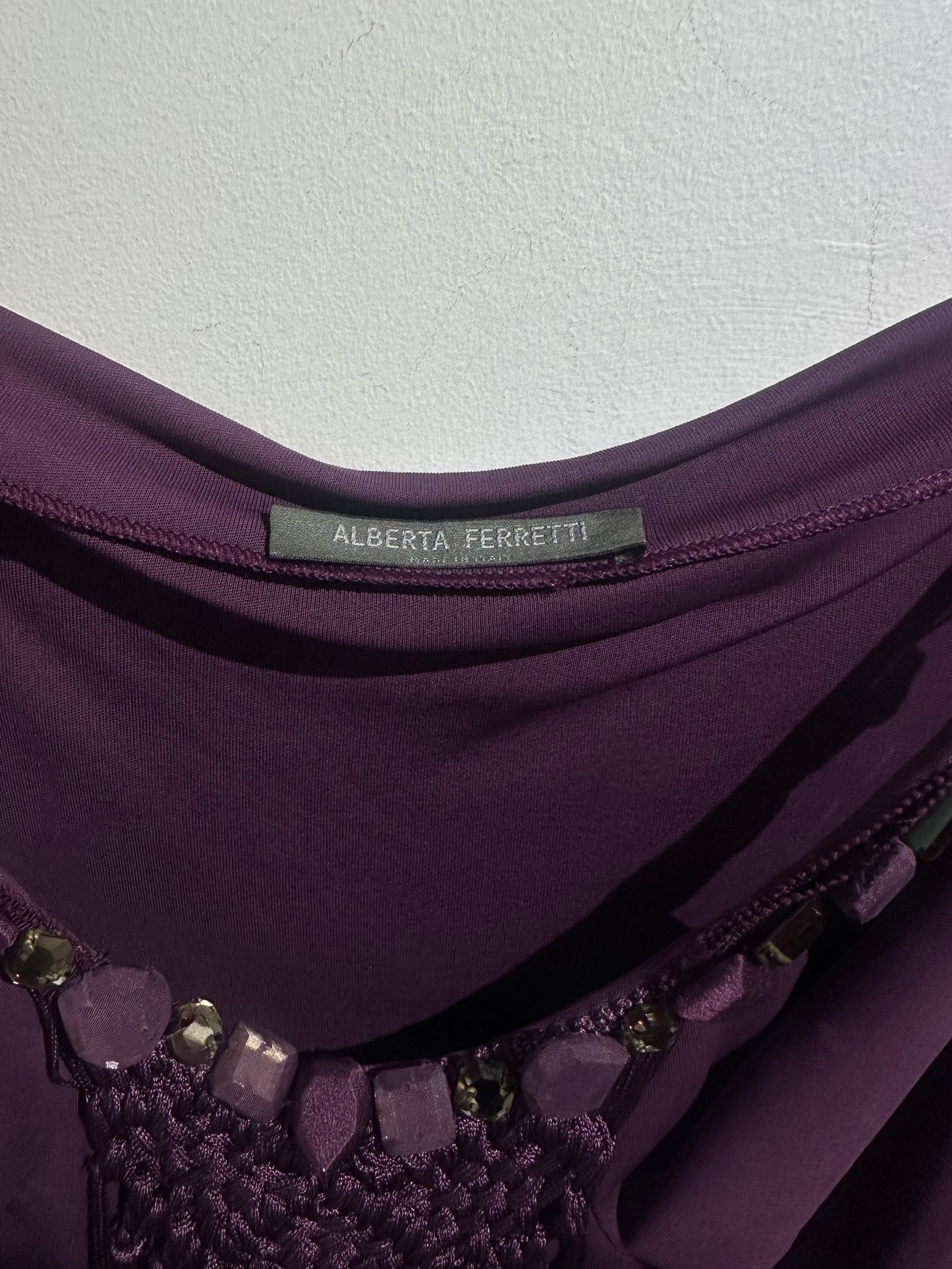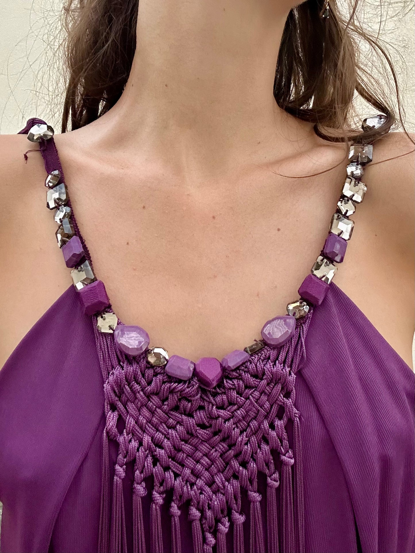 This purple embellished fringe dress by Alberta Ferretti is sleek, sexy, and subtly boho chic. A loosely form clinging silhouette with a thin embellished neckline, complimented by a that little fringe center piece going on, gives this dress a lovely balance of elevated and chill. The fabric content is not included, but feels like a viscose blend.
