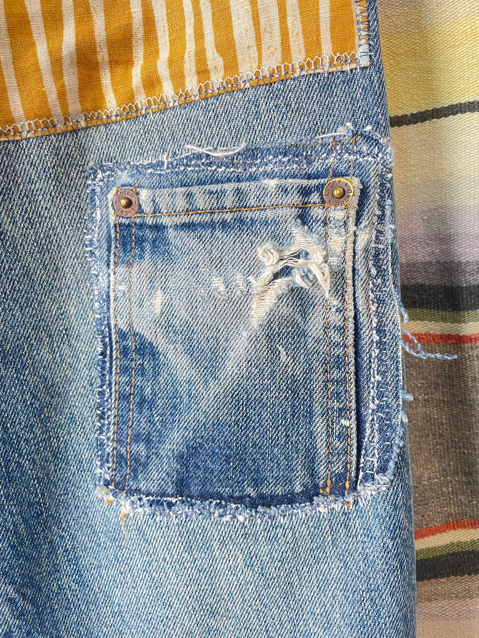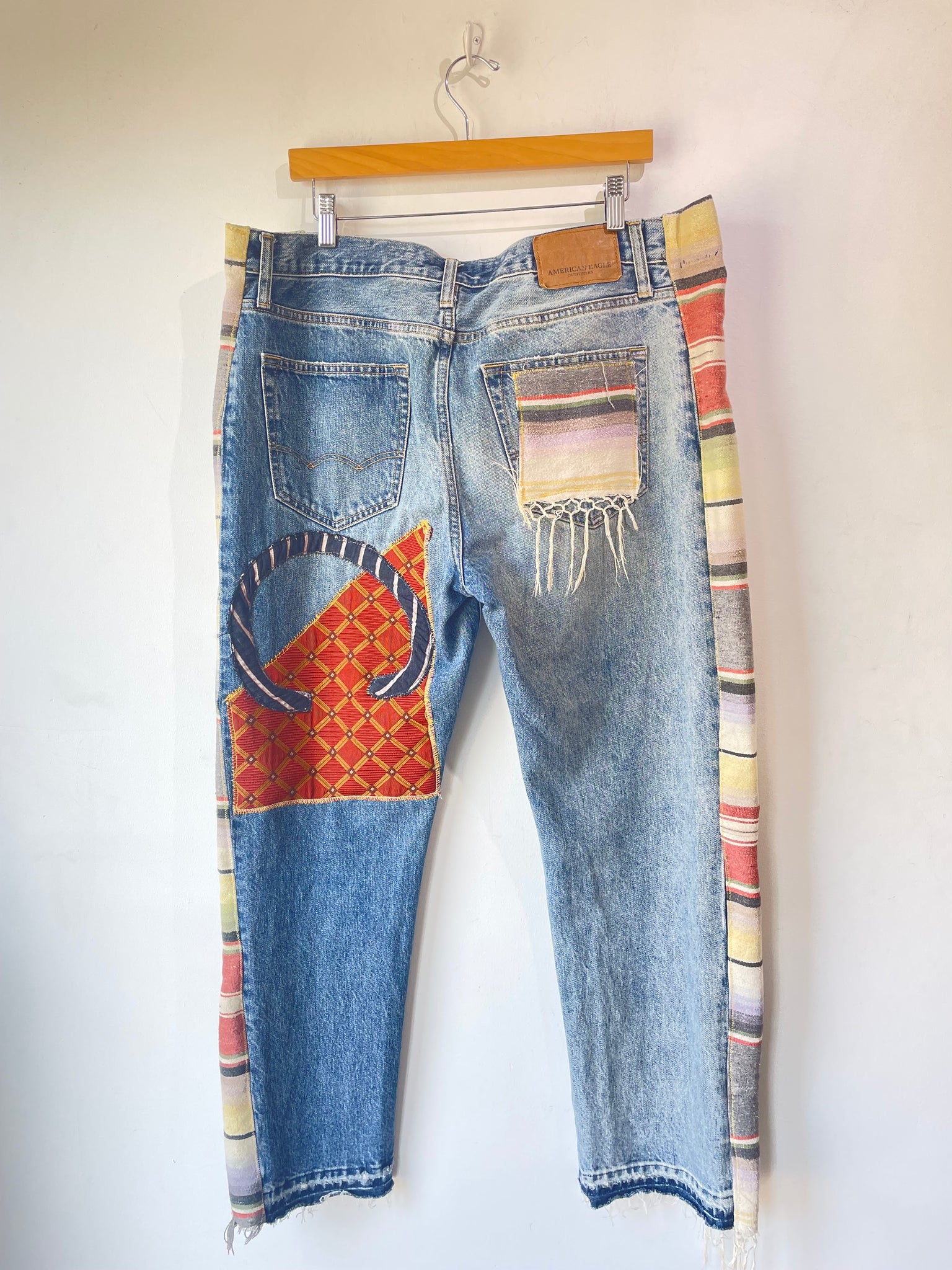American Eagle Outfitters Patched Dad Jeans, Men’s. 38/41. Laid-back, worn-in, and patched to perfection. Mid-weight denim with visible mends and tonal patchwork in blues, greens, and khaki. That classic dad-jean shape: easy through the leg, slightly relaxed at the waist, perfectly lived in.