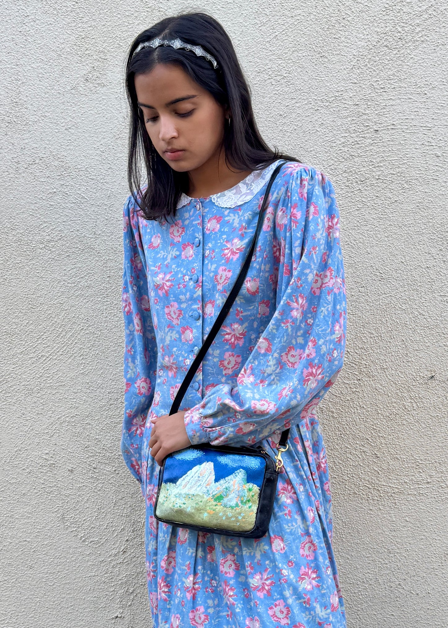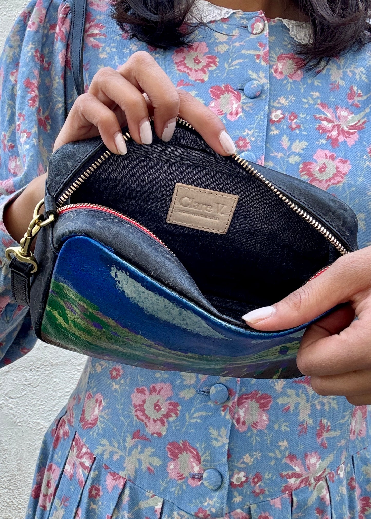 A true wearable artwork. This leather Clare V. purse was hand painted in acrylic by artist Peter Salsman in collaboration with Creative Growth Art Center, the pioneering studio and gallery supporting artists with developmental disabilities. One side features a serene mountain landscape; flip it over for a vibrant floral scene. Finished with a latch closure and crossbody strap for everyday ease. Art, advocacy, and design all in one beautifully personal piece!