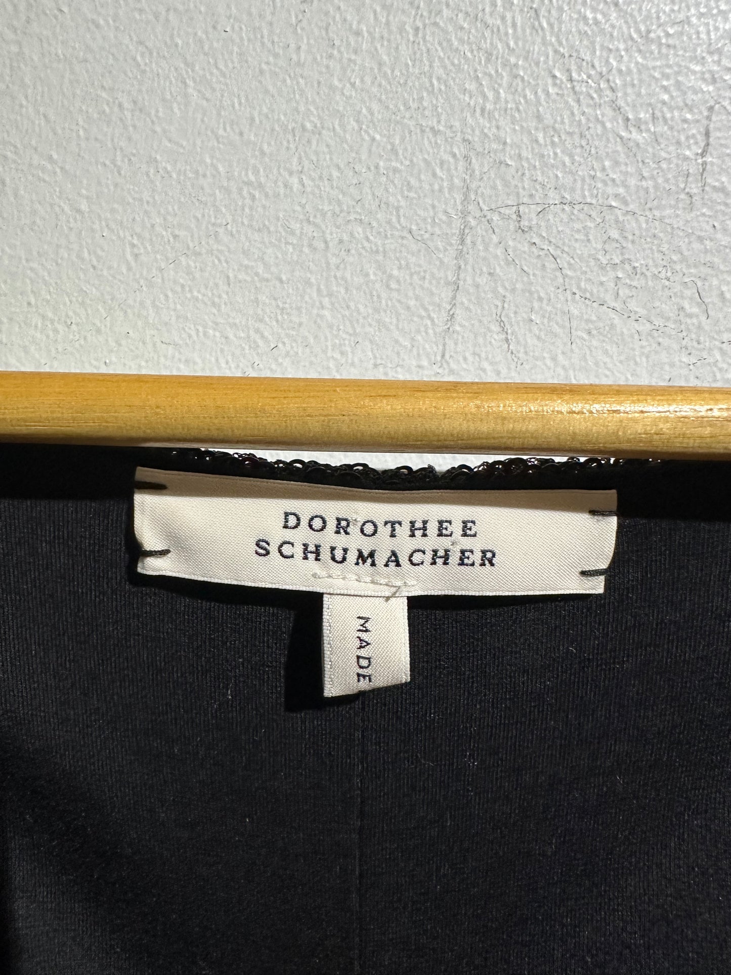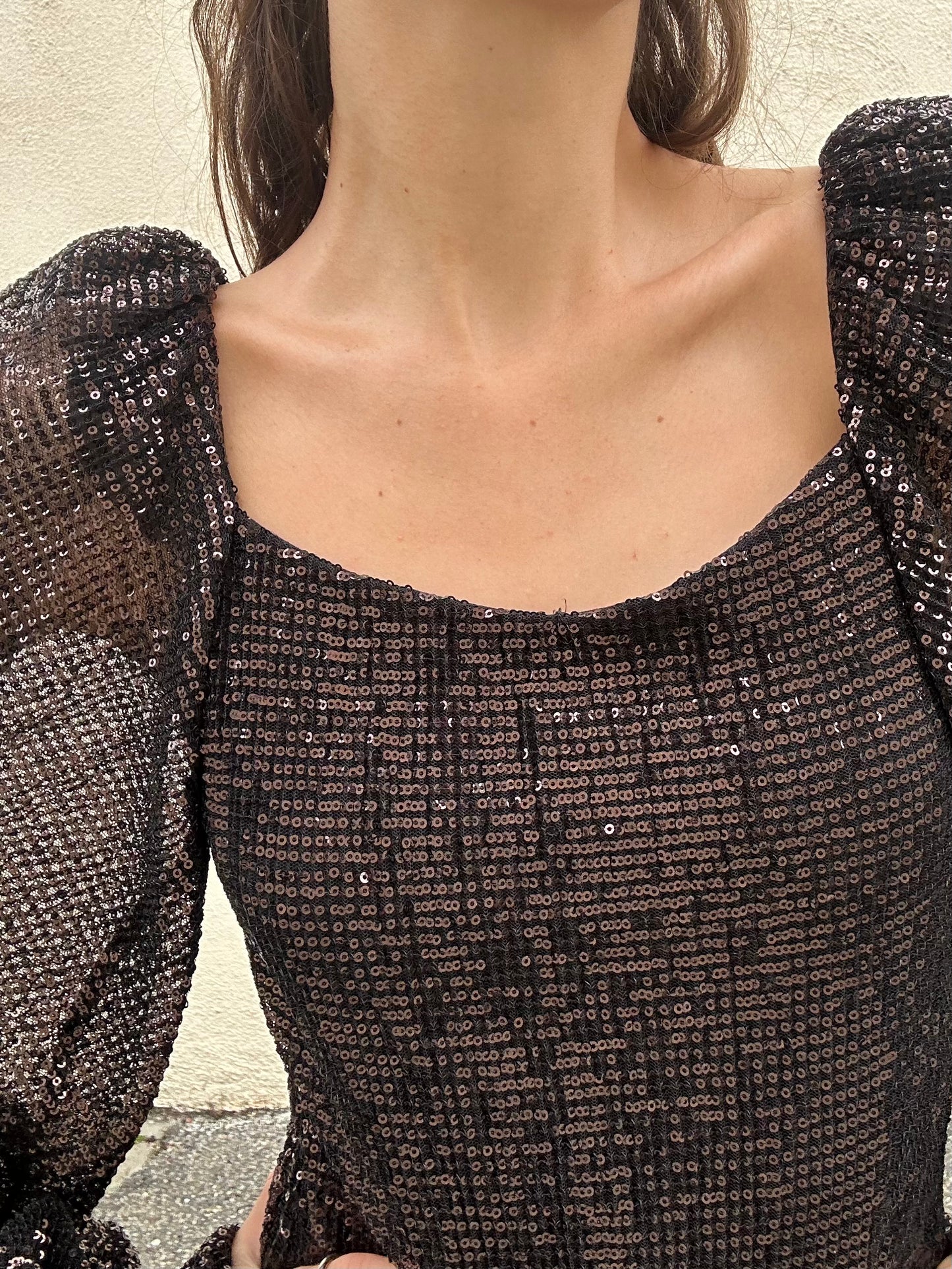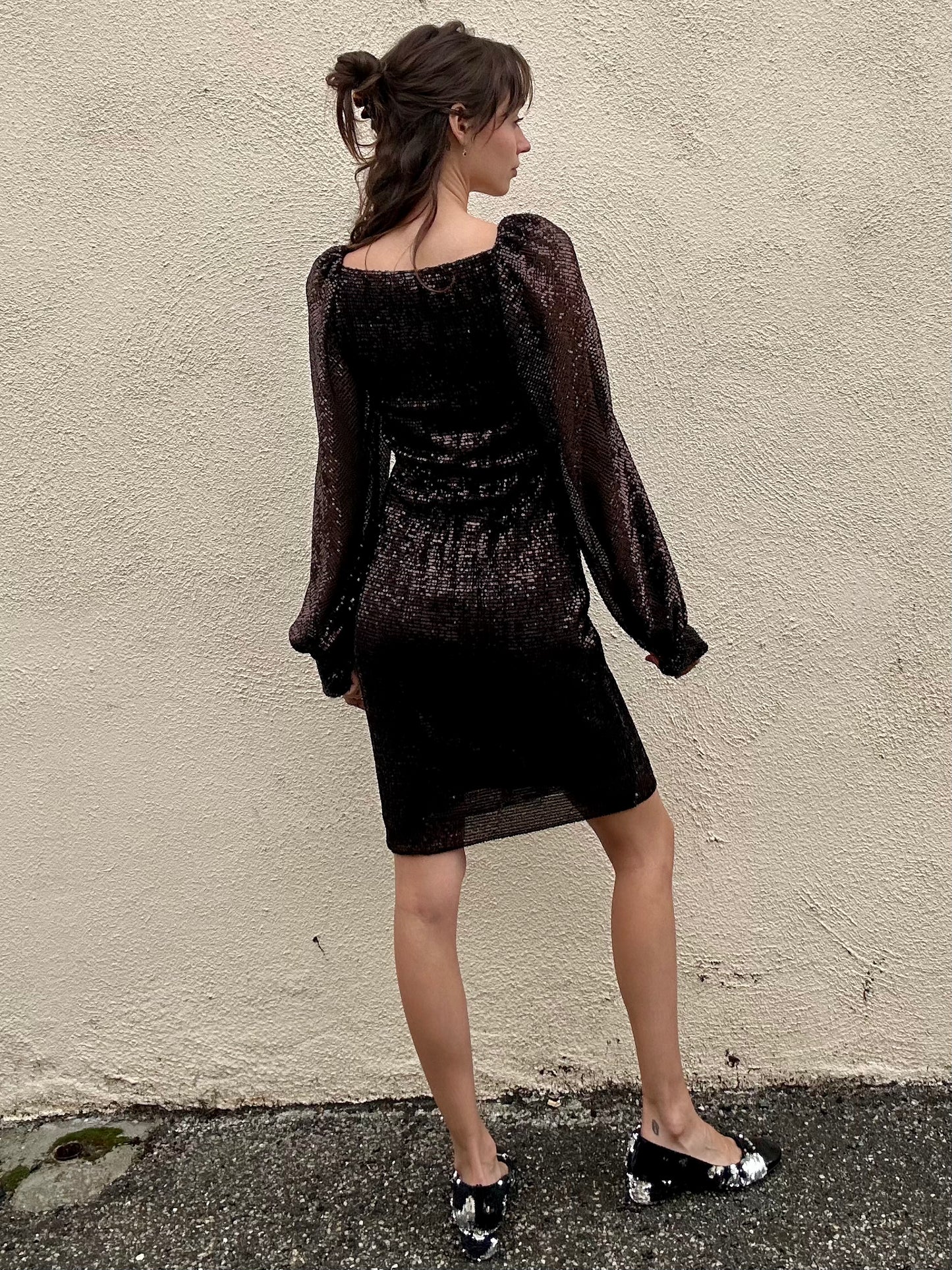 This little black sequin dress by Dorothee Schumacher is made for all your fancy event and party needs. With a sheath silhouette and structured drape, this dress is both classy and understated, elevated by the slightly sheer balloon sleeves, shimmering sequins, and a concave square neckline. In perfect condition.