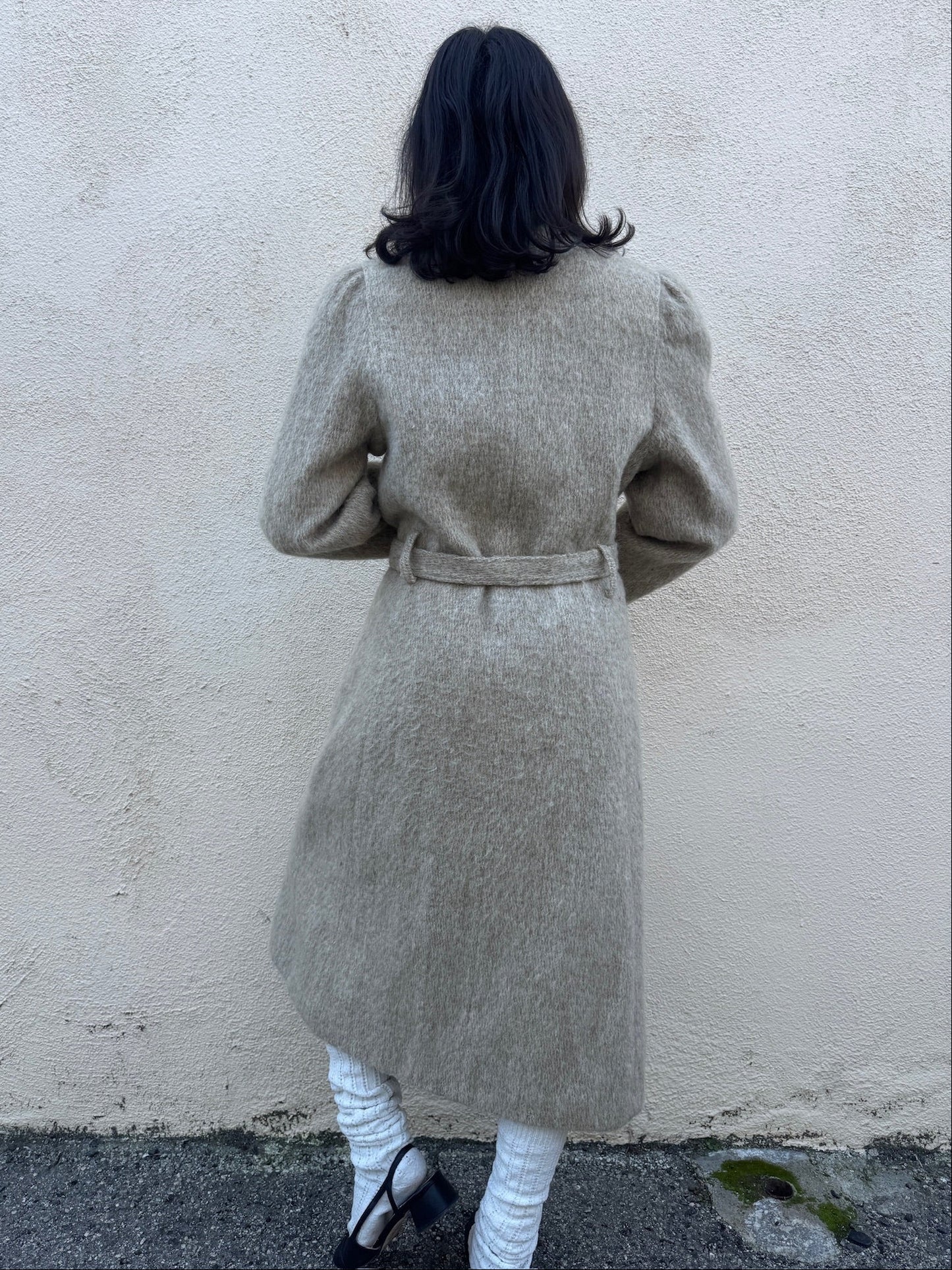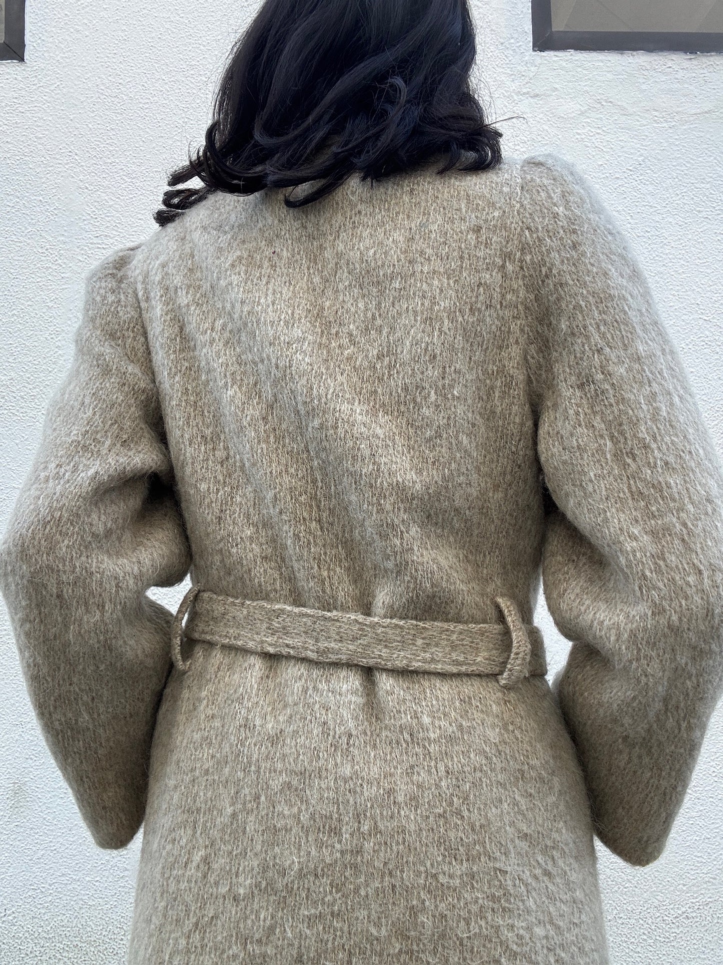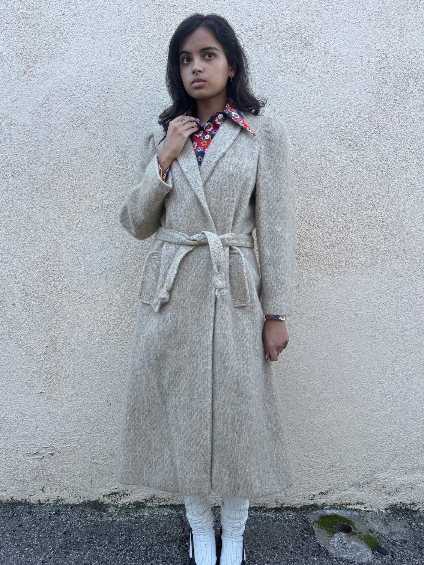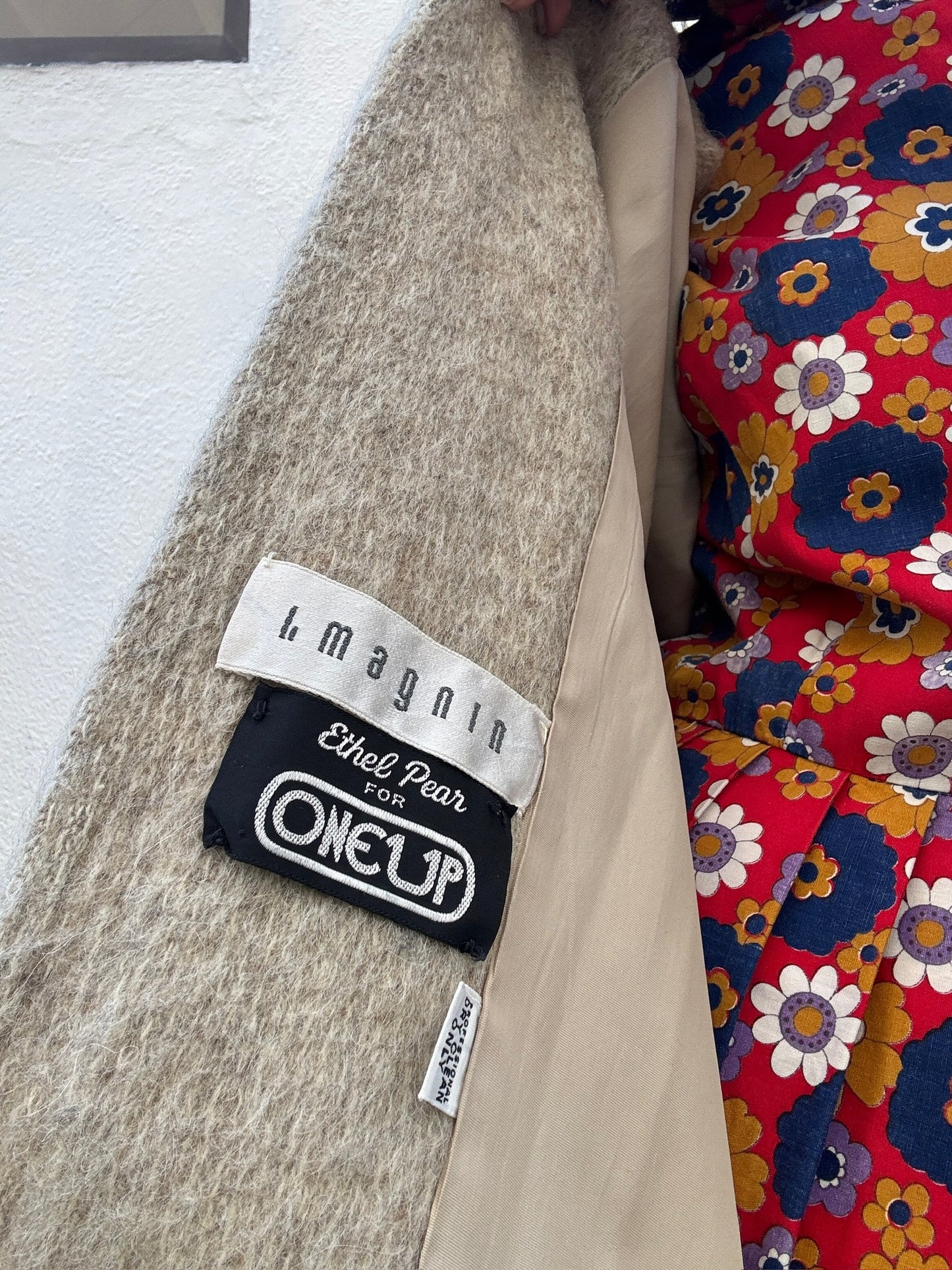 A darling vintage I Magnin Ethel Pear for One Up coat with classic mid-century tailoring. Soft, substantial mohair with strong shoulder emphasis, a self-tie belt closure, and two front pockets. Elegant longline silhouette with gentle structure through the shoulders and an easy wrap fit through the body marks this very of-its-era and very chic. Not to mention how flattering this taupe is to any complexion! Check measurements for sizing, best fits a size S-M.
