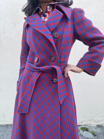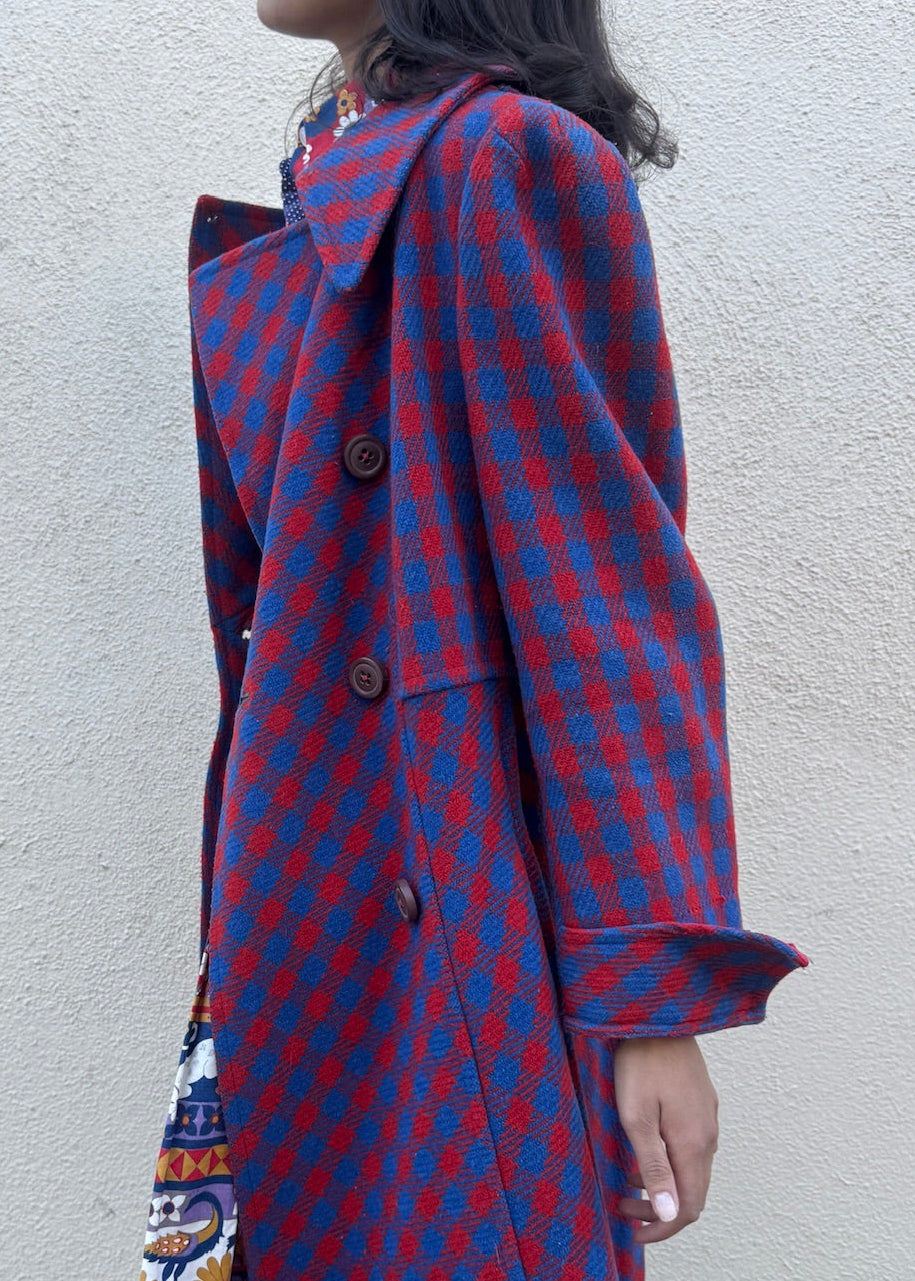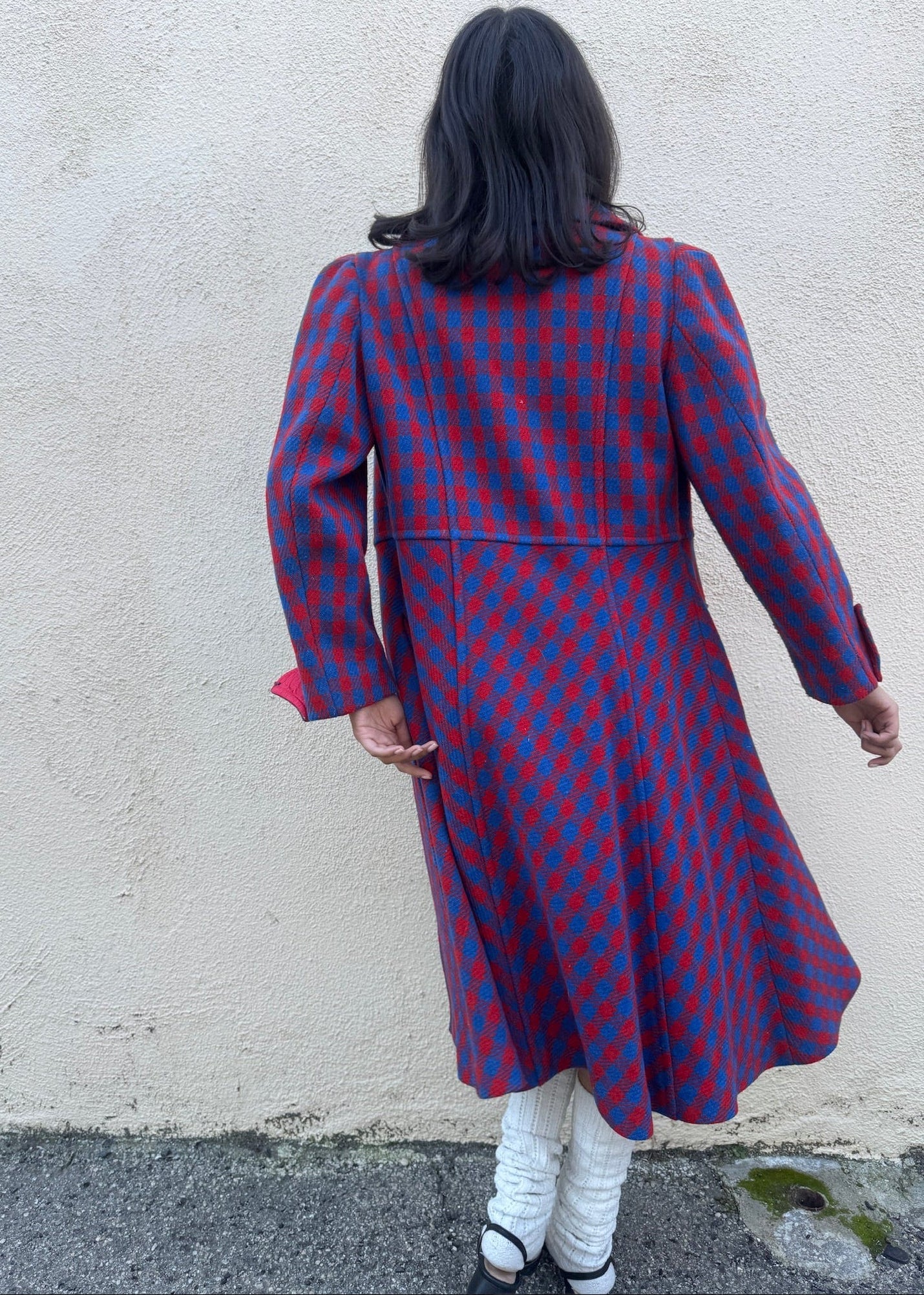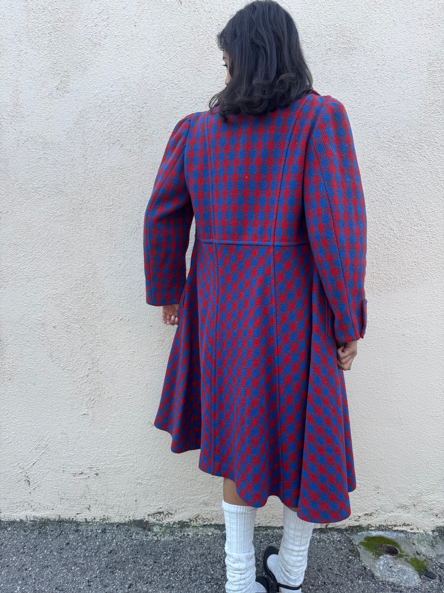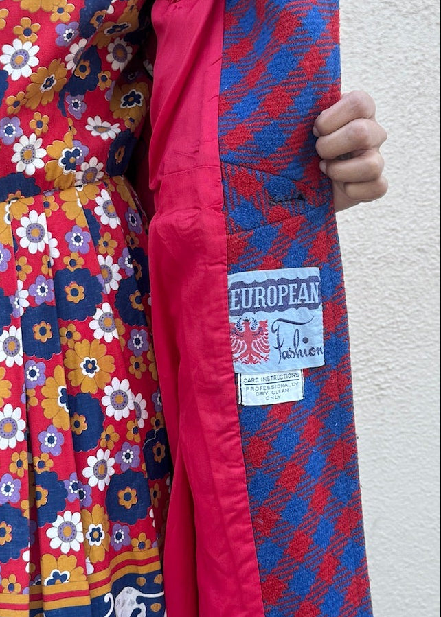 Red + Blue = Purple to the eye ! A vintage coat that knows it’s the main character. This Austrian beauty features a bold red-and-blue gingham weave with thoughtful tailoring details that make it feel playful and polished. Get mod with this double-breasted button layout, a-line silhouette, and a collar dying to be flipped.