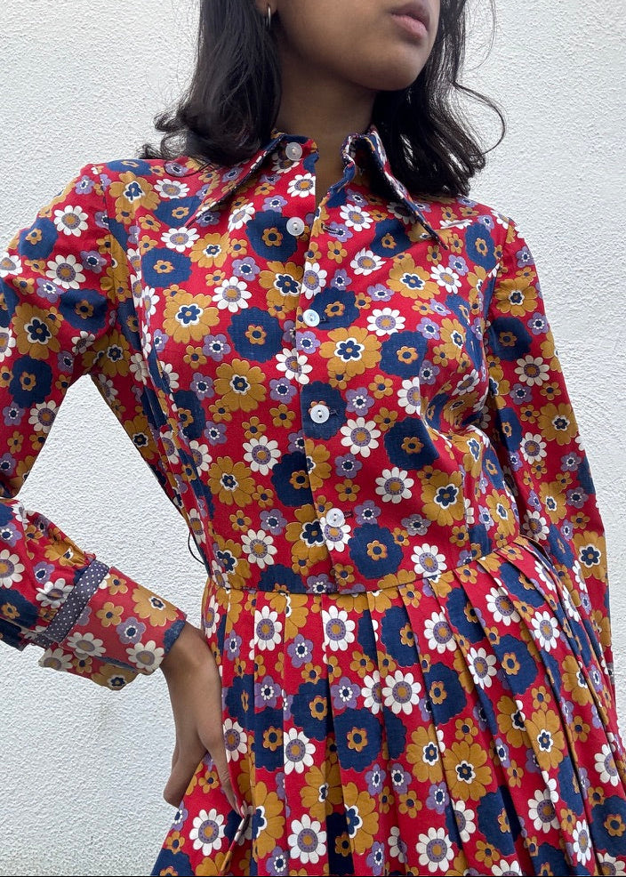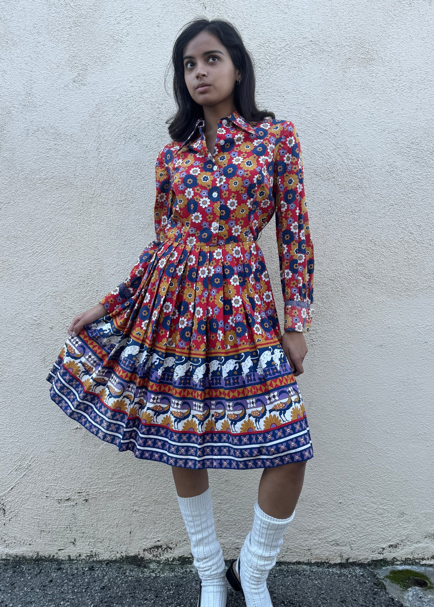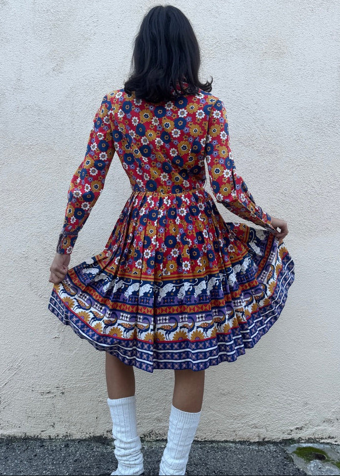 Vintage Printed Button Up Pleated Dress