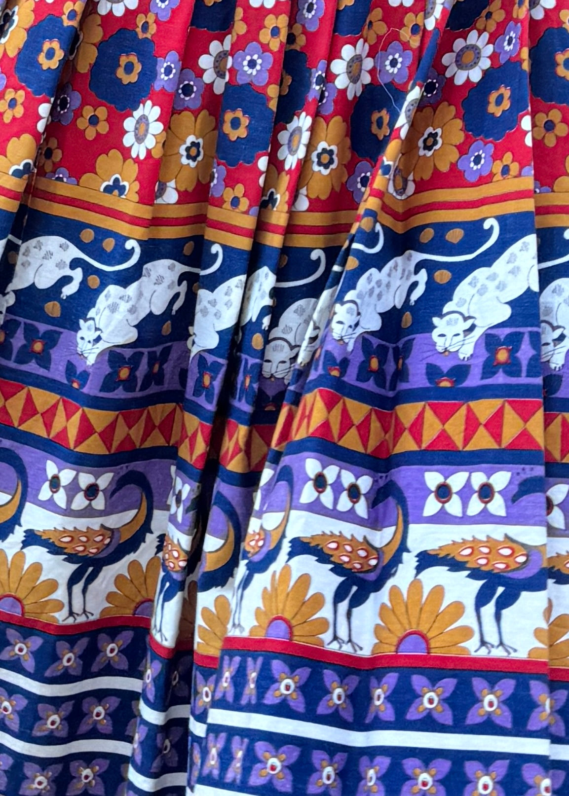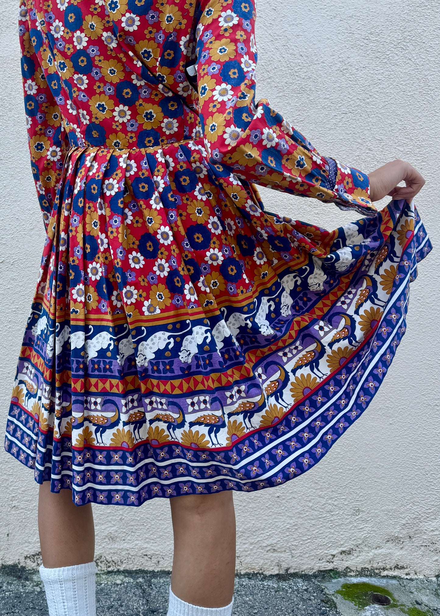 Lions and flowers and peacocks... oh my! Dig this midi pleated dress with a far out print on 100% cotton fabric. The pointed collar and button-front bodice give it a crisp, tailored feel up top, while the finely pleated skirt adds movement and drama with every step. Long sleeves with softly structured cuffs balance the storybook print, making it feel equal parts polished and whimsical. With its delightful details, this is the kind of dress that does all the talking!