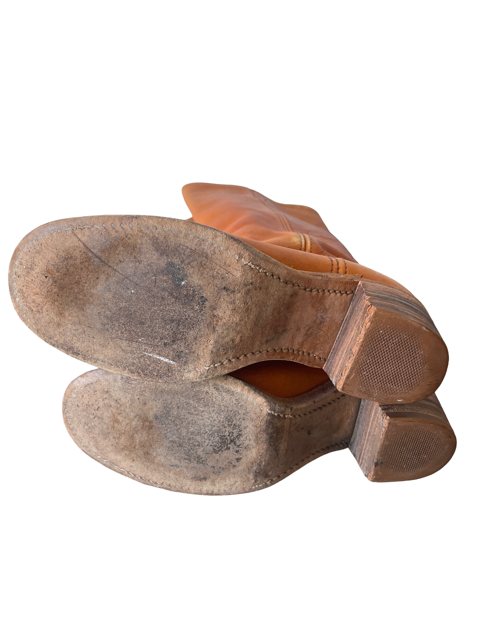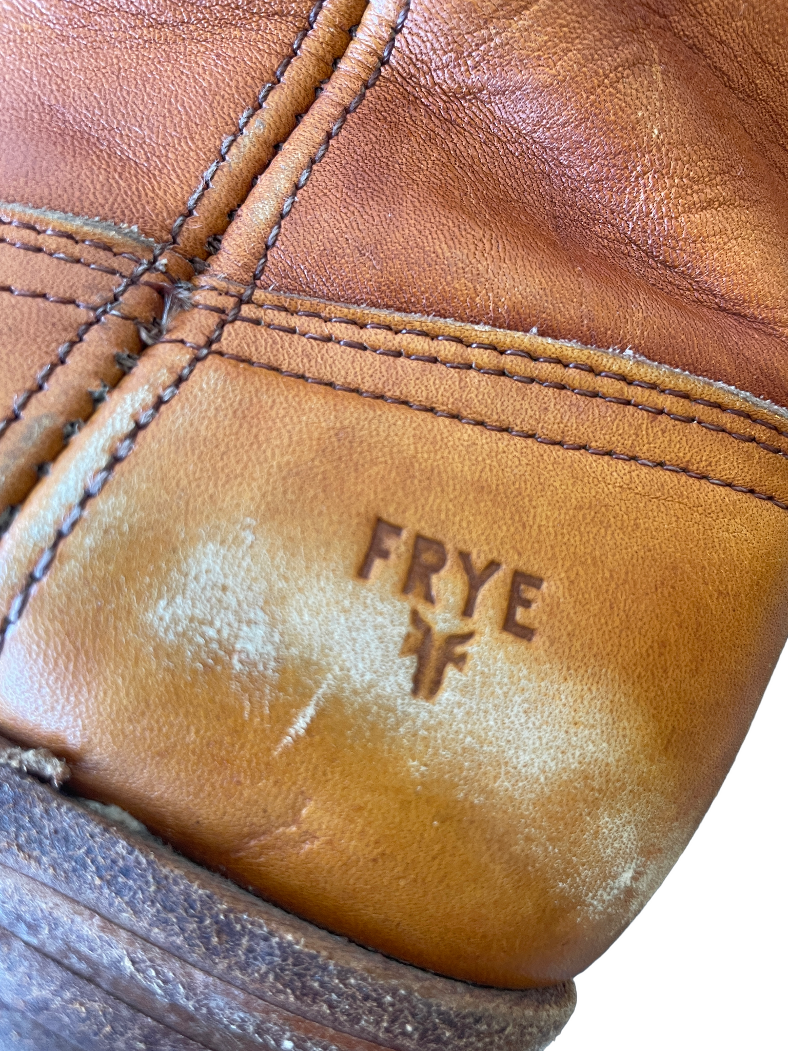 THE iconic long boots from Frye! Vintage from the 70's and bench crafted in a rich brown leather, they feature a super soft and buttery leather. Classic and timeless design, these will be the most comfortable pair of boots you ever own! These charming boots even feature the previous owners name penned on the inside! Great piece of history! Boots are in good condition and have some light scuffs and signs of wear. Still lots of life and many more outfits to complete! Made in the USA.