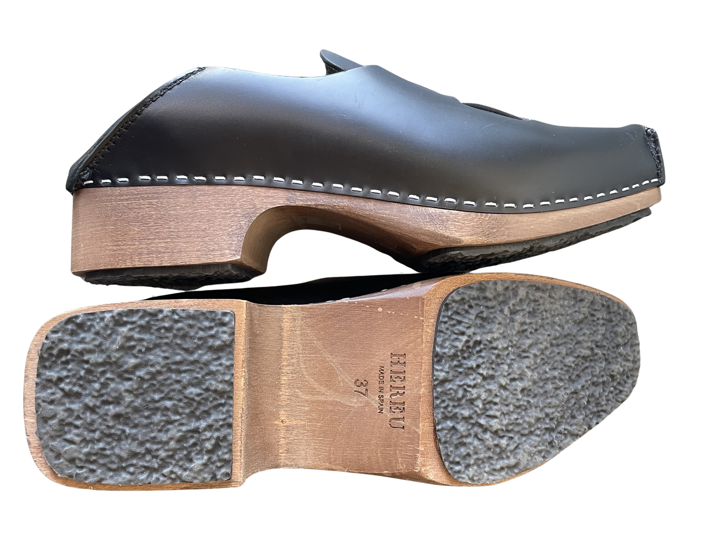 Hereu Black Leather Clogs, Size 37. Sculptural black leather clogs with a modern, woven detail and softly squared toe. Smooth, structured leather upper with an open back and natural wood footbed stamped “Made in Spain.” Minimal, architectural, and quietly statement-making.