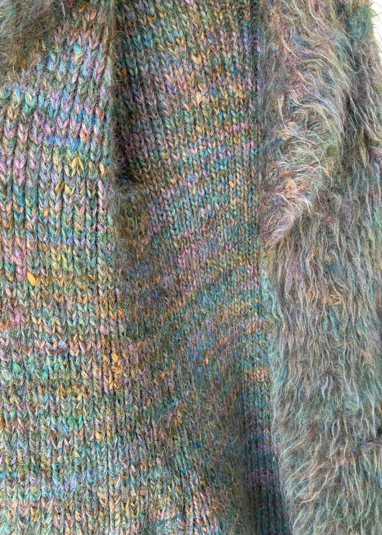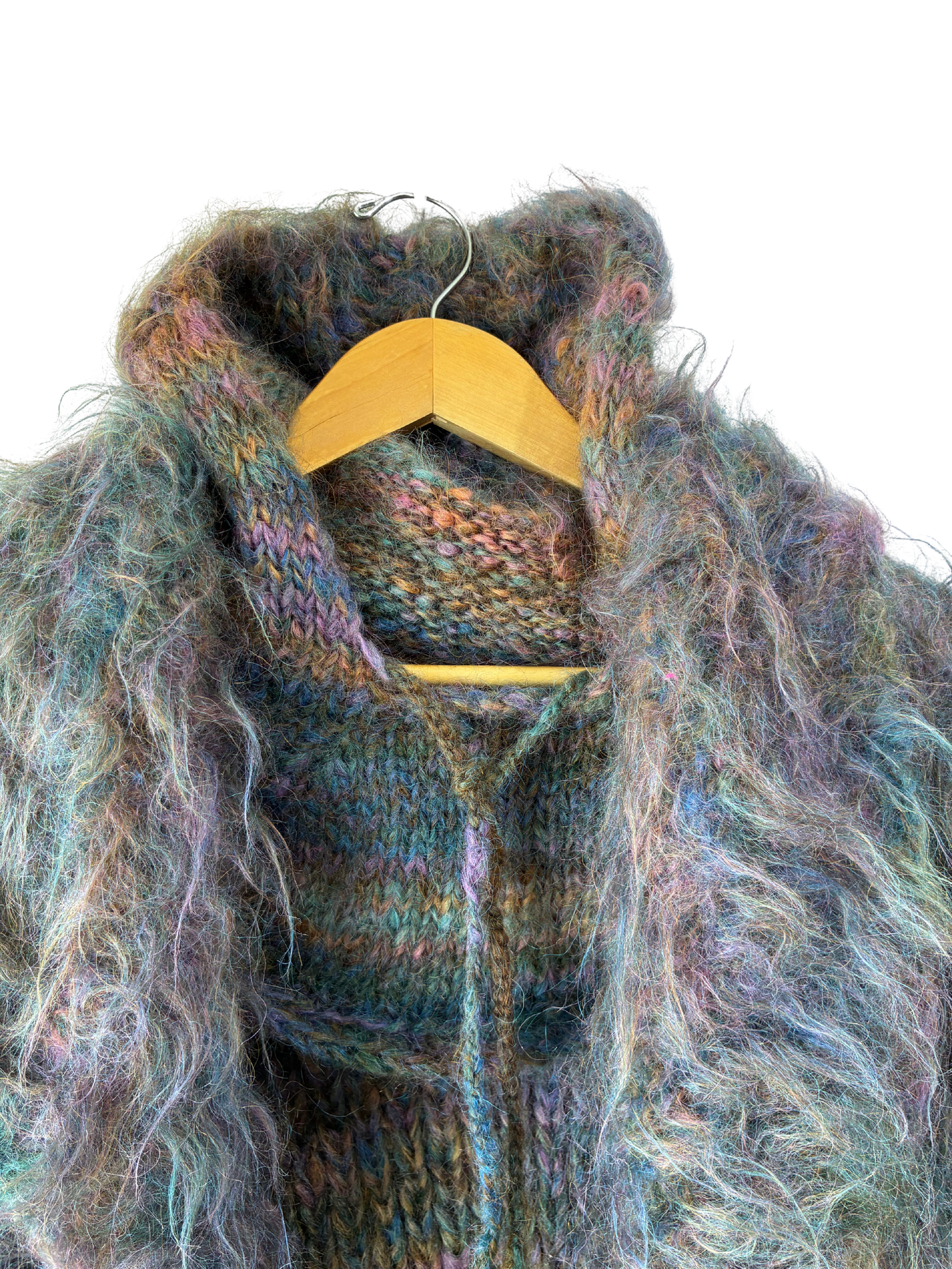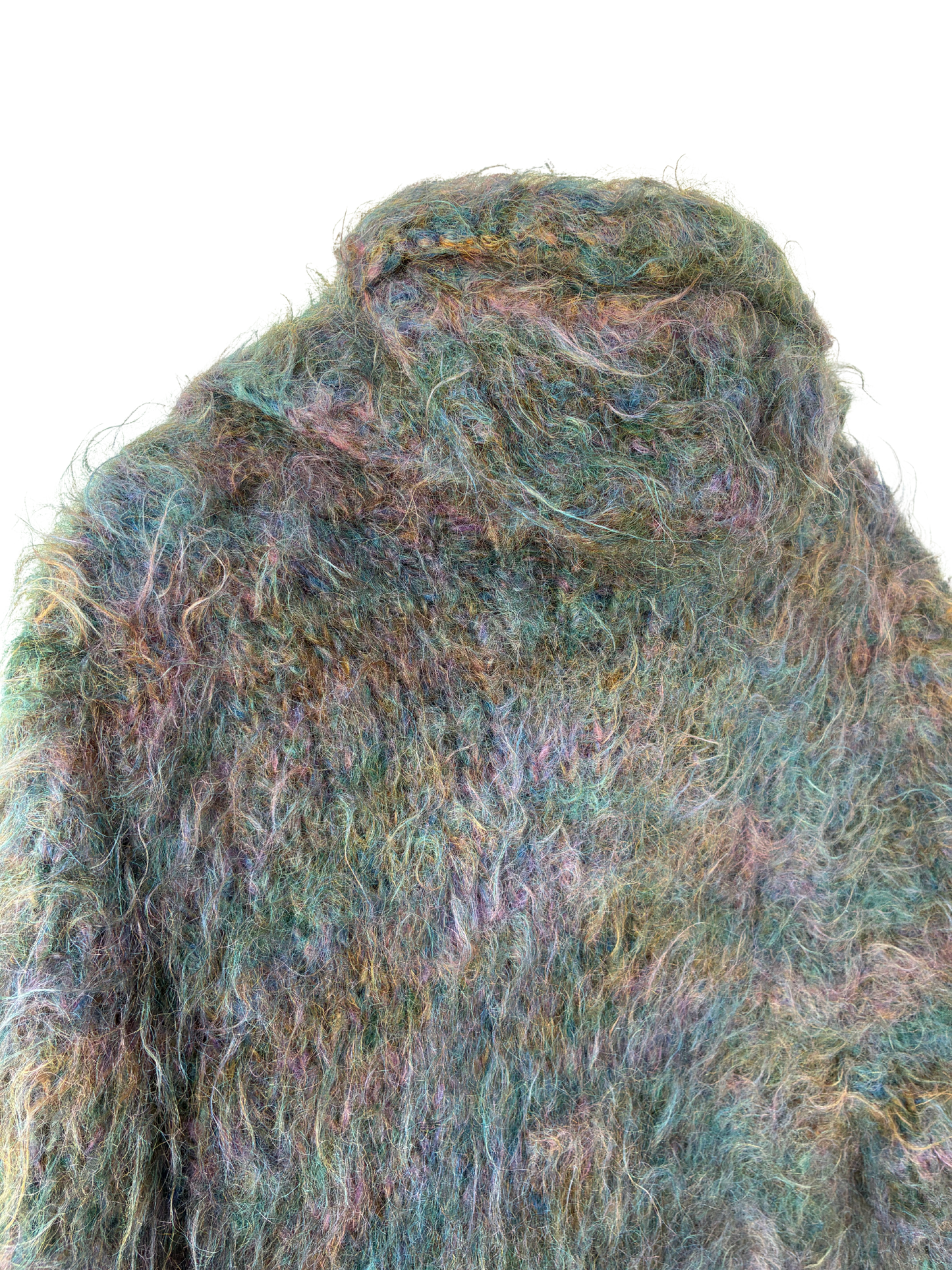 Wild, weird, and completely wonderful. Oversized in all the right ways, with a mottled ombré purple mohair knit and crochet lining peeking from within. The detached balaclava-style hood takes it fully into statement territory. Equal parts cozy armor and work of walking art.