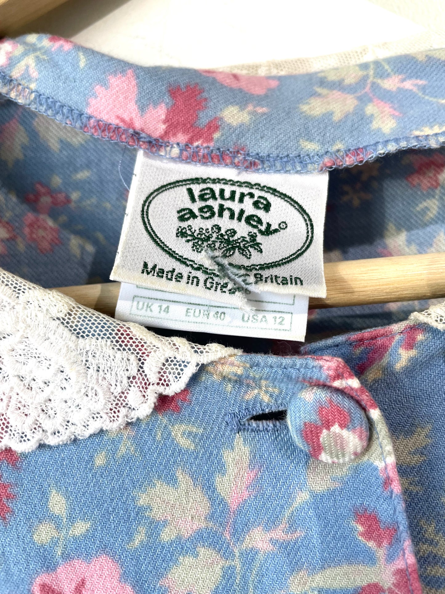 Laura Ashley Blue and Pink Floral Dress, Fits M-L best. Vintage size labeled US 12. A blue floral dress sprinkled with pink blooms and finished with a sweet white lace collar. Fabric-covered buttons down the front, long sleeves with button cuffs, and a waist tie at the back for an adjustable fit. There is some subtle padding at the upper bodice (between the collar and the shoulders). Flowy midi length with that classic Laura Ashley romance. In lovely vintage condition. Made in Great Britain.