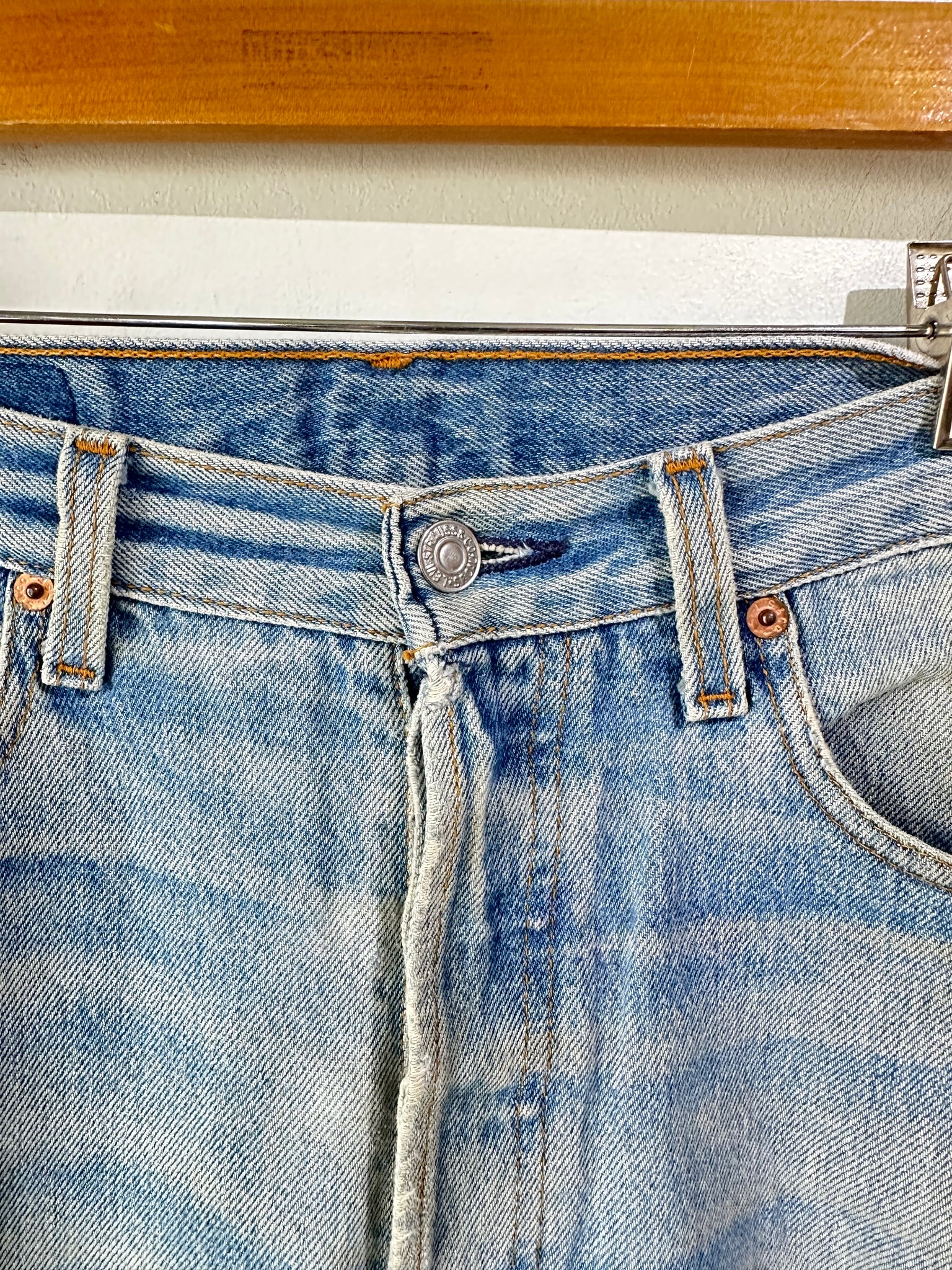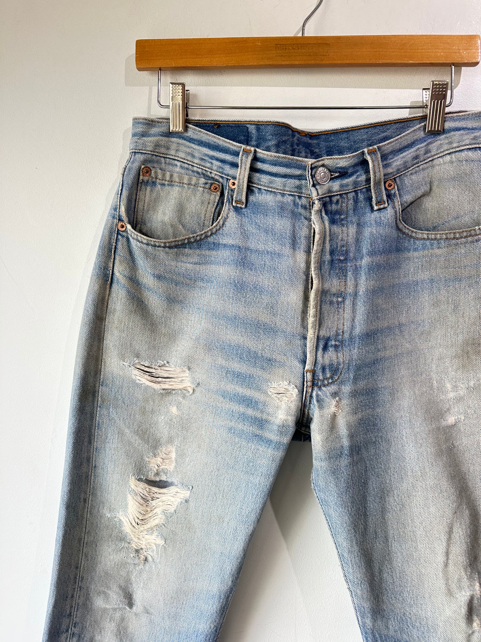 The classic Levi's 501. An iconic style, the 501s are known for their straight leg, relaxed fit, and mid-rise waist. The durable denim of this style is designed to have a unique fade and mold to the wearers body, which we think is pretty cool. This distressed pair in a light wash adds to the old school, authentic style that is the 501s.