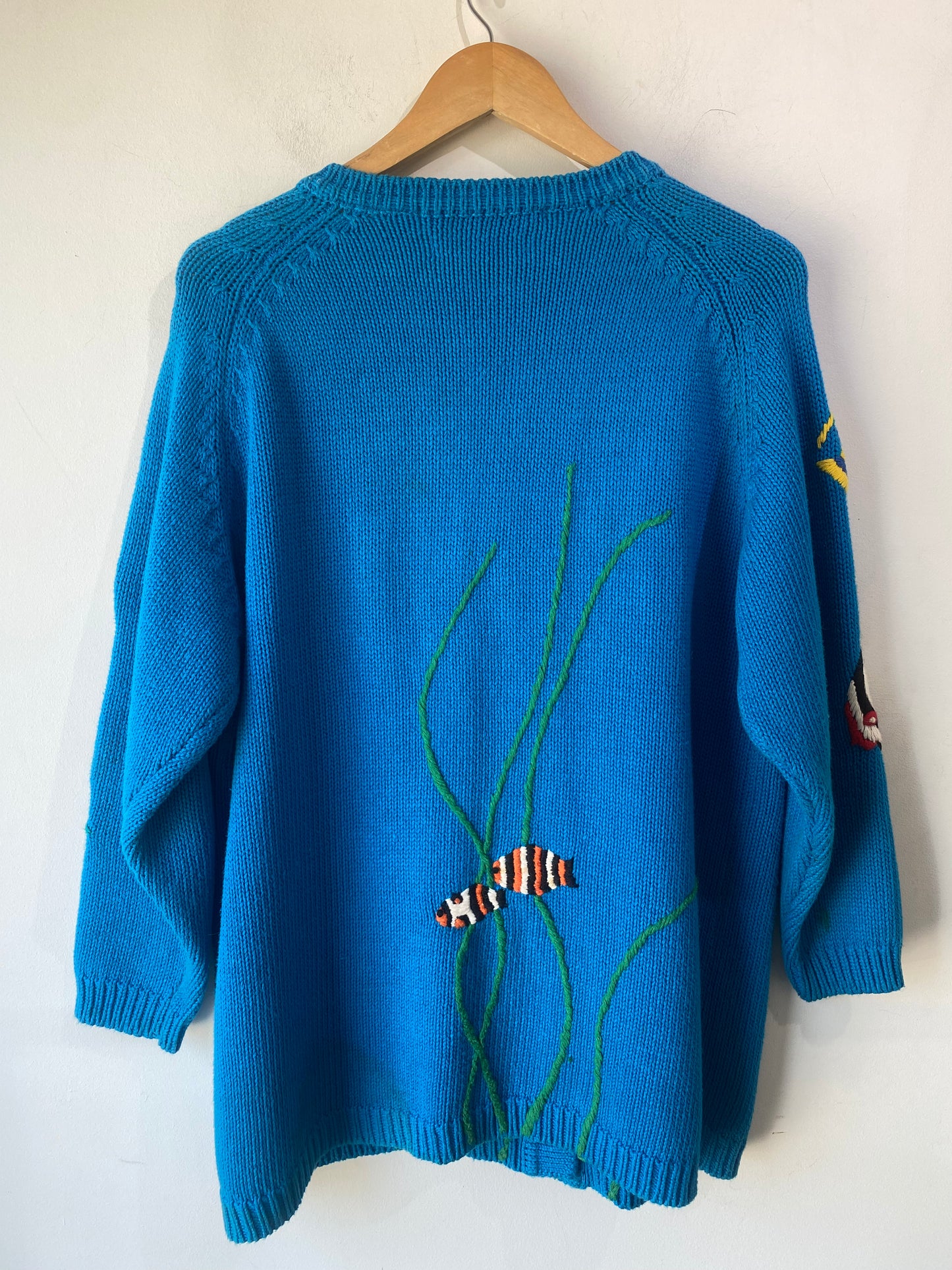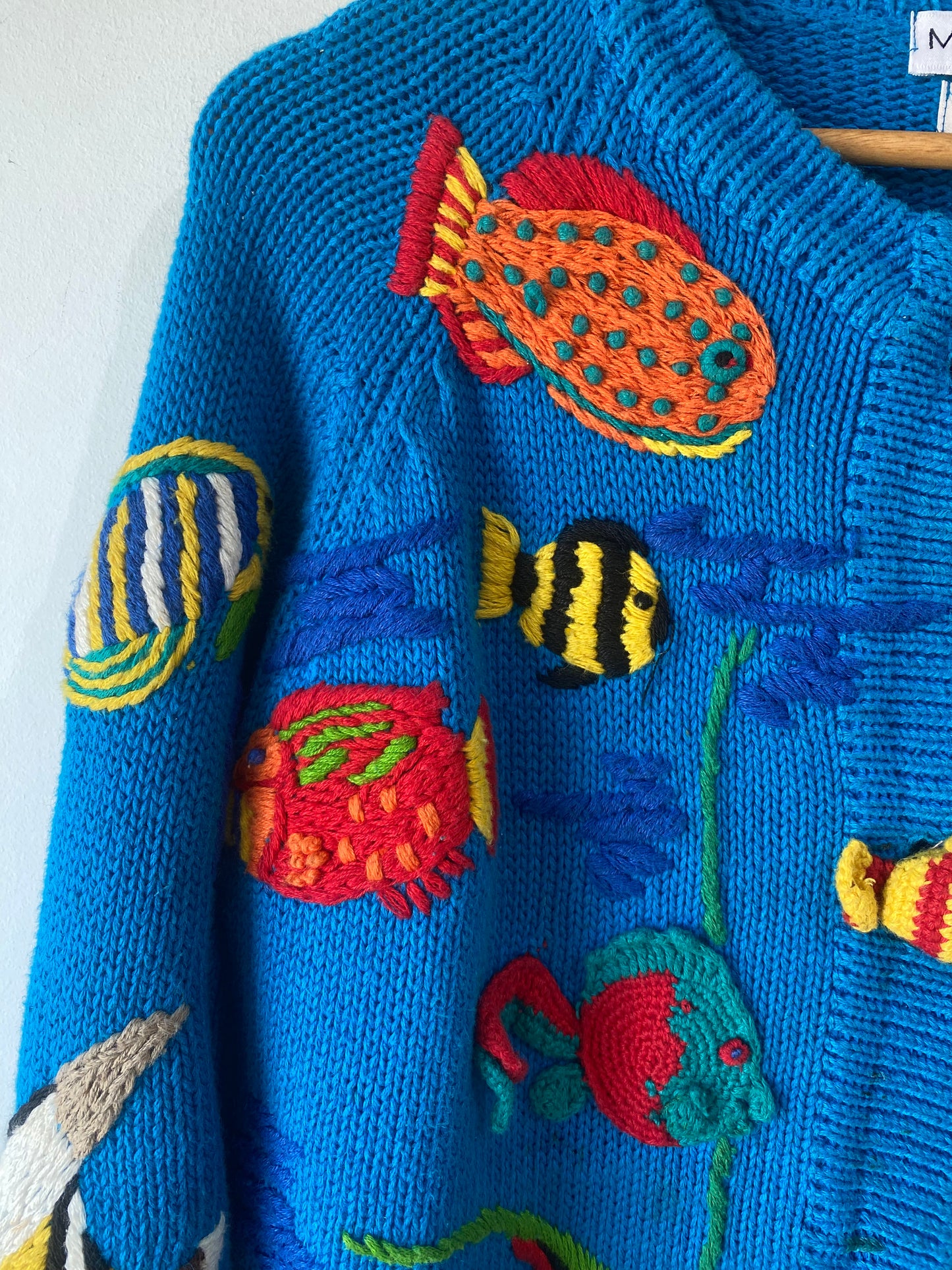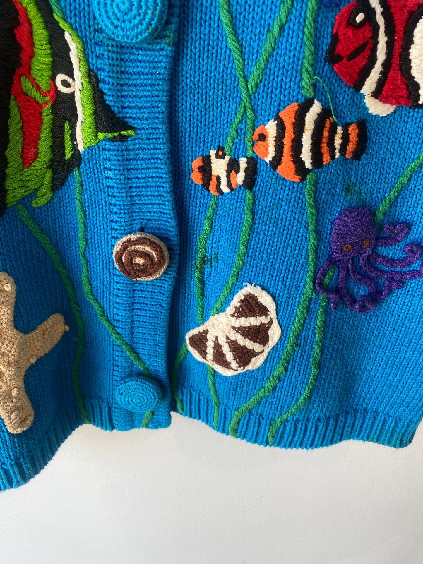 Equal parts charm and conversation piece, this aqua knit is teeming with embroidered and 3D crochet sea life, finished with delightfully under-the-sea buttons. A little kooky, a lot fabulous, and fully committed to the bit. Very kindergarten teacher core in the best possible way. Wear it and prepare to make waves. Sold as-is, please refer to condition notes below.