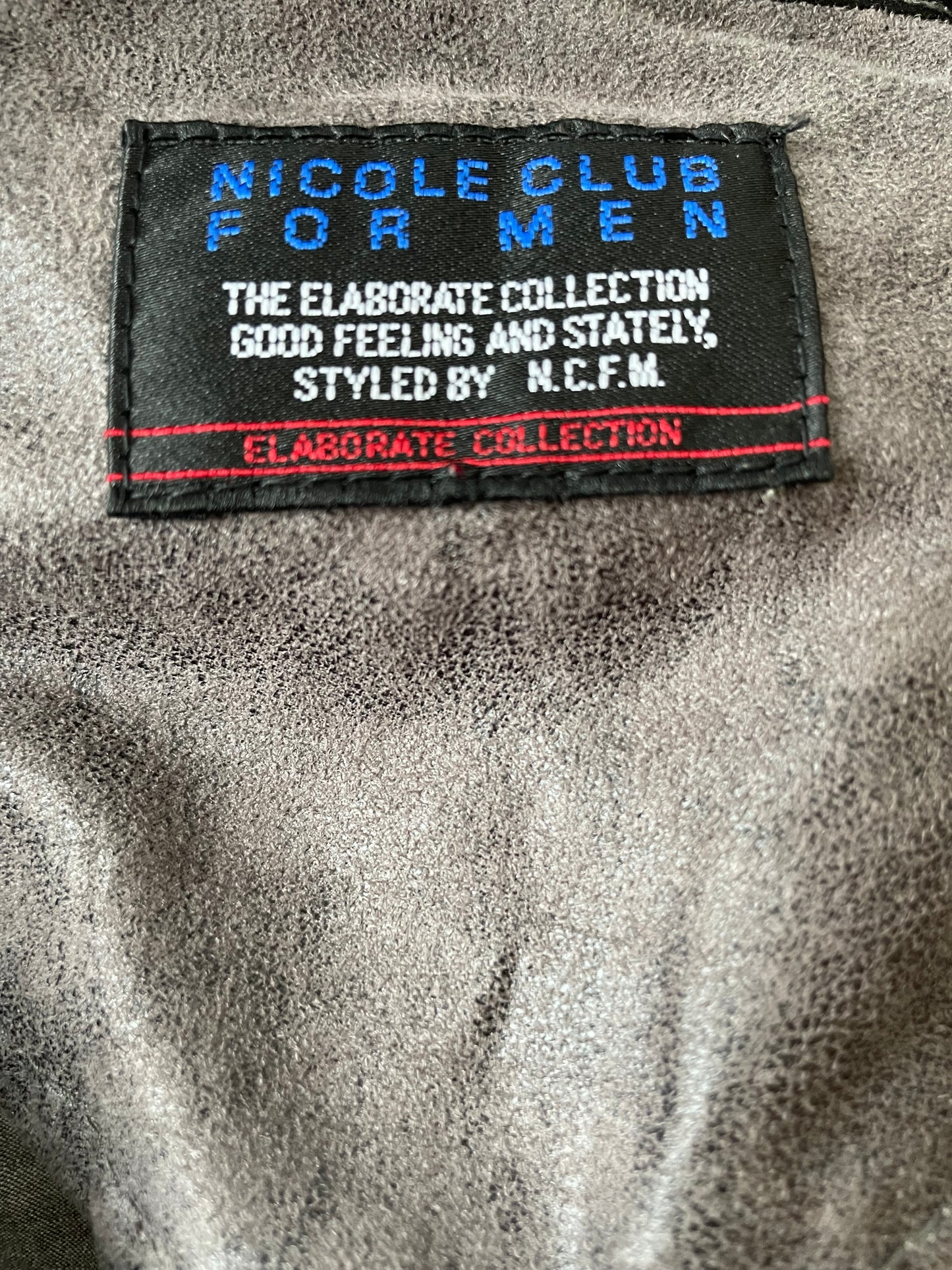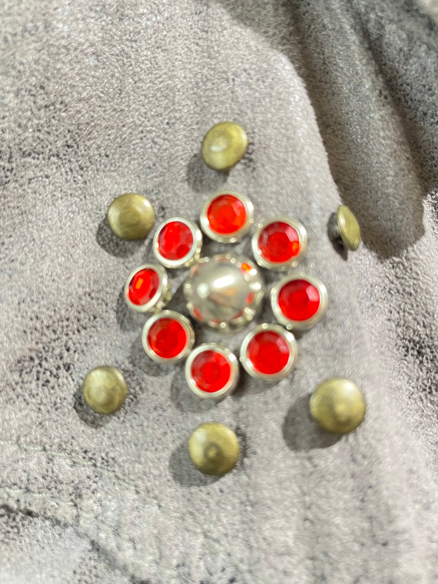 Nicole Club for Men Grey Embellished Shirt, fits like Men's S/Women's M. Super-soft, suede-like grey short-sleeve shirt with snap front and red, silver, and gold stud detailing across the chest and shoulders. Enjoy the western vibes from this Japanese menswear brand.