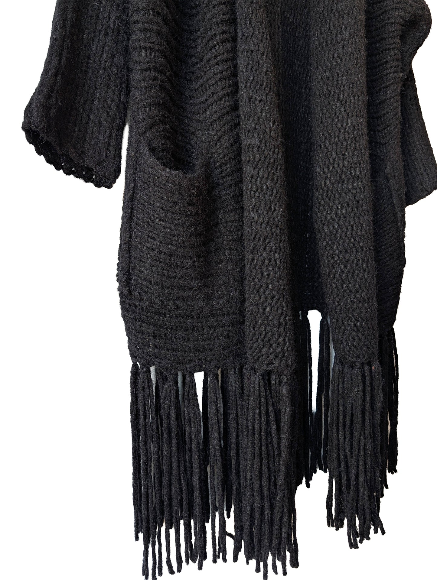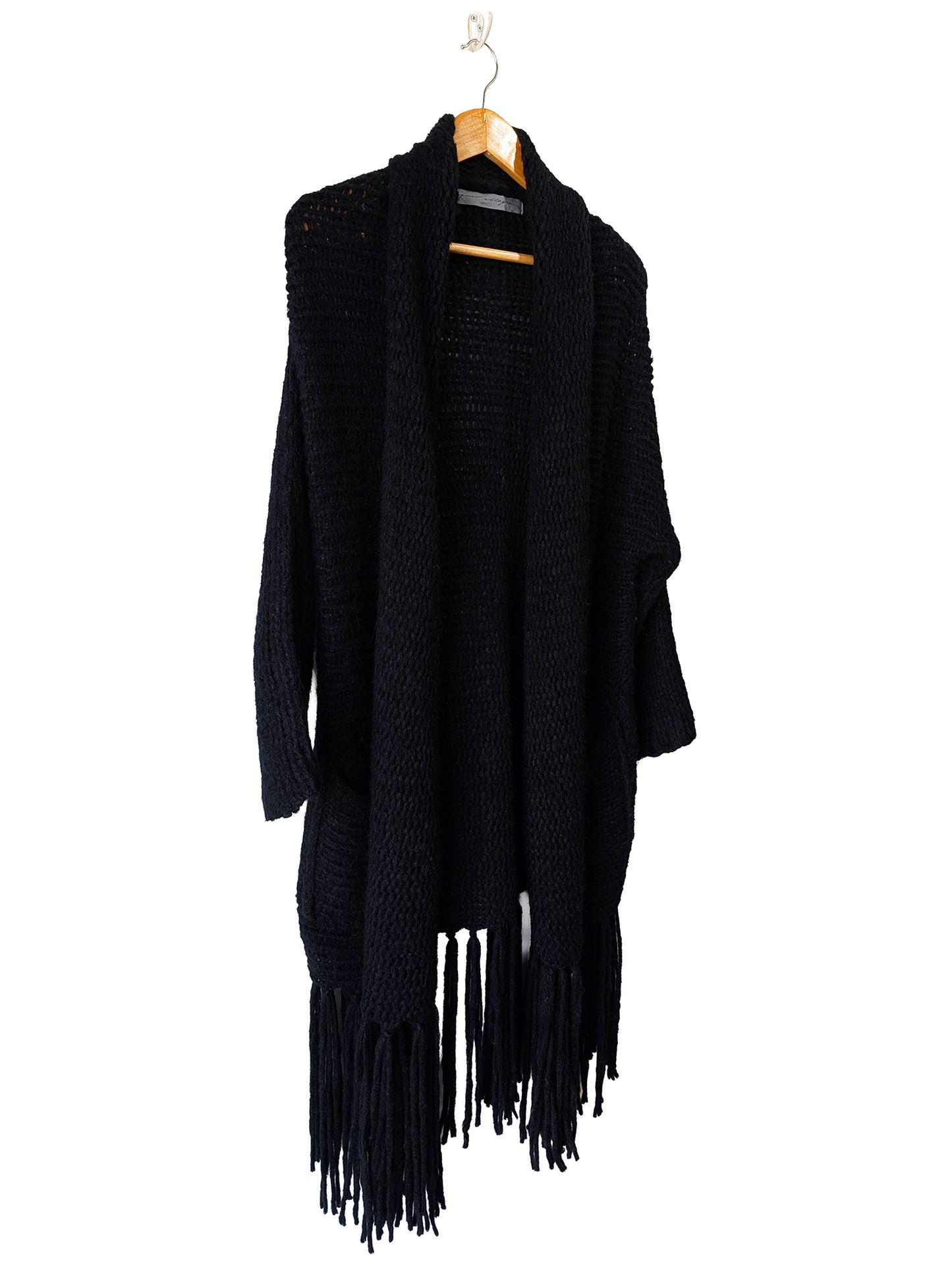 This black Raquel Allegra alpaca cardigan has both a laid-back attitude and a serious flair moment: soft, slouchy knit with very long fringe that sways when you do. Equal parts cozy and rock-star, it's perfect for late nights and main-character errands (toss a small wallet in those pockets and go!). Sweater is in excellent condition.