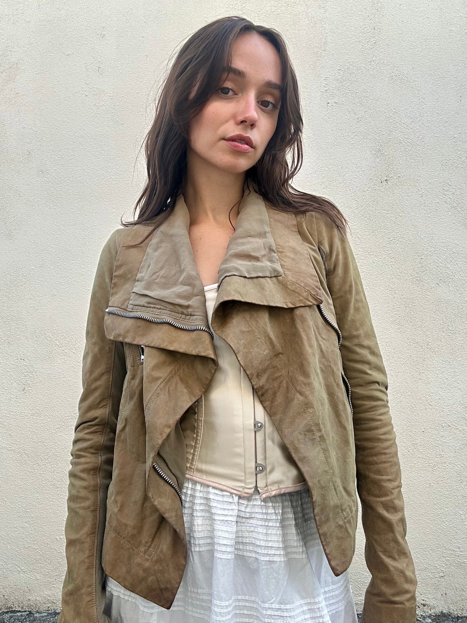 The Rick Owens Tan Leather Jacket is not your average leather jacket; peep the ribbed knit on the inner sleeves, three zip pockets, and the off center main zipper. It's slim, it's sleek, and totally giving 2000's revival in the absolute best way, especially paired with skinny jeans and knee high boots. Made from 100% calf leather, the ribbed knit is made from 100%, the back and sleeve lining is 100% rayon, and the front lining 100% silk. Perfect condition.