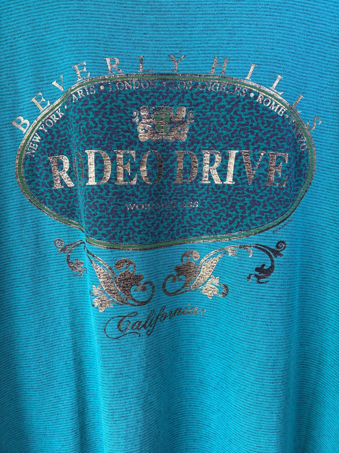 Vintage Rodeo Drive Aqua Tee with a subtle grey stripe and unapologetic gold-foil flex. Leopard accents, crests, and fleur-de-lis pile on the drama in the most Beverly Hills way possible-luxury’s louder cousin. Feels like a souvenir from a champagne afternoon on Rodeo Drive in a bygone era with just enough flash to let everyone know you’ve arrived (in L.A. for vacation).