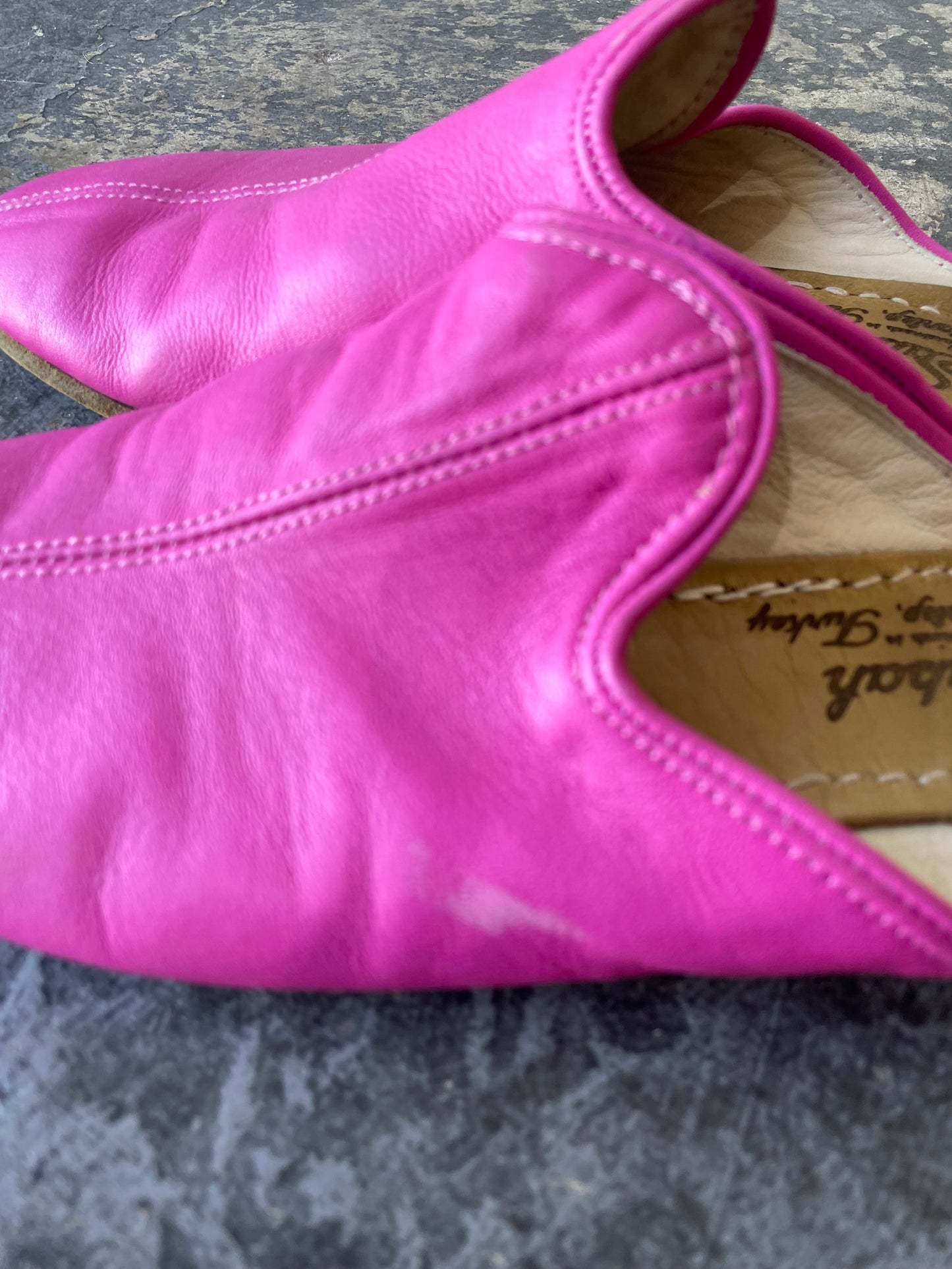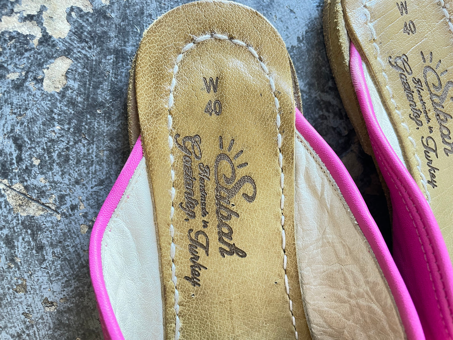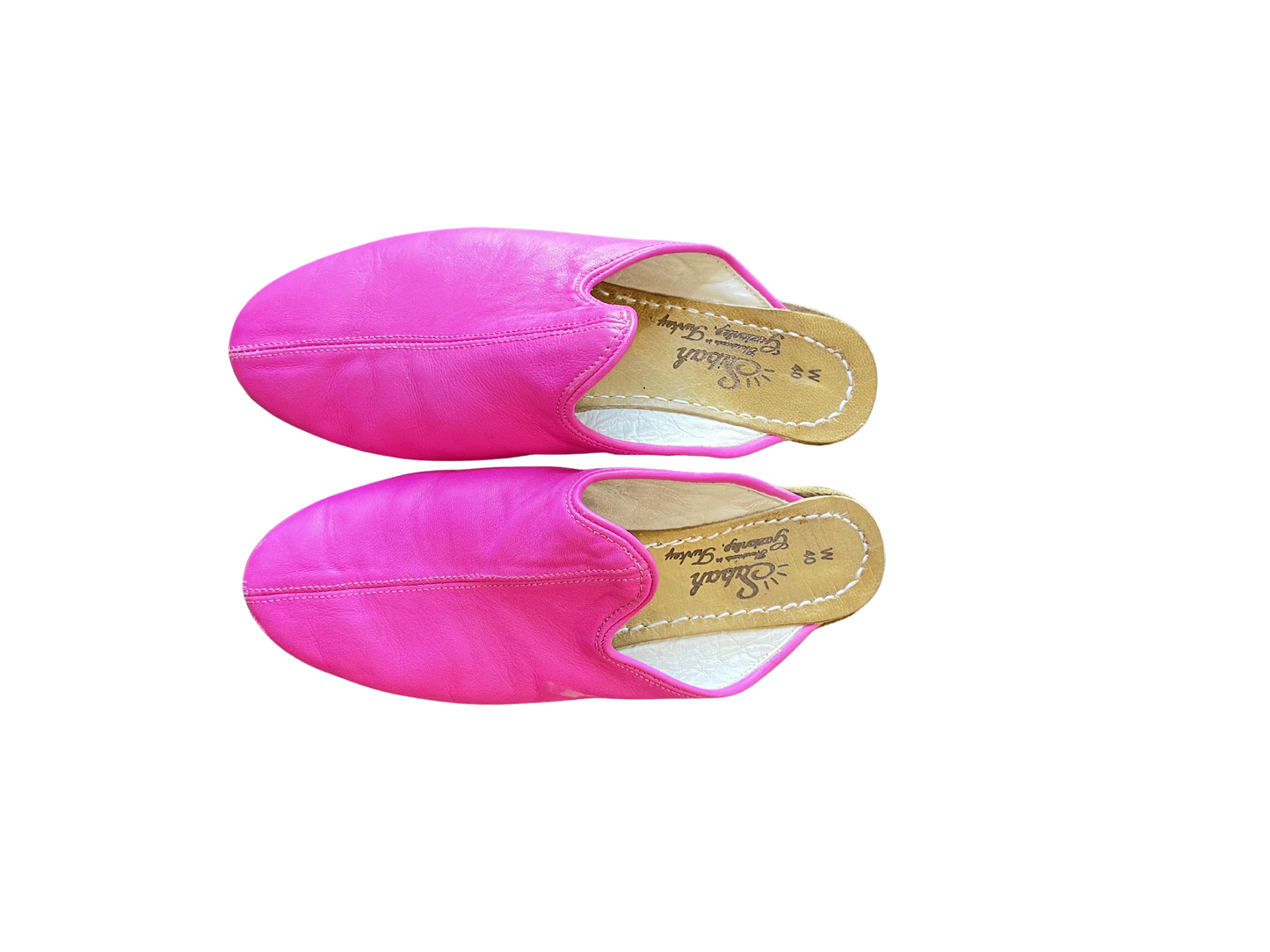 Sabah Pink Leather Slides, Size 40. Buttery leather in the happiest shade of hot pink, with a center seam and soft, glove-like feel. Easy slip-on mule shape with a leather footbed. Equal parts laid-back and look-at-me. For when your outfit needs a little main-character energy, starting from the ground up. Handmade in Turkey.