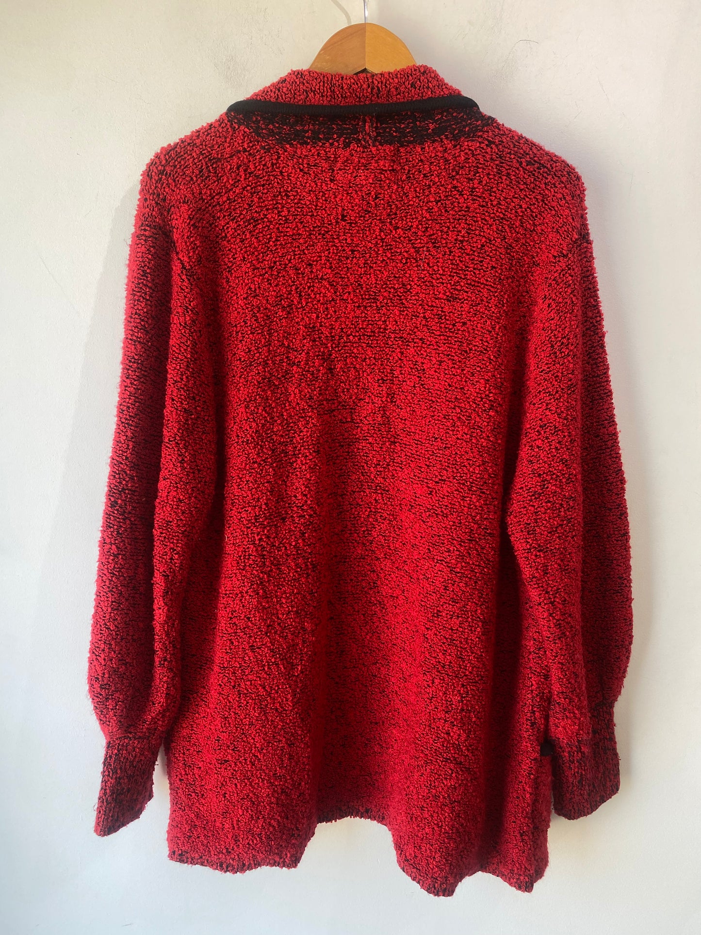 The kind of cozy piece that makes getting dressed feel almost too easy. Red mottled knit with black nubby chenille, a soft shawl collar, and the best part: it drapes right into pockets. Like your favorite robe, but much more socially acceptable.