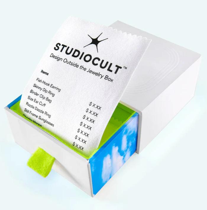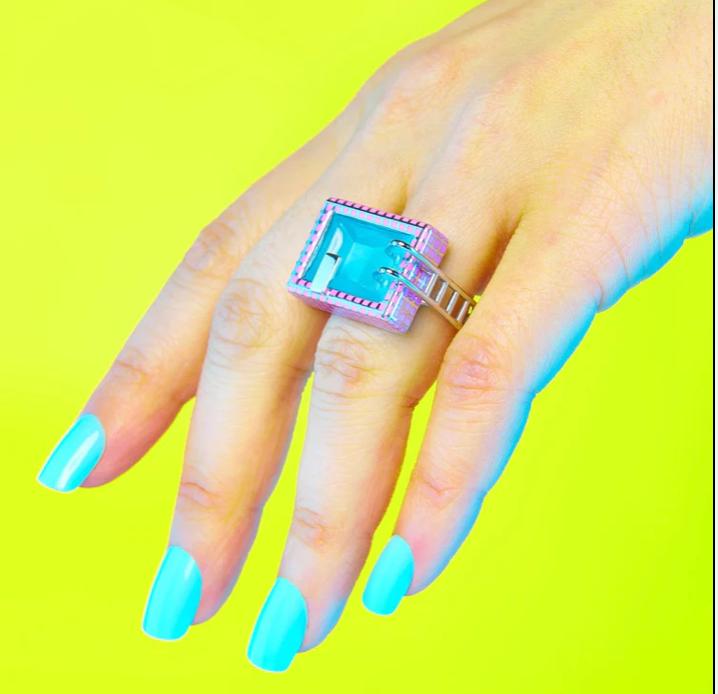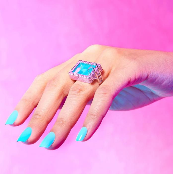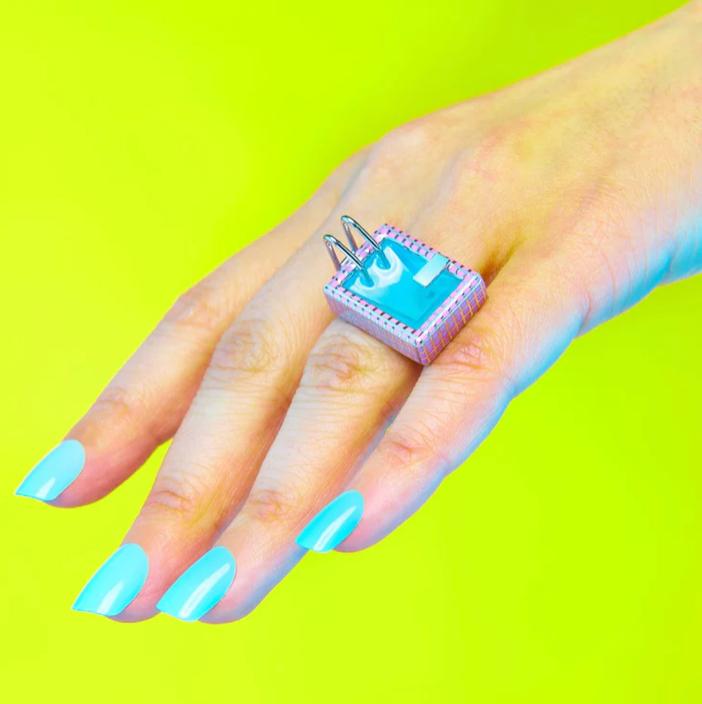This ring is summer camp, Palm Springs, and a design fever dream—all in one tiny architectural moment. Studio Cult’s Skinny Dip Ring turns a classic pool into wearable pop art, complete with ladder, tiled sides, and glossy aqua “water” you’ll want to dive into immediately.