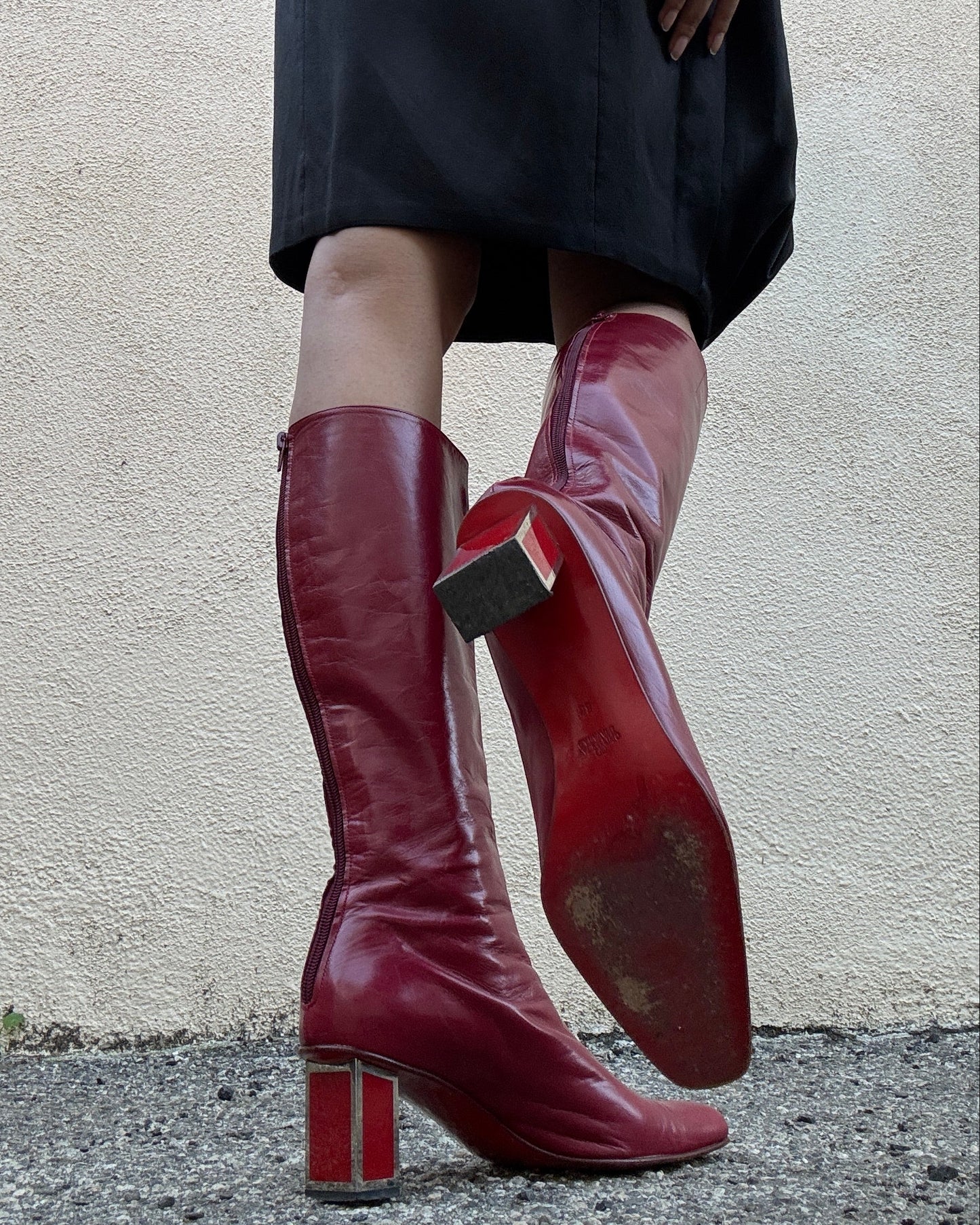 The all over red makes these Valentino knee-high boots the ultimate power move. Made of genuine leather featuring a silver metal heel and pointed square toe, every step you take in these bad boys is intentional. The boots hit just below the knees and are zipped at the back. In excellent condition, the only signs of wear appear on the bottom of the soles.