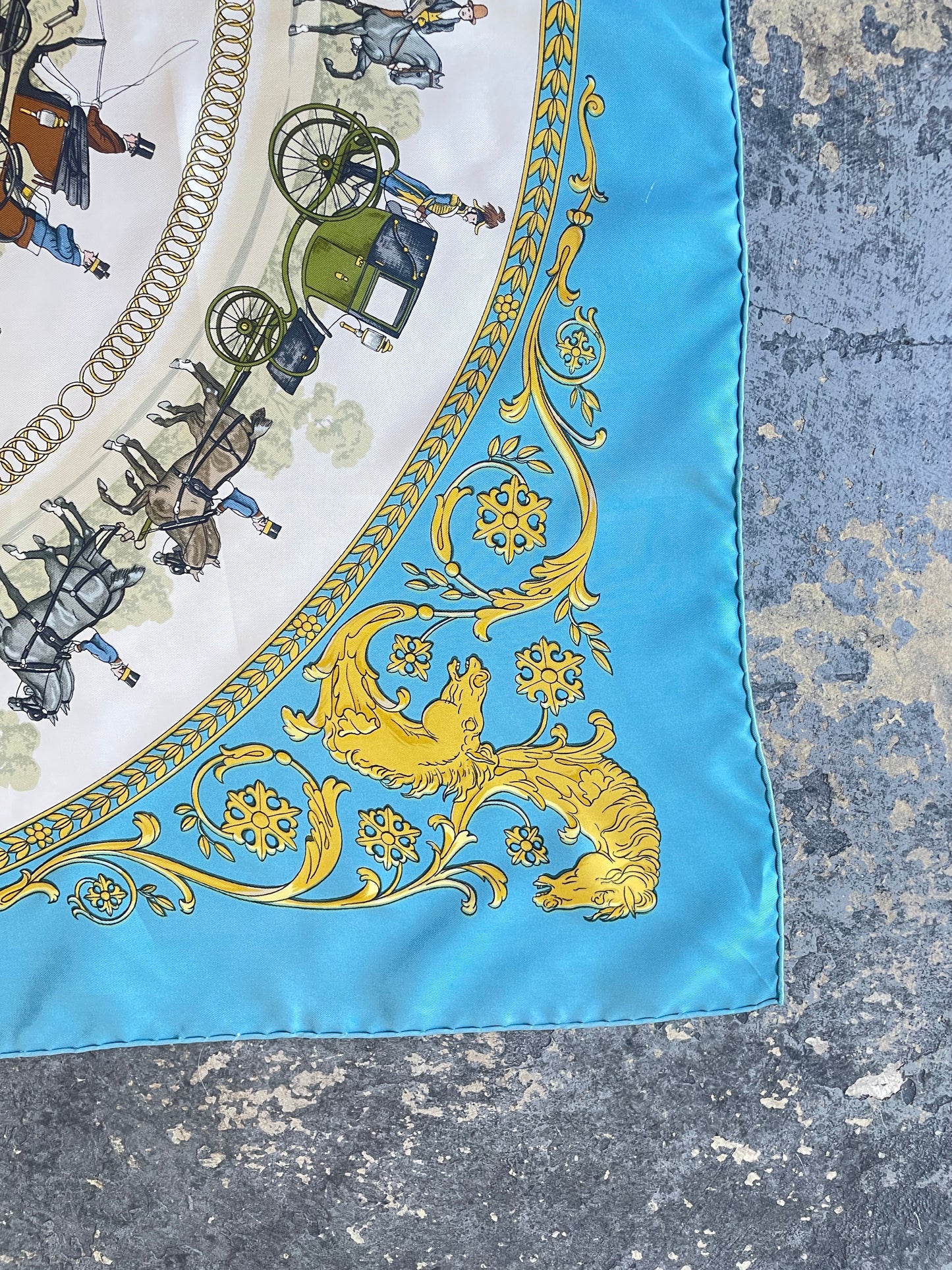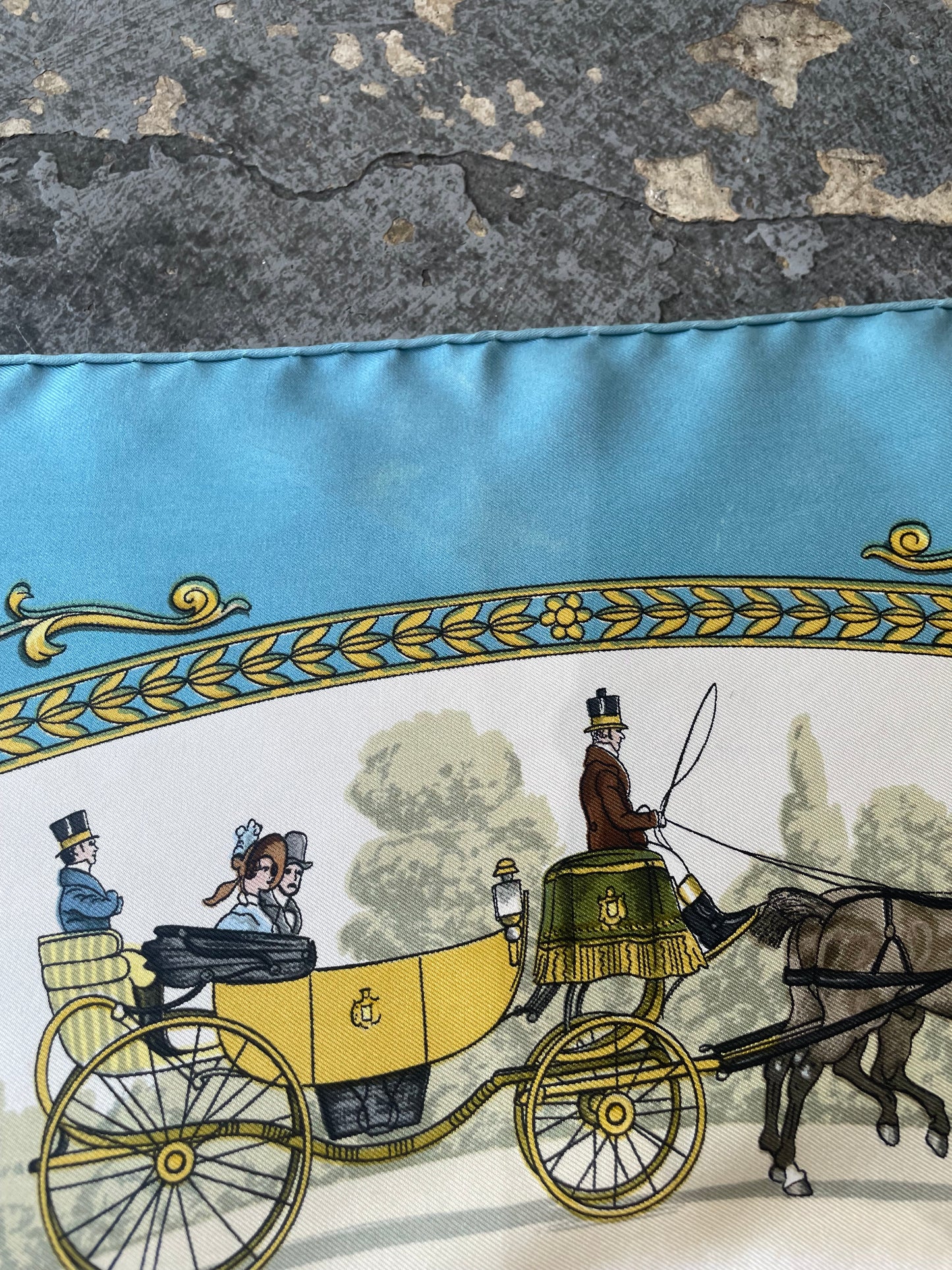 Hermès “La Promenade de Longchamps” Blue Silk Scarf by Philippe Ledoux. Classic Hermès carré featuring horse-drawn carriages in motion, framed by ornate golden scrollwork on a sky-blue border. 100% silk with hand-rolled edges, measuring approximately 35 x 35 inches. Beautiful condition with crisp color and minimal signs of wear.