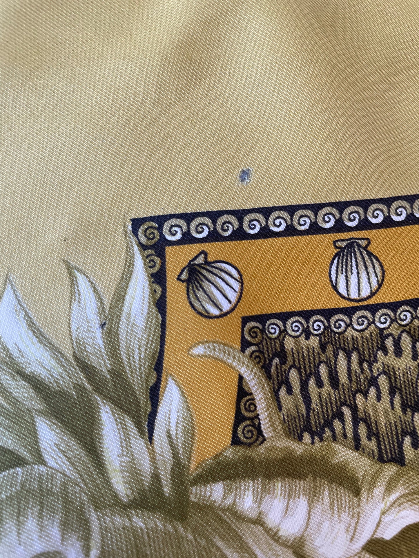 Hermès “Grotte de Versailles” Yellow Silk Scarf by Maurice Tranchant. Vintage Hermès carré in a rich golden-yellow tone featuring the baroque grotto motif at Versailles: horses, fountains, ornate scrollwork, and symmetrical framing. Designed by Maurice Tranchant and first issued in 1969. 100% silk twill with hand-rolled edges, measuring approximately 35 x 35 inches. Sold as‐is with slight vintage wear visible in photos, which is reflected in the price.