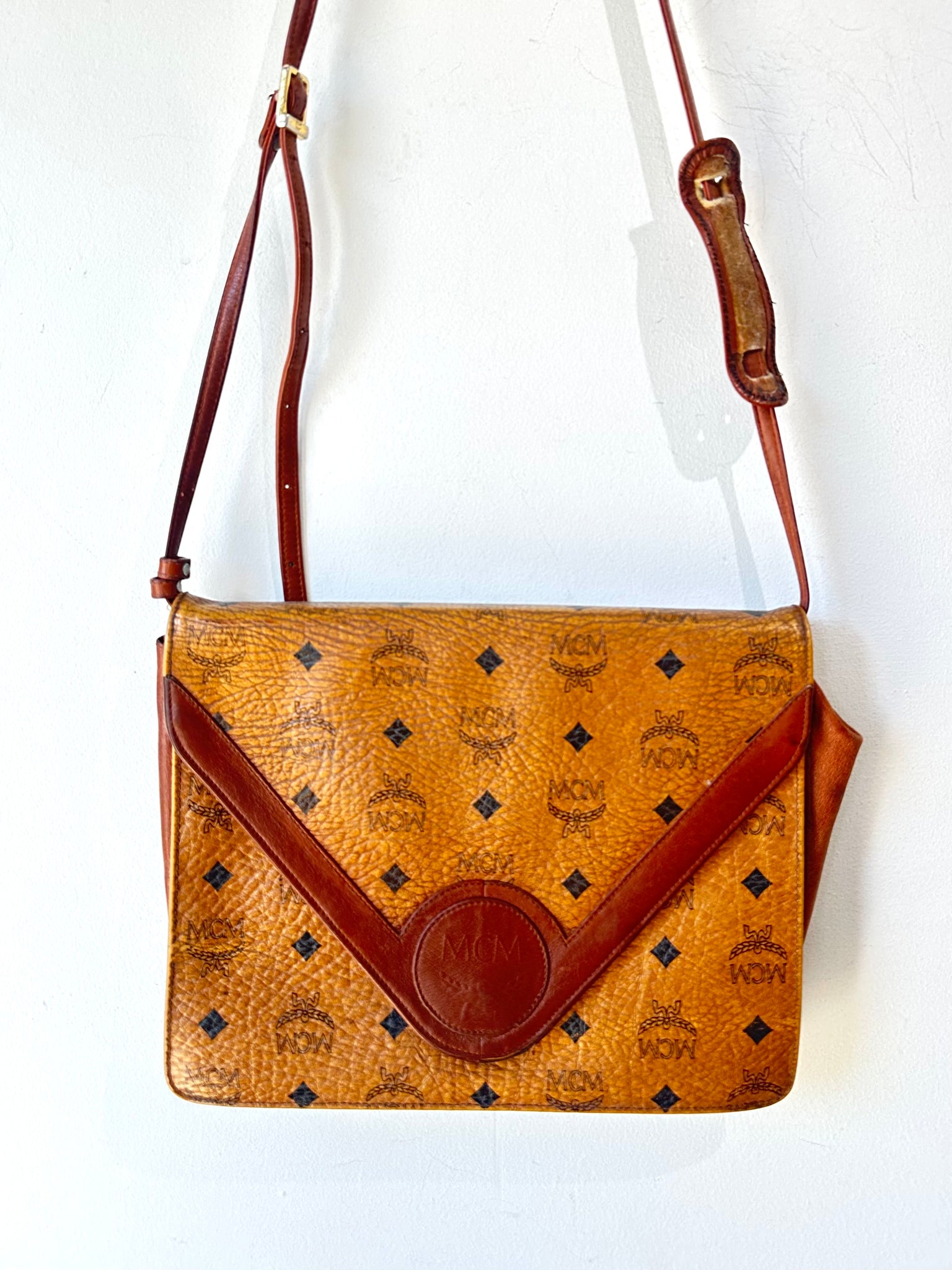 Vintage MCM Crossbody Purse in a camel leather with brown trim, a button snap closure, and adjustable length strap. With two interior pockets, one with a zipper and one without, this purse is both functional and classic. Great condition, some minor fraying at the seams on the strap, front trim, and interior lining.