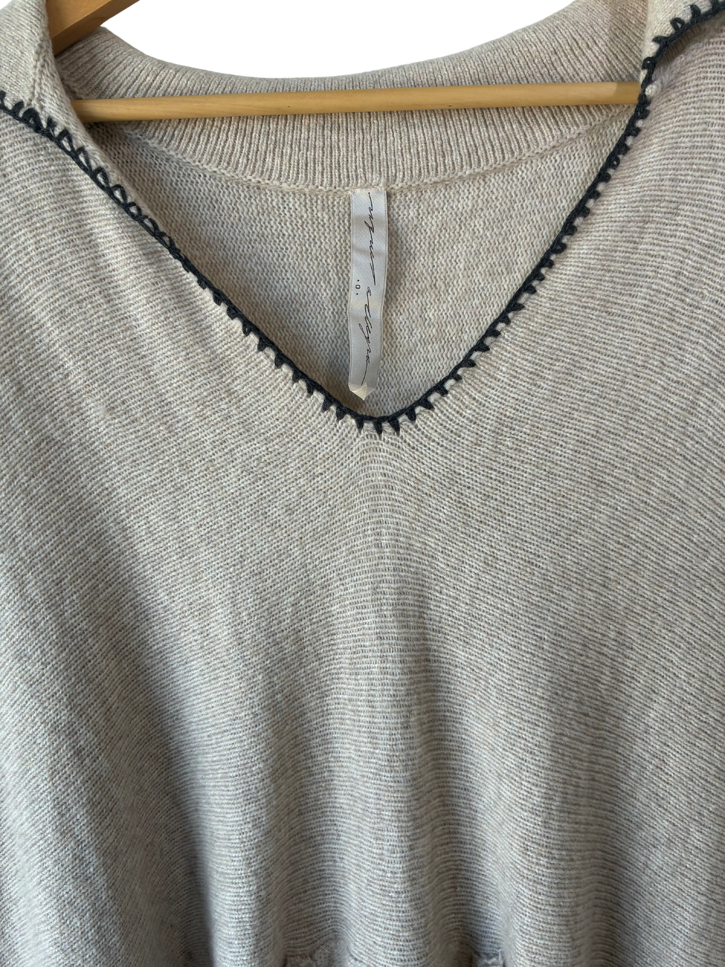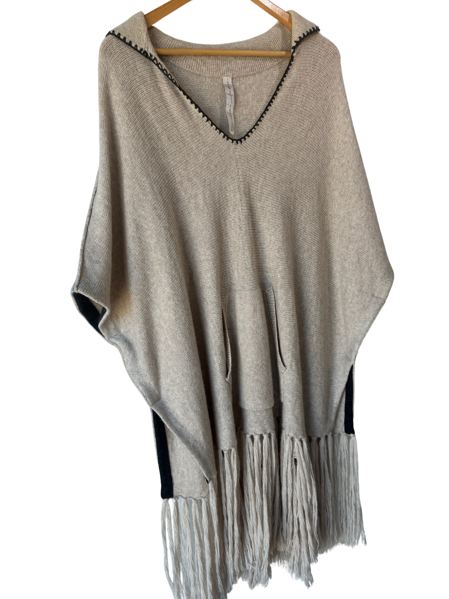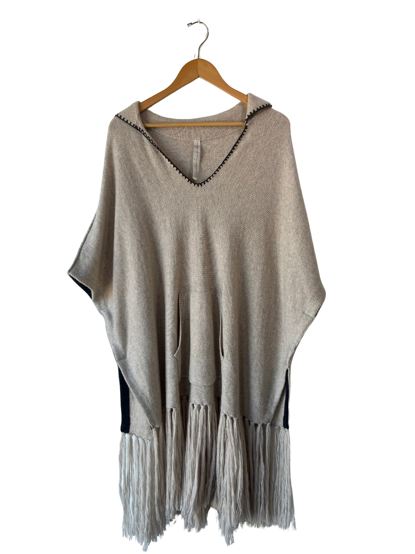 Raquel Allegra oatmeal cashmere-blend poncho that understands the assignment: cozy and cool. A short, swingy silhouette with playful fringe, grey contrast trim, and a kangaroo pocket that seals the deal. Easy, unfussy, and quietly fun. Because comfort doesn’t have to be boring.
