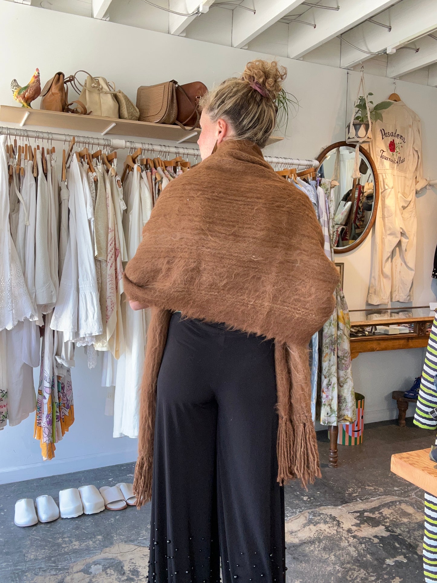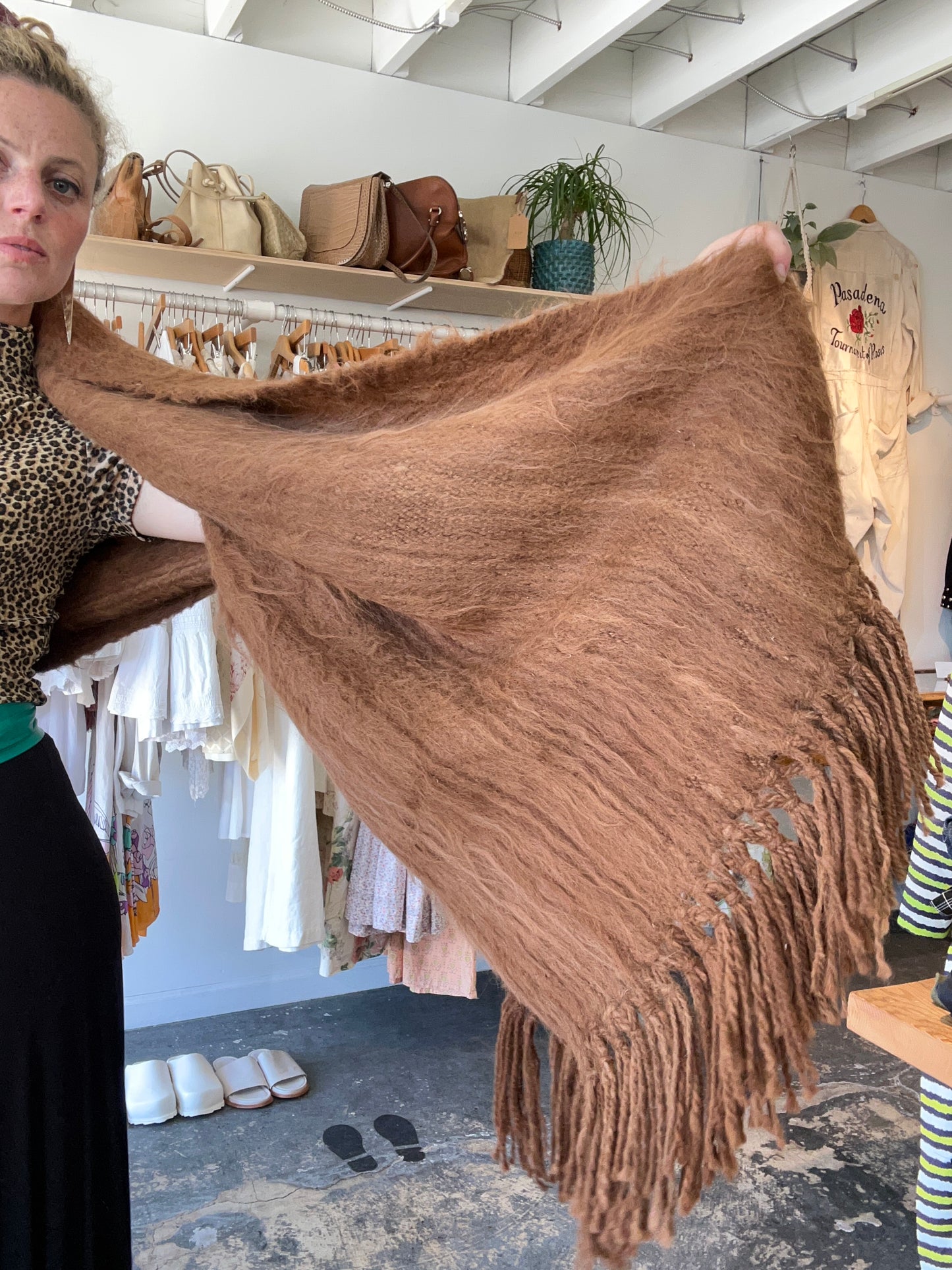 Vintage Brown Furry Alpaca Mohair Scarf. A cozy, full scarf-shawl hybrid in an incredibly soft mohair. Fringe at either end. In good vintage condition.