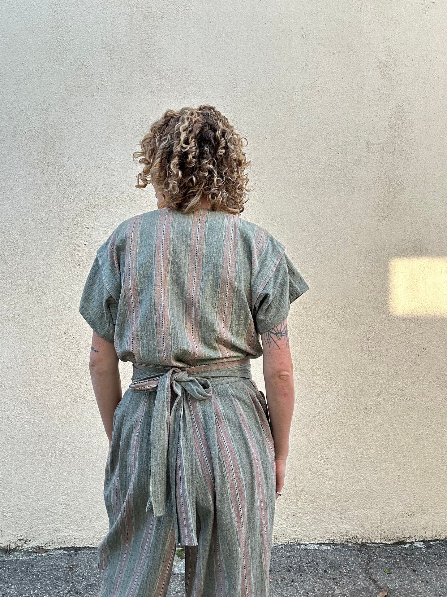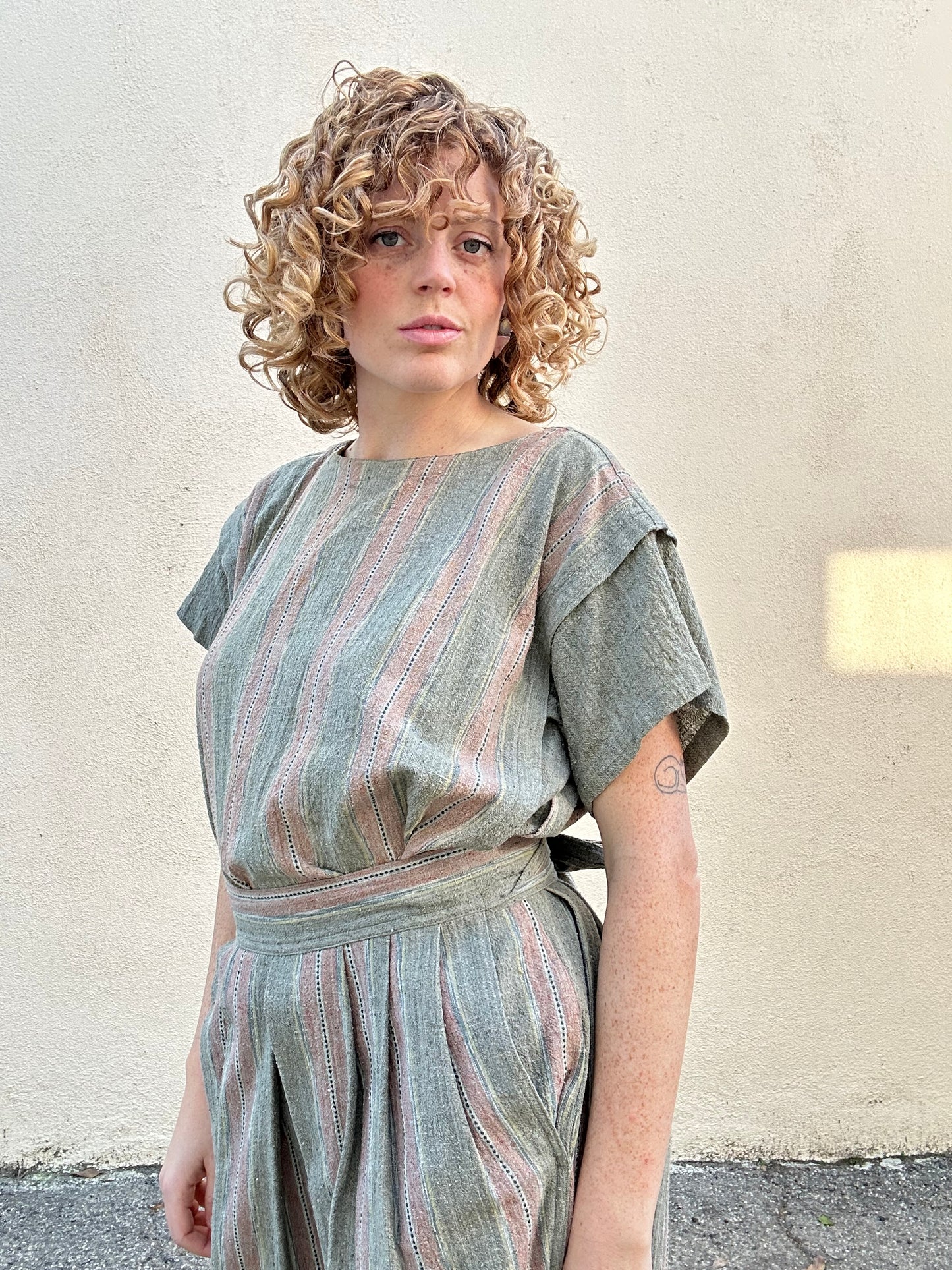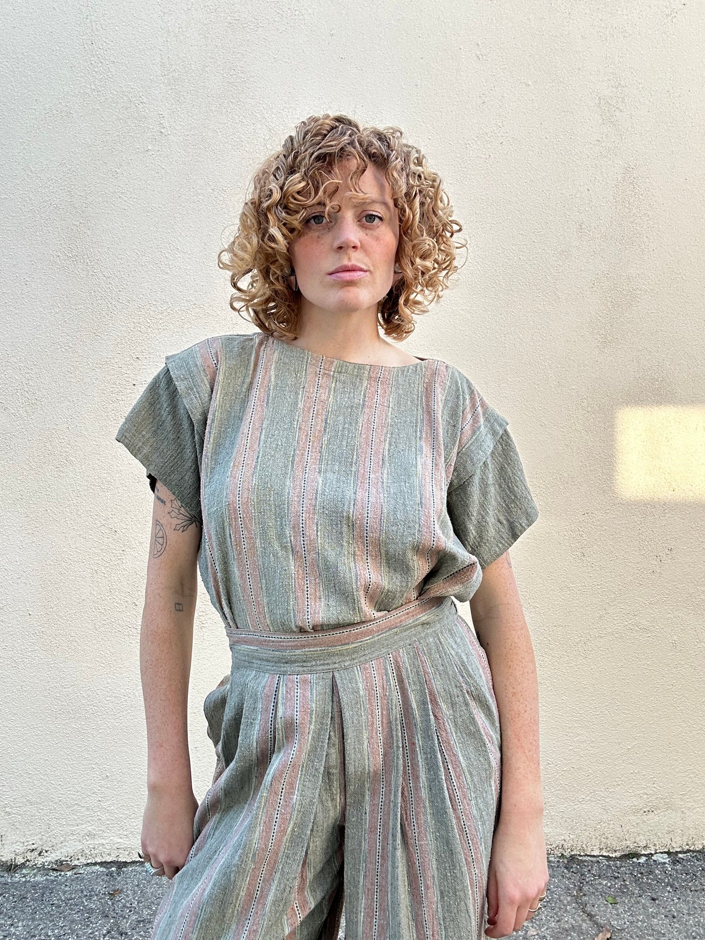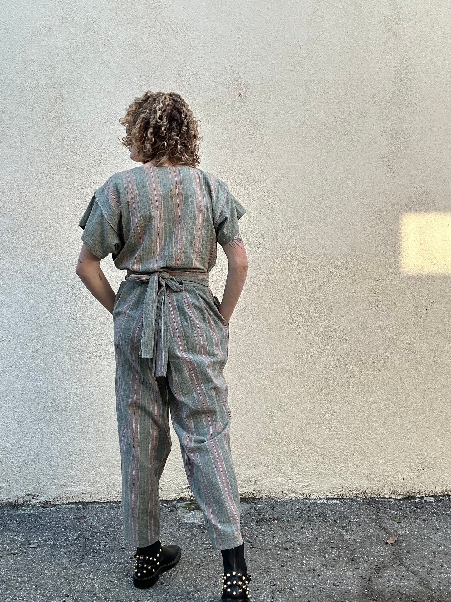 Issey Miyake Plantation Pink Stripe Two-Piece Outfit. This soft striped cotton nubby linen two piece outfit features an architectural caped bodice, while the inverted pleat pants with wrap waist and sash tie ensure a flattering fit. Garments are in very good, gently worn condition and are free of tears, stains and defects.